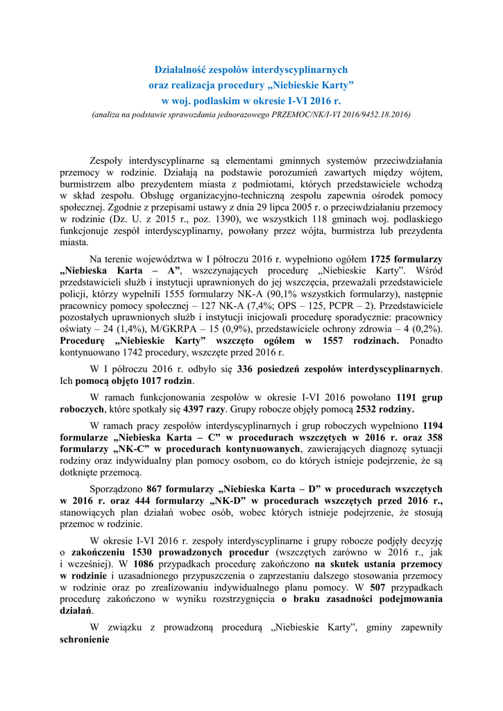 Działalność zespołów interdyscyplinarnych oraz realizacja procedury „Niebieskie Karty” w woj. podlaskim w okresie I-VI 2016 r. (analiza na podstawie sprawozdania jednorazowego PRZEMOC/NK/I-VI 2016/9452.18.2016) Zespoły interdyscyplinarne są elementami gminnych systemów przeciwdziałania przemocy w rodzinie. Działają na podstawie porozumień zawartych między wójtem, burmistrzem albo prezydentem miasta z podmiotami, których przedstawiciele wchodzą w skład zespołu. Obsługę organizacyjno-techniczną zespołu zapewnia ośrodek pomocy społecznej. Zgodnie z przepisami ustawy z dnia 29 lipca 2005 r. o przeciwdziałaniu przemocy w rodzinie (Dz. U. z 2015 r., poz. 1390), we wszystkich 118 gminach woj. podlaskiego funkcjonuje zespół interdyscyplinarny, powołany przez wójta, burmistrza lub prezydenta miasta. Na terenie województwa w I półroczu 2016 r. wypełniono ogółem 1725 formularzy „Niebieska Karta – A”, wszczynających procedurę „Niebieskie Karty”. Wśród przedstawicieli służb i instytucji uprawnionych do jej wszczęcia, przeważali przedstawiciele policji, którzy wypełnili 1555 formularzy NK-A (90,1% wszystkich formularzy), następnie pracownicy pomocy społecznej – 127 NK-A (7,4%; OPS – 125, PCPR – 2). Przedstawiciele pozostałych uprawnionych służb i instytucji inicjowali procedurę sporadycznie: pracownicy oświaty – 24 (1,4%), M/GKRPA – 15 (0,9%), przedstawiciele ochrony zdrowia – 4 (0,2%). Procedurę „Niebieskie Karty” wszczęto ogółem w 1557 rodzinach. Ponadto kontynuowano 1742 procedury, wszczęte przed 2016 r. W I półroczu 2016 r. odbyło się 336 posiedzeń zespołów interdyscyplinarnych. Ich pomocą objęto 1017 rodzin. W ramach funkcjonowania zespołów w okresie I-VI 2016 powołano 1191 grup roboczych, które spotkały się 4397 razy. Grupy robocze objęły pomocą 2532 rodziny. W ramach pracy zespołów interdyscyplinarnych i grup roboczych wypełniono 1194 formularze „Niebieska Karta – C” w procedurach wszczętych w 2016 r. oraz 358 formularzy „NK-C” w procedurach kontynuowanych, zawierających diagnozę sytuacji rodziny oraz indywidualny plan pomocy osobom, co do których istnieje podejrzenie, że są dotknięte przemocą. Sporządzono 867 formularzy „Niebieska Karta – D” w procedurach wszczętych w 2016 r. oraz 444 formularzy „NK-D” w procedurach wszczętych przed 2016 r., stanowiących plan działań wobec osób, wobec których istnieje podejrzenie, że stosują przemoc w rodzinie. W okresie I-VI 2016 r. zespoły interdyscyplinarne i grupy robocze podjęły decyzję o zakończeniu 1530 prowadzonych procedur (wszczętych zarówno w 2016 r., jak i wcześniej). W 1086 przypadkach procedurę zakończono na skutek ustania przemocy w rodzinie i uzasadnionego przypuszczenia o zaprzestaniu dalszego stosowania przemocy w rodzinie oraz po zrealizowaniu indywidualnego planu pomocy. W 507 przypadkach procedurę zakończono w wyniku rozstrzygnięcia o braku zasadności podejmowania działań. W związku z prowadzoną procedurą „Niebieskie Karty”, gminy zapewniły schronienie (w specjalistycznych ośrodkach wsparcia dla ofiar przemocy w rodzinie, ośrodkach interwencji kryzysowej i innych placówkach) 46 osobom z 21 rodzin. Na podstawie art. 12a ustawy o przeciwdziałaniu przemocy w rodzinie w pierwszym półroczu 2016 r. 3 dzieci zostało odebranych z rodziny (2 rodziny) przez pracowników socjalnych w razie bezpośredniego zagrożenia ich życia lub zdrowia w związku z przemocą w rodzinie. Wykres: Liczba „Niebieskich Kart – A” wszczynających procedurę, sporządzonych w I półroczu 2016 r. przez poszczególne podmioty Oświata 24 Ochrona zdrowia 4 OPS 125 M/GKRPA 15 PCPR 2 Policja 1725 Realizacja zadań z zakresu przeciwdziałania przemocy w rodzinie wykonywanych przez samorząd gminny – w tym podejmowanie działań w ramach procedury „Niebieskie Karty” - jest również przedmiotem kontroli przeprowadzanych przez Wydział Polityki Społecznej PUW w Białymstoku. W I półroczu 2016 r. dokonano 13 kontroli ośrodków pomocy społecznej w zakresie prawidłowości realizacji ww. zadań. Najczęściej powtarzające się nieprawidłowości i uchybienia dotyczące funkcjonowania zespołów interdyscyplinarnych oraz realizacji procedury „Niebieskie Karty”, stwierdzone podczas kontroli, to m.in.: brak w składzie ZI przedstawicieli podmiotów wymienionych w ustawie (dotyczy głównie organizacji pozarządowej i służby zdrowia) niezachowanie ustawowej częstotliwości odbywania posiedzeń ZI niedostosowanie składu GR do potrzeb danej rodziny organizowanie spotkań GR z osobami, co do których istnieje podejrzenie, że są dotknięte przemocą w rodzinie oraz z osobami, wobec których istnieje podejrzenie, że stosują przemoc, z zachowaniem zbyt krótkiego odstępu czasu (poniżej 60 min.) nierzetelne, lakoniczne uzupełnianie formularzy „Niebieska Karta – C” i „Niebieska Karta – D”, m.in.: - nieopracowanie indywidualnego planu pomocy osobie, co do której istnieje podejrzenie, że jest dotknięta przemocą w rodzinie (bądź plan ogólnikowy, cząstkowy, nieprecyzyjny), - niewyznaczanie w indywidualnym planie pomocy zadań dla poszczególnych instytucji, - nieokreślanie częstotliwości wizyt w środowisku oraz okresowej oceny sytuacji rodziny, - nieokreślanie działań w stosunku do osoby, wobec której istnieje podejrzenie, że stosuje przemoc w rodzinie, niewyznaczanie zobowiązań dla tej osoby, - brak dokumentacji potwierdzającej podejmowanie działań przez członków ZI/GR i realizację indywidualnego planu pomocy w stosunku do rodziny objętej procedurą NK przez poszczególne podmioty uczestniczące w procedurze, brak dokumentacji potwierdzającej monitorowanie rodziny w środowisku zgodnie |z indywidualnym planem pomocy, brak dokumentacji potwierdzającej skierowanie osób objętych procedurą NK do skorzystania ze specjalistycznego poradnictwa lub innych