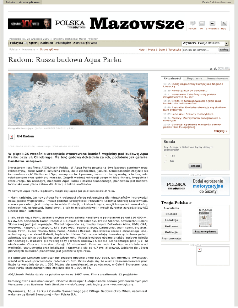 Polska - strona g łówna Zostań dziennikarzem! Forum TV E-wydania RSS Poniedzia łek, 28 wrze śnia 2009 r. imieniny obchodz ą: Marek, Wac ław Fakty24 Sport Kultura Pieniądze Strona główna Polska » Mazowsze » Strona główna Wybierz Twoje miasto Moto | Praca | Dom | Turystyka Szukaj na stronie... Radom: Rusza budowa Aqua Parku Aktualno ści Popularne Komentowane 15:55 Dukaj nagrodzony Europejsk ą Nagrodą Literacką 15:29 Prywatyzacja po bia łorusku 15:11 Warszawa: Zako ńczyła się pikieta związkowców z PLL LOT 14:35 Szpital w Siemianowicach będzie miał lotnisko dla helikopterów? 13:40 Australia: Ekolodzy obawiają się skutków burz pyłowych 13:09 Lubelskie: Szalony motocyklista 12:34 Niemcy: Zatrzymania podejrzanych o terroryzm Fotografia ilustruj ąca (© Fot. ANDRZEJ GRYGIEL / PAP) 12:06 Szwecja: Spotkanie ministr ów obrony państw Unii Europejskiej więcej » UM Radom Sonda 2 0 0 9 - 09 - 28 15:52:26, aktualizacja: 2009 - 09 - 28 15:53:55 W piątek 25 września uroczyście wmurowano kamień węgielny pod budowę Aqua Parku przy ul. Chrobrego. Ma by ć gotowy dokładnie za rok, podobnie jak galeria handlowo-usługowa. Czy Grzegorz Schetyna by łby dobrym premierem? i Tak j k l m n j Nie k l m n Inwestorem jest firma AIG/Lincoln Polska. W Aqua Parku powstan ą dwa baseny: sportowy oraz rekreacyjny, bicze wodne, sztuczna rzeka, dwie zjeżdżalnie, jacuzzi. Obok basen ów znajdzie si ę kameralna cz ęść Wellness i Spa, sauny suche i parowe, basen z zimn ą wod ą, solarium, sale relaksacyjne oraz gabinety masa żu. Zesp ół wodnej rekreacji uzupe łni klub fitness, kr ęgielnia i restauracja. Na zewn ątrz, nieopodal Aqua Parku i Osiedla Słonecznego, planowana jest budowa lodowiska oraz placu zabaw dla dzieci, a tak że amfiteatru. Reklama W nowym Aqua Parku będziemy mogli się kąpać już pod koniec 2010 roku. - Mam nadziej ę, że nowy Aqua Park wzbogaci ofert ę rekreacyjną dla mieszka ńców i wprowadzi nowa jako ść wypoczynku - mówił podczas uroczysto ści Prezydent Radomia Andrzej Kosztowniak. - naszym celem jest po łączenie wielu funkcji, z kt órych b ędą mogli korzysta ć mieszkańcy: rekreacyjnej, us ługowej, handlowej, a tak że mieszkaniowej - mówił dyrektor zarz ądzaj ący AIG Lincoln Brian Patterson. Twoja Polska » E-wydania Kontakt I tak, obok Aqua Parku zostanie wybudowana galeria handlowa o powierzchni ponad 110 000 m. Na dw óch poziomach Galerii znajdzie si ę około 170 sklep ów. Prawie 50 proc. powierzchni Galerii Słonecznej jest ju ż wynaj ęte. W śród najemc ów s ą miedzy innymi Delikatesy Alma, H&M, C&A, Reserved, KappAhl, Intersport, RTV Euro AGD, Sephora, Ecco, Calzedonia, Intimissimi, Big Star, Cropp Town, Super -Pharm, Nike, Puma, Adidas i Reebok. Operatorem szescio-ekranowego kina, wchodz ąc e g o w s k ład Galerii, b ędzie Multikino. Jak zapowiadaj ą inwestorzy budowa galerii zako ńczy się także pod koniec przysz łego roku. Przedsięwzięcie obejmuje także budow ę Osiedla Słonecznego. Budowa pierwszej fazy (trzech blok ów ) O s i e d l a S łonecznego jest ju ż na ukończeniu. Obecnie inwestor oferuje 86 mieszka ń. Cena za metr kw. Jest uzale żniona od wielkości, usytuowania oraz lokalizacji i zaczynaj ą się od 4,7 tys. z ł wzwy ż. Oddanie do u żytku pierwszych mieszkań planowane jest jeszcze w tym roku. Na budowie Centrum S łonecznego pracuje obecnie oko ło 600 os ób, jak informuj ą inwestorzy, wśród nich wielu pracownik ów radomskich firm. Przewiduje się, że wraz z zaawansowaniem prac liczba ta wzro śnie do ok. 1 300. Można się spodziewa ć, że po otwarciu, w Galerii Słonecznej oraz Aqua Parku sta łe zatrudnienie znajdzie oko ło 1 000 osób. AIG/Lincoln Polska działa na polskim rynku od 1997 roku. Firma zrealizowała 12 projekt ów komercyjnych i mieszkaniowych. Obecnie deweloper buduje osiedle dom ów jednorodzinnych pod Warszawa oraz Business Park Stryk ów - wielofazowy park logistyczno - technologiczny. Wykonawc ą Aqua Parku i Osiedla S łonecznego jest Eiffage Budownictwo Mitex, natomiast wykonawc ą Galerii Słonecznej - Porr Polska S.A. Redakcja Reklama Kolekcje Prenumerata Reklama REKLAMA Dodaj komentarz Dodaj Wyślij Drukuj patronaty Pomagajmy przysz łym mamom Frost/Nixon Copyright © Polskapresse Sp. z o.o. "Kierowco, kultury!" Pascal gotował w zwycięskich szko łach Nurkuj, Olly, nurkuj! Sensacje XX wieku Mapa serwisu | Dla prasy | Kontakt | O nas | Reklama | Kolekcje | RSS | Sklep internetowy "Clifford"