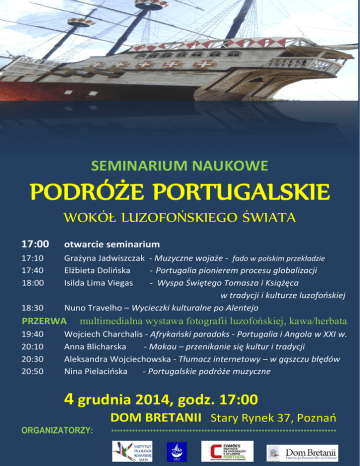 SEMINARIUM NAUKOWE PODRÓŻE PORTUGALSKIE WOKÓŁ LUZOFOŃSKIEGO ŚWIATA 17:00 otwarcie seminarium 17:10 17:40 18:00 Grażyna Jadwiszczak - Muzyczne wojaże - fado w polskim przekładzie Elżbieta Dolińska - Portugalia pionierem procesu globalizacji Isilda Lima Viegas - Wyspa Świętego Tomasza i Książęca w tradycji i kulturze luzofońskiej Nuno Travelho – Wycieczki kulturalne po Alentejo 18:30 PRZERWA 19:40 20:10 20:30 20:50 multimedialna wystawa fotografii luzofońskiej, kawa/herbata Wojciech Charchalis - Afrykański paradoks - Portugalia i Angola w XXI w. Anna Blicharska - Makau – przenikanie się kultur i tradycji Aleksandra Wojciechowska - Tłumacz internetowy – w gąszczu błędów Nina Pielacińska - Portugalskie podróże muzyczne 4 grudnia 2014, godz. 17:00 DOM BRETANII Stary Rynek 37, Poznań ORGANIZATORZY: ***************************************************************************