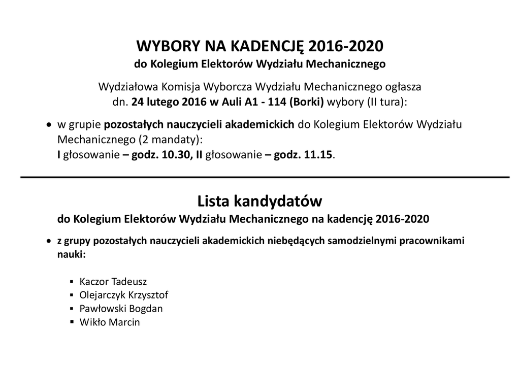 WYBORY NA KADENCJĘ 2016-2020 do Kolegium Elektorów Wydziału Mechanicznego Wydziałowa Komisja Wyborcza Wydziału Mechanicznego ogłasza dn. 24 lutego 2016 w Auli A1 - 114 (Borki) wybory (II tura): w grupie pozostałych nauczycieli akademickich do Kolegium Elektorów Wydziału Mechanicznego (2 mandaty): I głosowanie – godz. 10.30, II głosowanie – godz. 11.15. Lista kandydatów do Kolegium Elektorów Wydziału Mechanicznego na kadencję 2016-2020 z grupy pozostałych nauczycieli akademickich niebędących samodzielnymi pracownikami nauki: ▪ Kaczor Tadeusz ▪ Olejarczyk Krzysztof ▪ Pawłowski Bogdan ▪ Wikło Marcin