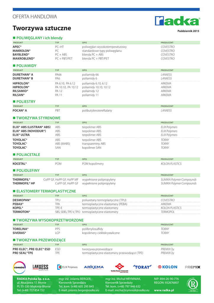 OFERTA HANDLOWA Tworzywa sztuczne Październik 2015 POLIWĘGLANY i ich blendy PRODUKT TYP OPIS PRODUCENT APEC® MAKROLON® BAYBLEND® MAKROBLEND® PC–HT PC PC + ABS PC + PBT/PET poliwęglan wysokotemperaturowy standardowe typy poliwęglanu blenda PC + ABS blenda PC + PBT/PET COVESTRO COVESTRO COVESTRO COVESTRO POLIAMIDY PRODUKT TYP OPIS PRODUCENT DURETHAN® A DURETHAN® B PA66 PA6 poliamidy 66 poliamidy 6 LANXESS LANXESS HIPROLON® HIPROLON® RILSAMID® RILSAN® PA 6.10, PA 6.12 PA 10.10, PA 10.12 PA 12 PA 11 poliamidy 6.10, 6.12 poliamidy 10.10, 10.12 poliamidy 12 poliamidy 11 ARKEMA ARKEMA ARKEMA ARKEMA PRODUKT TYP OPIS PRODUCENT POCAN® A PBT polibutylenotereftalany LANXESS POLIESTRY TWORZYWA STYRENOWE PRODUKT TYP OPIS PRODUCENT ELIX® ABS (LUSTRAN® ABS) ELIX® ABS (NOVODUR®) ELIX® ULTRA ABS ABS ABS terpolimer ABS terpolimer ABS terpolimer ABS ELIX Polymers ELIX Polymers ELIX Polymers TOYOLAC® TOYOLAC® TOYOLAC® ABS ABS (MABS) SAN terpolimer ABS transparentny ABS kopolimer SAN TORAY TORAY TORAY PRODUKT TYP OPIS PRODUCENT KOCETAL® POM POM kopolimery KOLON PLASTICS TYP OPIS PRODUCENT wypełnione polipropyleny wypełnione polipropyleny SUMIKA Polymer Compounds SUMIKA Polymer Compounds POLIACETALE POLIOLEFINY PRODUKT THERMOFIL® THERMOFIL® HP CoPP GF, HoPP GF, HoPP MF CoPP GF, HoPP GF ELASTOMERY TERMOPLASTYCZNE PRODUKT TYP OPIS PRODUCENT DESMOPAN® PEBAX® KOPEL® TERMOTON® TPU TPA TPE-E SBS, SEBS, TPE-V, TPO poliuretany termoplastyczne (TPU) termoplastyczne elastomery (PEBA) termoplastyczne elastomery termoplastyczne elastomery COVESTRO ARKEMA KOLON PLASTICS TERMOPOL TWORZYWA WYSOKOPRZETWORZONE PRODUKT TYP OPIS PRODUCENT TORELINA® SIVERAS® PPS LCP polifenylosulfidy kopolimery ciekłokrystaliczne TORAY TORAY TWORZYWA PRZEWODZĄCE PRODUKT TYP OPIS PRODUCENT PRE-ELEC®, PRE-ELEC® ESD PRE-SEAL®TPE ESD TPE tworzywa przewodzące termoplastyczne elastomery przewodzące (TPE) PREMIX Oy PREMIX Oy RADKA Polska Sp. z o.o. ul. Akacjowa 17, Błonie PL 55-330 Miękinia-Błonie Tel: (+48) 717 854 152 mgr inż. Jolanta BERGER, Kierownik Sprzedaży Tel. kom. (+48) 605 295 845 E-mail: [email protected] mgr inż. Michał HRYMNIAK, Kierownik Sprzedaży Tel. kom. (+48) 797 946 632 E-mail: [email protected] NIP: 894-26-90-776 REGON: 932676807 www.radka.pl