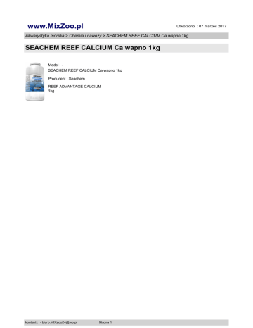 www.MixZoo.pl Utworzono : 07 marzec 2017 Akwarystyka morska > Chemia i nawozy > SEACHEM REEF CALCIUM Ca wapno 1kg SEACHEM REEF CALCIUM Ca wapno 1kg Model : SEACHEM REEF CALCIUM Ca wapno 1kg Producent : Seachem REEF ADVANTAGE CALCIUM 1kg kontakt : - [email protected] Strona 1 www.MixZoo.pl Utworzono : 07 marzec 2017 Akwarystyka morska > Chemia i nawozy > SEACHEM REEF CALCIUM Ca wapno 1kg SEACHEM REEF CALCIUM Ca wapno 1kg kontakt : - [email protected] Strona 2 www.MixZoo.pl Utworzono : 07 marzec 2017 Akwarystyka morska > Chemia i nawozy > SEACHEM REEF CALCIUM Ca wapno 1kg SEACHEM REEF CALCIUM Ca wapno 1kg Reef Advantage Calcium to łagodnie zasadowa (pH 8,3 - 8,6) zoptymalizowana mieszanka związków wapnia, przeznaczona do uzupełniania niedoborów tego pierwiastka i utrzymania jego stałego poziomu w akwarium morskim. Wapń i węglany są niezbędne do prawidłowego wzrostu koralowców. Brak tych substancji powoduje spowolnienie tempa wzrostu i pogorszenie kondycji. Preparat zawiera także magnez i stront w proporcji typowej dla stosowania w zbiornikach morskich (Ca: Mg: Sr - 100: 5: 0,1), co pozwala na jednoczesne korygowanie zawartości tych trzech pierwiastków. W przeciwieństwie do wody wapiennej Reef Advanced Calcium nie ma silnie zasadowego odczynu i nie powoduje obniżania poziomu magnezu. Stosowany zgodnie z instrukcją, nie wpływa na twardość wody. � Sposób użycia POCZĄTKUJĄCY: 5 g (1 łyżeczka od herbaty) na 150 litrów wody w zbiorniku, (zalecane 2 razy w tygodniu). Preparat rozpuścić w ok 250 ml wody. ZAAWANSOWANY: Sprawdzić zawartość wapnia za pomocą testu, a następnie dawkować preparat wg podanego wyżej schematu do chwili osiągnięcia 380 - 420mg/l. Każde 5g preparatu na 150l wody oznacza podwyższenie jego poziomu o 12mg/l. Można zwiększać lub zmniejszać dawkę oraz częstotliwość podawania preparatu, jednak nie należy przekraczać 10g na każde 150l wody w akwarium. Później stosować w miarę potrzeby dla uzyskania stałego poziomu wapnia w akwarium. � Uwaga! Nie przedawkowywać. Nadmierna ilość wapnia może spowodować spadek twardości węglanowej. Nie mieszać preparatu z innymi suplementami zawierającymi węglany. Preparaty zawierające magnez i preparaty dostarczające węglanów powinny być podawane na przemian co drugi dzień lub przynajmniej z 30-minutową przerwą. Cena : 118,99 zł Brutto ( 96,74 zł Netto) Dostępność: Produkt dostępny w naszym sklepie od 23 czerwiec 2012 kontakt : - [email protected] Strona 3