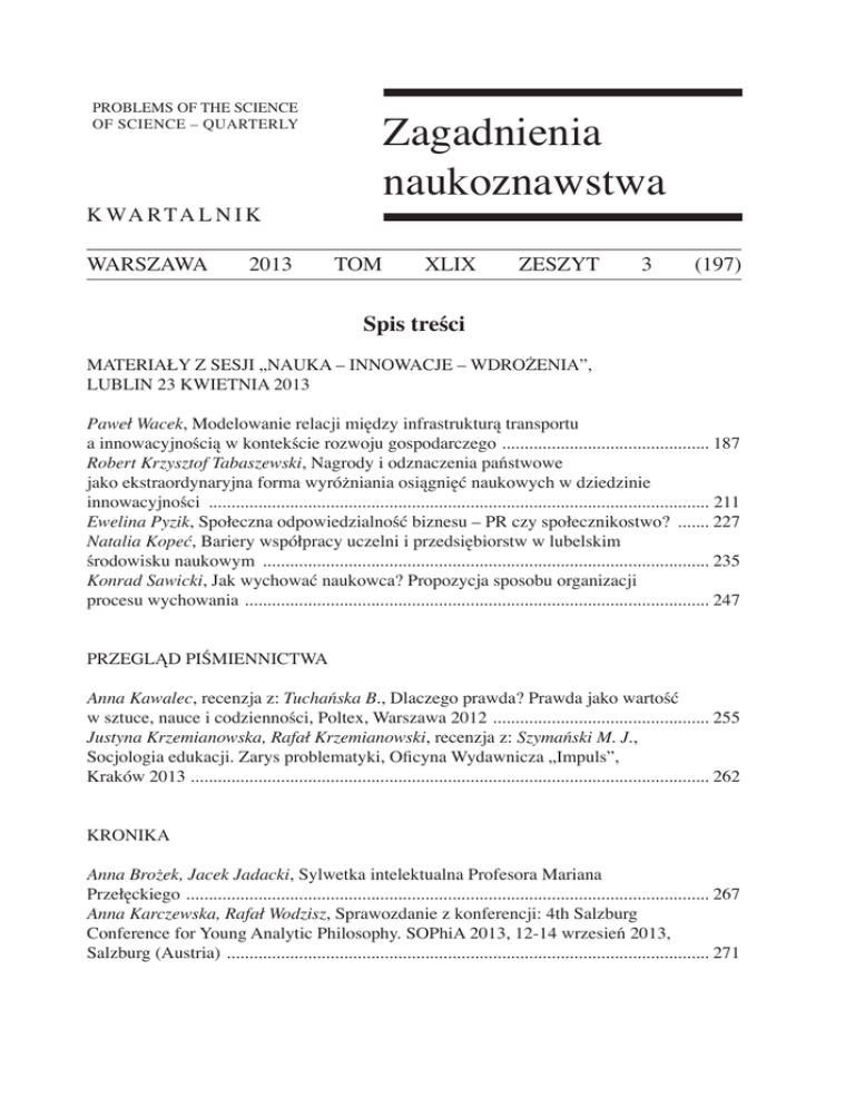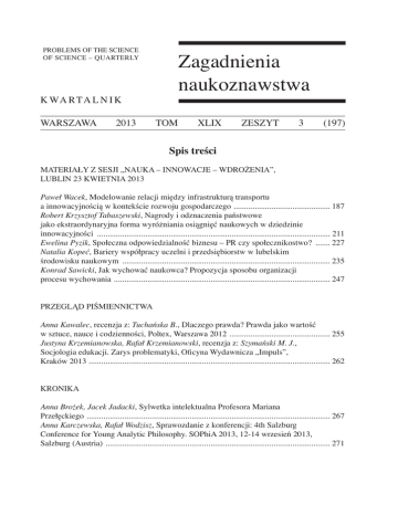 PROBLEMS OF THE SCIENCE OF SCIENCE – QUARTERLY Zagadnienia naukoznawstwa K WA R TA L N I K WARSZAWA 2013 TOM XLIX ZESZYT 3 (197) Spis treści Materiały z sesji „Nauka – Innowacje – Wdrożenia”, Lublin 23 kwietnia 2013 Paweł Wacek, Modelowanie relacji między infrastrukturą transportu a innowacyjnością w kontekście rozwoju gospodarczego . ............................................. 187 Robert Krzysztof Tabaszewski, Nagrody i odznaczenia państwowe jako ekstraordynaryjna forma wyróżniania osiągnięć naukowych w dziedzinie innowacyjności ................................................................................................................ 211 Ewelina Pyzik, Społeczna odpowiedzialność biznesu – PR czy społecznikostwo? ........ 227 Natalia Kopeć, Bariery współpracy uczelni i przedsiębiorstw w lubelskim środowisku naukowym .................................................................................................... 235 Konrad Sawicki, Jak wychować naukowca? Propozycja sposobu organizacji procesu wychowania . ...................................................................................................... 247 PRZEGLĄD PIŚMIENNICTWA Anna Kawalec, recenzja z: Tuchańska B., Dlaczego prawda? Prawda jako wartość w sztuce, nauce i codzienności, Poltex, Warszawa 2012 . ............................................... 255 Justyna Krzemianowska, Rafał Krzemianowski, recenzja z: Szymański M. J., Socjologia edukacji. Zarys problematyki, Oficyna Wydawnicza „Impuls”, Kraków 2013 ................................................................................................................... 262 KRONIKA Anna Brożek, Jacek Jadacki, Sylwetka intelektualna Profesora Mariana Przełęckiego . ................................................................................................................... 267 Anna Karczewska, Rafał Wodzisz, Sprawozdanie z konferencji: 4th Salzburg Conference for Young Analytic Philosophy. SOPhiA 2013, 12-14 wrzesień 2013, Salzburg (Austria) ............................................................................................................ 271 Contents Conference materials: “Science – Innovations – Implementations”, Lublin 23 April 2013 Paweł Wacek, Modeling the relationship between transport infrastructure and innovation in the context of economic development ................................................187 Robert Krzysztof Tabaszewski, Awards and state awards as extraordinary form of distinction of scientific achievements in the field of innovation ................................. 211 Ewelina Pyzik, Corporate social responsibility - PR or activism? . .................................227 Natalia Kopeć, Barriers to cooperation between universities and enterprises in the Lublin scientific environment ................................................................................ 235 Konrad Sawicki, How to raise a scientist? Proposal for the organization of educational process . .................................................................................................... 247 Review of the literature Anna Kawalec, review of: Tuchańska B., Dlaczego prawda? Prawda jako wartość w sztuce, nauce i codzienności, Poltex, Warszawa 2012 . ...............................................255 Justyna Krzemianowska, Rafał Krzemianowski, review of: Szymański M. J., Socjologia edukacji. Zarys problematyki, Oficyna Wydawnicza „Impuls”, Kraków 2013 ...................................................................................................................262 Chronicle Anna Brożek, Jacek Jadacki, Intellectual profile of Professor Marian Przełęcki ............ 267 Anna Karczewska, Rafał Wodzisz, Report from the conference: 4th Salzburg Conference for Young Analytic Philosophy. SOPhiA 2013, 12-14 September 2013, Salzburg (Austria) ............................................................................................................ 271