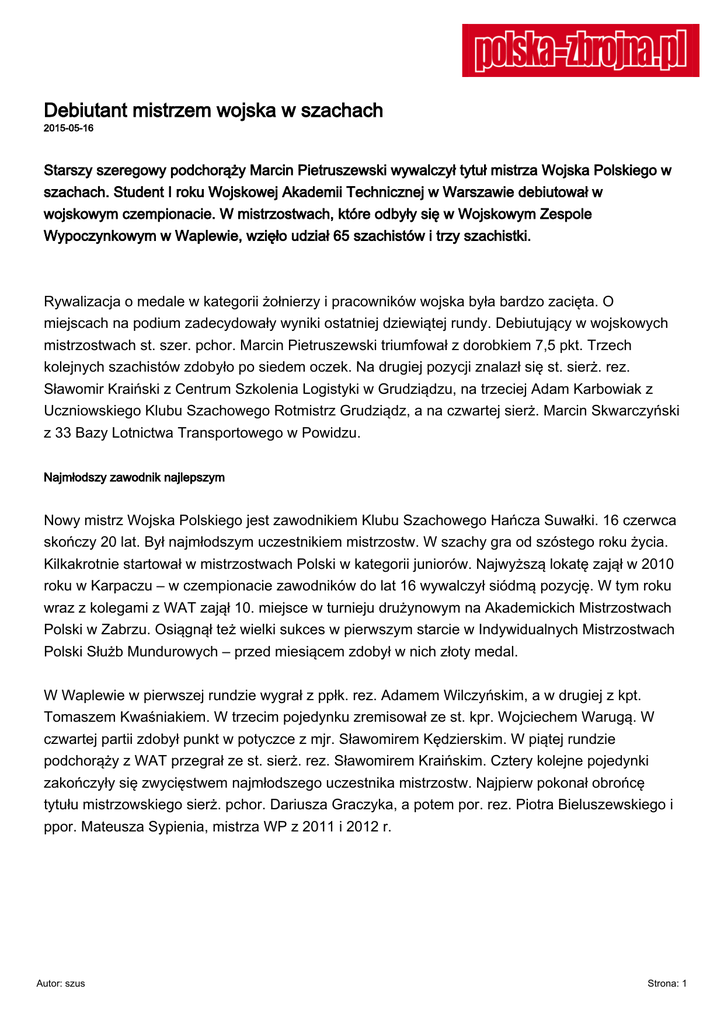 Debiutant mistrzem wojska w szachach 2015-05-16 Starszy szeregowy podchorąży Marcin Pietruszewski wywalczył tytuł mistrza Wojska Polskiego w szachach. Student I roku Wojskowej Akademii Technicznej w Warszawie debiutował w wojskowym czempionacie. W mistrzostwach, które odbyły się w Wojskowym Zespole Wypoczynkowym w Waplewie, wzięło udział 65 szachistów i trzy szachistki. Rywalizacja o medale w kategorii żołnierzy i pracowników wojska była bardzo zacięta. O miejscach na podium zadecydowały wyniki ostatniej dziewiątej rundy. Debiutujący w wojskowych mistrzostwach st. szer. pchor. Marcin Pietruszewski triumfował z dorobkiem 7,5 pkt. Trzech kolejnych szachistów zdobyło po siedem oczek. Na drugiej pozycji znalazł się st. sierż. rez. Sławomir Kraiński z Centrum Szkolenia Logistyki w Grudziądzu, na trzeciej Adam Karbowiak z Uczniowskiego Klubu Szachowego Rotmistrz Grudziądz, a na czwartej sierż. Marcin Skwarczyński z 33 Bazy Lotnictwa Transportowego w Powidzu. Najmłodszy zawodnik najlepszym Nowy mistrz Wojska Polskiego jest zawodnikiem Klubu Szachowego Hańcza Suwałki. 16 czerwca skończy 20 lat. Był najmłodszym uczestnikiem mistrzostw. W szachy gra od szóstego roku życia. Kilkakrotnie startował w mistrzostwach Polski w kategorii juniorów. Najwyższą lokatę zajął w 2010 roku w Karpaczu – w czempionacie zawodników do lat 16 wywalczył siódmą pozycję. W tym roku wraz z kolegami z WAT zajął 10. miejsce w turnieju drużynowym na Akademickich Mistrzostwach Polski w Zabrzu. Osiągnął też wielki sukces w pierwszym starcie w Indywidualnych Mistrzostwach Polski Służb Mundurowych – przed miesiącem zdobył w nich złoty medal. W Waplewie w pierwszej rundzie wygrał z ppłk. rez. Adamem Wilczyńskim, a w drugiej z kpt. Tomaszem Kwaśniakiem. W trzecim pojedynku zremisował ze st. kpr. Wojciechem Warugą. W czwartej partii zdobył punkt w potyczce z mjr. Sławomirem Kędzierskim. W piątej rundzie podchorąży z WAT przegrał ze st. sierż. rez. Sławomirem Kraińskim. Cztery kolejne pojedynki zakończyły się zwycięstwem najmłodszego uczestnika mistrzostw. Najpierw pokonał obrońcę tytułu mistrzowskiego sierż. pchor. Dariusza Graczyka, a potem por. rez. Piotra Bieluszewskiego i ppor. Mateusza Sypienia, mistrza WP z 2011 i 2012 r. Autor: szus Strona: 1 Zapis i sytuacja końcowa na szachownicy z partii, która rozegrali sierż. pchor. Dariusz Graczyk i st. szer. pchor. Marcin Pietruszewski (białe - Graczyk). – Wygrałem złoto rzutem na taśmę. W ostatniej partii wcale nie byłem faworytem. Nie wiem co się stało, że mój rywal zagrał słabiej – mówi st. szer. pchor. Marcin Pietruszewski. – Popełnił błąd w środkowej części partii. W końcówce szczęśliwie udało mi się z nim wygrać – dodaje mistrz i podkreśla, że przełomowym momentem w turnieju była dla niego wygrana w siódmej rundzie z Dariuszem Graczykiem. – Po szóstej rundzie jeszcze dziesięciu zawodników liczyło się w walce o medale. Wygrana z obrońcą tytułu pozwoliła mi zachować szansę na rywalizację o miejsce na podium – przyznaje zadowolony podchorąży z WAT. St. szer. pchor. Marcin Pietruszewski w ostatnich czterech tygodniach w dwóch mistrzowskich turniejach szachowych wywalczył dwa złote medale. Wygrał 14 z 18 partii, trzy zremisował i tylko jedną przegrał. Podchorąży bardziej ceni sobie zwycięstwo w czempionacie służb mundurowych. – Trudniej było mi wygrać w Pokrzywnej. Rywale z którymi tam grałem sprawili mi więcej kłopotów Autor: szus Strona: 2 niż w Waplewie. Cieszę się, że w obu mistrzostwach dobrze spisałem się w ostatnich rundach – mówi podwójny mistrz. Najstarsi szachiści, emeryci i weterani Najstarszymi uczestnikami mistrzostw byli 76-letni Zygmunt Pioch ze Stowarzyszenia Kultury Fizycznej Korsarz Gdynia i ppłk w st. spocz. Władysław Długołęcki z Uczniowskiego Klubu Szachowego Hetman Warszawa. Ten pierwszy w stawce 68 zawodników zajął 21 miejsce, a ten drugi 32. Warto podkreślić, że Zygmunt Pioch jest arcymistrzem w szachach korespondencyjnych (tytuł ten otrzymał w 1991 roku) i w tej specjalności szachowej osiągnął największe sukcesy – był indywidualnym mistrzem Polski w 1972 i 1974 r. Podczas mistrzostw w Waplewie poza kategorią główną żołnierzy i pracowników wojska prowadzono również klasyfikację dla byłych żołnierzy i emerytów wojskowych. Wygrał ją por. rez. Piotr Bieluszewski z Klubu Szachowego Start Elbląg (w turnieju otwartym zajął 10. miejsce) przed chor. rez. Piotrem Czaplińskim z LKS Chrobry Gniezno (15.) i kmdr. por. w st. spocz. Wiesławem Rawskim z Gdyni (16.). O medale w swojej kategorii mogli również walczyć byli żołnierze lub renciści wojskowi zgłoszeni przez Stowarzyszenie Rannych i Poszkodowanych w Misjach poza Granicami Kraju. Niestety, w tej klasyfikacji chor. w st. spocz. Andrzej Pacholec z Olsztyna nie miał z kim rywalizować. Przed rokiem była podobna sytuacja, gdyż w mistrzostwach brał udział jeden szachista zgłoszony przez Stowarzyszenie Rannych i Poszkodowanych w Misjach poza Granicami Kraju. Sprawdzian przed czempionatem w Amsterdamie Mistrzostwa w Waplewie były najważniejszym sprawdzianem przed XXVI Mistrzostwami NATO w Szachach, które w lipcu odbędą się w Amsterdamie. – Do Holandii na pewno pojadą medaliści w kategorii żołnierzy i pracowników wojska. A kto uzupełni skład reprezentacji zadecydujemy w najbliższych dniach – wyjaśnia ppłk rez. Jerzy Kufel, kierownik mistrzostw w Waplewie. – Cieszę się, że będę mógł reprezentować naszą armię na mistrzostwach w Amsterdamie. Nie myślę o specjalnych przygotowaniach do tej imprezy. Teraz muszę nadrobić zaległości na uczelni – mówi st. szer. pchor. Marcin Pietruszewski, który przebojem wywalczył sobie miejsce w szachowej reprezentacji Wojska Polskiego. Autor: szus Strona: 3 Zapis i sytuacja końcowa na szachownicy z partii, która ro