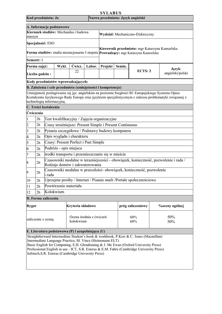 SYLABUS Nazwa przedmiotu: Język angielski Kod przedmiotu: Ja A. Informacje podstawowe Kierunek studiów: Mechanika i budowa maszyn Wydział: Mechaniczno-Elektryczny Specjalność: ESO Kierownik przedmiotu: mgr Katarzyna Kamzelska Forma studiów: studia niestacjonarne I stopnia Prowadzący: mgr Katarzyna Kamzelska Semestr: I Forma zajęć: Wykł. Liczba godzin : Ćwicz. 22 Labor. Projekt Semin. Język: angielski/polski ECTS: 2 Kody przedmiotów wprowadzających: B. Założenia i cele przedmiotu (umiejętności i kompetencje) Umiejętność posługiwania się jęz. angielskim na poziomie biegłości B1 Europejskiego Systemu Opisu Kształcenia Językowego Rady Europy oraz językiem specjalistycznym z zakresu problematyki związanej z technologią informacyjną. C. Treści kształcenia Ćwiczenia 1 2h 2 2h 3 2h 4 5 6 2h 7 2h 8 2h 9 2h 10 2h 11 2h 12 2h 2h 2h Test kwalifikacyjny / Zajęcia organizacyjne Czasy teraźniejsze: Present Simple i Present Continuous Pytania szczegółowe / Podstawy budowy komputera Opis wyglądu i charakteru Czasy: Present Perfect i Past Simple Podróże - opis miejsca środki transportu i przemieszczanie się w mieście Czasowniki modalne w terazniejszości - obowiązek, konieczność, pozwolenie i rada / Rodzaje domów i zakwaterowania Czasowniki modalne w przeszłości- obowiązek, konieczność, pozwolenie i rada Uprzejme prośby / Internet / Pisanie maili /Portale społecznościowe Powtórzenie materiału Kolokwium D. Forma zaliczenia Rygor zaliczenie z oceną Kryteria składowe Ocena średnia z ćwiczeń kolokwium próg zaliczeniowy %oceny ogólnej 60% 60% 50% 50% E. Literatura podstawowa (P) i uzupełniająca (U) Straightforward Intermediate Student’s book & workbook, P.Kerr & C. Jones (Macmillan) Intermediate Language Practice, M. Vince (Heinemann ELT) Basic English for Computing, E.H. Glendinning & J. Mc Ewan (Oxford University Press) Professional English in use - ICT, S.R. Esteras & E.M. Fabre (Cambridge University Press) Infotech,S.R. Esteras (Cambridge University Press)