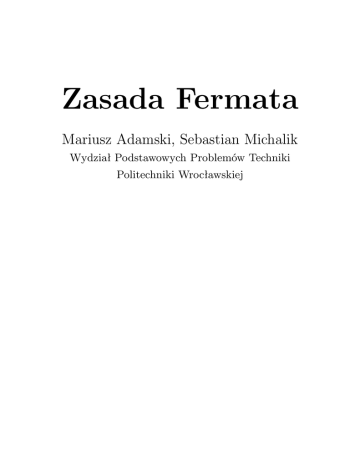 Zasada Fermata Mariusz Adamski, Sebastian Michalik Wydział Podstawowych Problemów Techniki Politechniki Wrocławskiej 1. Definicja. Zasada Fermata orzeka, że: Promień świetlny poruszający się z punktu P do punktu Q podąża zawsze drogą, na której przebycie potrzeba lokalnie ekstremalnego czasu. Sformułował ją w roku 1650 francuski matematyk Pierre de Fermat. Zasada ta jest przypadkiem szczególnym zasady Maupertuis najmniejszego działania. Dla stałej częstości fali faza Z Z n̂dr̄ ϕ = k̄dr̄ = ω , u gdzie k̄ – wektor falowy, ω – częstość fali, n̂ – wersor w kierunku rozprzestrzeniania się czoła fali, u – prędkość fazowa. Iloczyn n̂dr̄ równy jest przemieszczeniu powierzchni stałej fazy w kierunku normalnym do tej powierzchni, więc (n̂dr̄)/u jest czasem dt, w którym to przemieszczenie zachodzi. Zgodnie z zasadą Maupertuis, którą faza powinna spełniać tak samo, jak działanie, czas ten powinien być ekstremalny. 2. Prawo odbicia. Na początku zauważmy, że w jednorodnym, translacyjnie niezmienniczym ośrodku, w którym prędkość światła jest stała, drogą najkrótszego czasu jest prosta. Będziemy zakładać, że droga od punktu P do zwierciadła, normalna oraz droga od zwierciadła do punktu Q są współpłaszczyznowe. Mamy: p l1 = a2 + x2 , p l2 = b2 + (d − x)2 . Zatem czas potrzebny na przebycie drogi p 1 p 2 l 1 + l2 = a + x2 + b2 + (d − x)2 (1) t= c c Warunkiem koniecznym ekstremum czasu jest zerowanie się pierwszej wariacji: ! 1 xδx −(d − x)δx √ p δt = + = 2 2 2 2 c a +x b + (d − x) d−x δx δx x − = (sin α − sin β) = c l1 l2 c Zatem dostajemy: sin α = sin β, ale ponieważ oba kąty są ostre, musi być: α = β, co jest znanym prawem odbicia. Pokażemy jeszcze, że droga odpowiadająca warunkowi α = β jest najmniejsza z możliwych. W tym celu policzymy drugą wariację wyrażenia (1): √ δx a2 + x2 − x √axδx 2 +x2 δx 2 δ t = + 2 2 c a +x p ! −δx b2 + (d − x)2 − (b − x) √−(d−x)δx b2 +(d−x)2 − = 2 2 b + (d − x) ! 2 2 2 δx a b = 32 + 32 > 0 c a2 + x2 b2 + (d − x)2 Zatem rzeczywiście mamy do czynienia z minimum czasu. Zauważmy następnie, że gdyby punkt O leżał w odległości δy od płaszczyzny rysunku, pod pierwiastkami w wyrażeniu (1) należałoby dodać czynniki δy 2 , co zwiększyłoby czas potrzebny na przebycie drogi. Założenie, że P O, OQ oraz normalna do powierzchni zwierciadła są współpłaszczyznowe było zatem słuszne. 3. Prawo załamania Snella. Załóżmy, że w ośrodku 1 światło porusza się z prędkością nc1 , a w ośrodku 2 z prędkością nc2 . Oczywiście, tak jak poprzednio p l1 = a2 + x2 , p l2 = b2 + (d − x)2 , zatem czas potrzebny na przebycie drogi p 1 p 2 n1 a + x2 + n2 b2 + (d − x)2 . t= c (2) Podobnie jak poprzednio, policzymy pierwszą wariację t: ! xδx −(d − x)δx 1 √ p n1 + n2 δt = = 2 2 2 2 c a +x b + (d − x) x d−x δx n1 − n2 = c l1 l2 W pobliżu toru o ekstremalnym czasie, δt powinno znikać, zatem: x d−x n1 = n2 l1 l2 n1 sin α = n2 sin β, co reprezentuje znane prawo załamania Snella. Literatura [1] Fizyka tom II - D. Halliday, R. Resnick [2] Fizyka teoretyczna - A. S. Kompaniejec