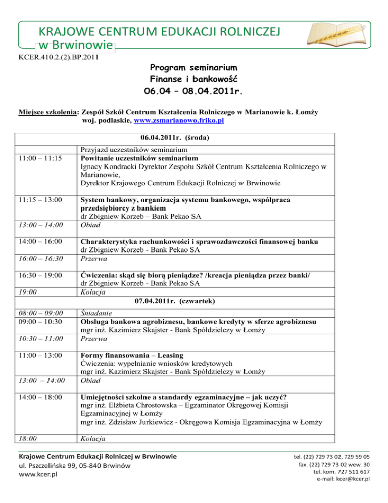 KCER.410.2.(2).BP.2011 Program seminarium Finanse i bankowość 06.04 – 08.04.2011r. Miejsce szkolenia: Zespół Szkół Centrum Kształcenia Rolniczego w Marianowie k. Łomży woj. podlaskie, www.zsmarianowo.friko.pl 06.04.2011r. (środa) 11:00 – 11:15 11:15 – 13:00 13:00 – 14:00 14:00 – 16:00 16:00 – 16:30 16:30 – 19:00 19:00 08:00 – 09:00 09:00 – 10:30 10:30 – 11:00 11:00 – 13:00 13:00 – 14:00 Przyjazd uczestników seminarium Powitanie uczestników seminarium Ignacy Kondracki Dyrektor Zespołu Szkół Centrum Kształcenia Rolniczego w Marianowie, Dyrektor Krajowego Centrum Edukacji Rolniczej w Brwinowie System bankowy, organizacja systemu bankowego, współpraca przedsiębiorcy z bankiem dr Zbigniew Korzeb – Bank Pekao SA Obiad Charakterystyka rachunkowości i sprawozdawczości finansowej banku dr Zbigniew Korzeb - Bank Pekao SA Przerwa Ćwiczenia: skąd się biorą pieniądze? /kreacja pieniądza przez banki/ dr Zbigniew Korzeb - Bank Pekao SA Kolacja 07.04.2011r. (czwartek) Śniadanie Obsługa bankowa agrobiznesu, bankowe kredyty w sferze agrobiznesu mgr inż. Kazimierz Skajster - Bank Spółdzielczy w Łomży Przerwa Formy finansowania – Leasing Ćwiczenia: wypełnianie wniosków kredytowych mgr inż. Kazimierz Skajster - Bank Spółdzielczy w Łomży Obiad 14:00 – 18:00 Umiejętności szkolne a standardy egzaminacyjne – jak uczyć? mgr inż. Elżbieta Chrostowska – Egzaminator Okręgowej Komisji Egzaminacyjnej w Łomży mgr inż. Zdzisław Jurkiewicz - Okręgowa Komisja Egzaminacyjna w Łomży 18:00 Kolacja 08.04.2011r. (piątek) 08:00 – 09:00 Śniadanie 09:00 – 10:30 Prawne zabezpieczenia bankowych kredytów w sferze agrobiznesu, metody wyceny nieruchomości, gruntów rolnych, obszarów leśnych mgr inż. Katarzyna Romanik - Bank Pekao SA Przerwa 10:30 – 11:00 11:30 – 13:00 13:00 – 13:30 13:30 - 14:00 Ćwiczenia: wypełnianie druków związanych z ustanawianiem hipotek, zastawów rejestrowych oraz sposoby wypełniania weksli mgr inż. Katarzyna Romanik - Bank Pekao SA Podsumowanie i ewaluacja szkolenia mgr inż. Barbara Płotczyk – Krajowe Centrum Edukacji Rolniczej w Brwinowie Obiad Barbara Płotczyk e-mail: [email protected] tel. (22) 729 73 55 ; 607 321 585