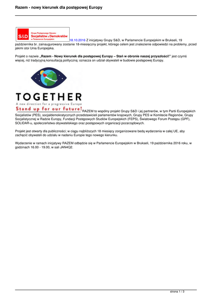Razem - nowy kierunek dla postępowej Europy 18.10.2016 Z inicjatywy Grupy S&D, w Parlamencie Europejskim w Brukseli, 19 października br. zainaugurowany zostanie 18-miesięczny projekt, którego celem jest znalezienie odpowiedzi na problemy, przed jakimi stoi Unia Europejska. Projekt o nazwie „Razem - Nowy kierunek dla postępowej Europy – Stań w obronie naszej przyszłości!” jest czymś więcej, niż tradycyjną konsultacją polityczną: oznacza on udział obywateli w budowie postępowej Europy. RAZEM to wspólny projekt Grupy S&D i jej partnerów, w tym Partii Europejskich Socjalistów (PES), socjaldemokratycznych przedstawicieli parlamentów krajowych, Grupy PES w Komitecie Regionów, Grupy Socjalistycznej w Radzie Europy, Fundacji Postępowych Studiów Europejskich (FEPS), Światowego Forum Postępu (GPF), SOLIDAR-u, społeczeństwa obywatelskiego oraz postępowych organizacji pozarządowych. Projekt jest otwarty dla publiczności; w ciągu najbliższych 18 miesięcy zorganizowane bedą wydarzenia w całej UE, aby zachęcić obywateli do udziału w nadaniu Europie tego nowego kierunku. Wydarzenie w ramach inicjatywy RAZEM odbędzie się w Parlamencie Europejskim w Brukseli, 19 października 2016 roku, w godzinach 16.00 - 19.00, w sali JAN4Q2. strona 1 / 3 Razem - nowy kierunek dla postępowej Europy Wśród prelegentów znajdą się: •Gianni Pittella, przewodniczący Grupy S&D •Sergej Staniszew, przewodniczący PES •Jeremy Corbyn, przewodniczący brytyjskiej Partii Pracy •Elio Di Rupo, przewodniczący belgijskiej Partii Socjalistycznej •Bruno Le Roux, przewodniczący Grupy Socjalistycznej we francuskim Zgromadzeniu Narodowym •Martin Schulz, przewodniczący Parlamentu Europejskiego •Federica Mogherini, wysoka przedstawiciel UE do spraw zagranicznych •Frans Timmermans, pierwszy wiceprzewodniczący Komisji Europejskiej •Luboš Blaha, przewodniczący Komisji Spraw Europejskich w Radzie Narodowej Republiki Słowackiej •Michele Nicoletti, przewodniczący Grupy Socjalistycznej, Zgromadzenie Parlamentarne Rady Europy •Massimo D´Alema, prezes FEPS •Aurélien Mauzy, przewodniczący Rainbow Rose •Luca Visentini, sekretarz generalny EKZZ •Jan Zielonka, profesor europeistyki, pracownik naukowy, katedra „Ralf Dahrendorf”, St Antonys College, Uniwersytet Oksfordzki strona 2 / 3 Razem - nowy kierunek dla postępowej Europy Pełen program inauguracyjnego wydarzenie można znaleźć Tutaj: Można też obejrzeć teaser wideo nt. inicjatywy RAZEM Tutaj: Dołącz do nas używając #EuropeTogether Wydarzenie będzie transmitowane na żywo w Internecie pod adresem: http://www.socialistsanddemocrats.eu/pl/europe-together Info ze strony: http://www.socialistsanddemocrats.eu/ 18-19 października 2016 r. strona 3 / 3