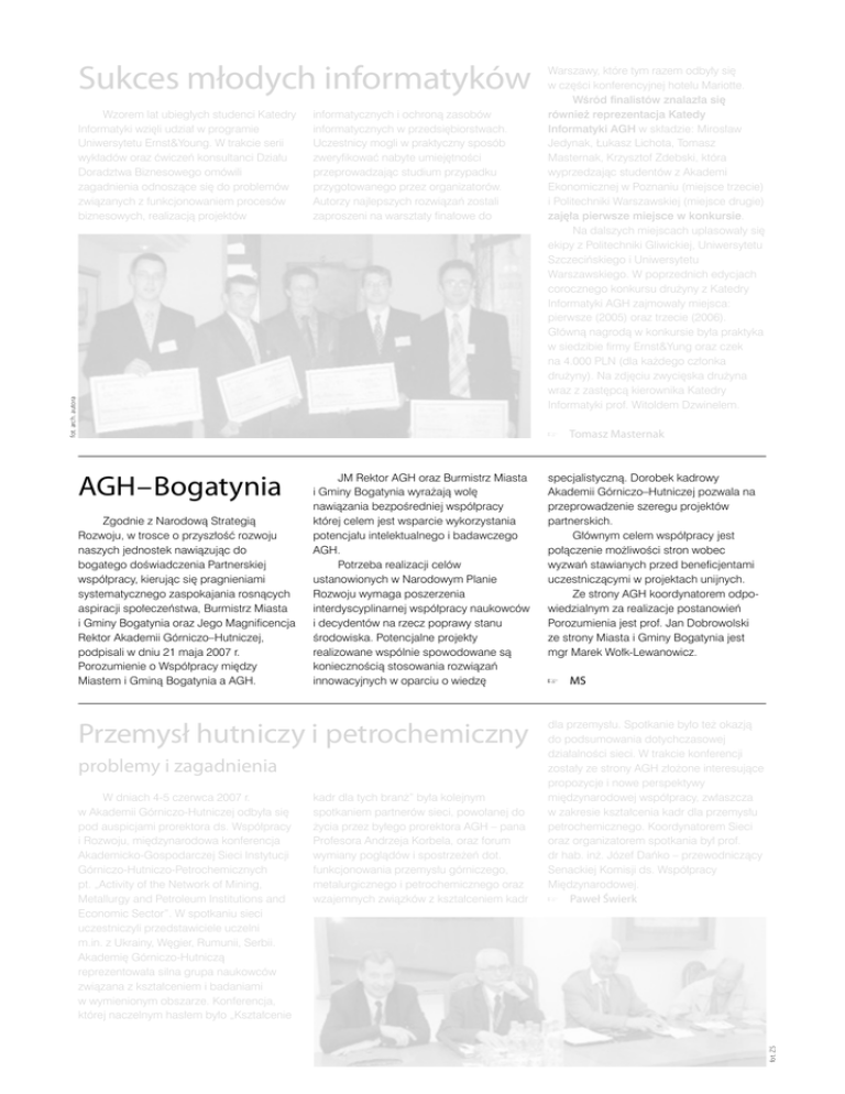 Sukces młodych informatyków informatycznych i ochroną zasobów informatycznych w przedsiębiorstwach. Uczestnicy mogli w praktyczny sposób zweryfikować nabyte umiejętności przeprowadzając studium przypadku przygotowanego przez organizatorów. Autorzy najlepszych rozwiązań zostali zaproszeni na warsztaty finałowe do fot. arch. autora Wzorem lat ubiegłych studenci Katedry Informatyki wzięli udział w programie Uniwersytetu Ernst&Young. W trakcie serii wykładów oraz ćwiczeń konsultanci Działu Doradztwa Biznesowego omówili zagadnienia odnoszące się do problemów związanych z funkcjonowaniem procesów biznesowych, realizacją projektów Warszawy, które tym razem odbyły się w części konferencyjnej hotelu Mariotte. Wśród finalistów znalazła się również reprezentacja Katedy Informatyki AGH w składzie: Mirosław Jedynak, Łukasz Lichota, Tomasz Masternak, Krzysztof Zdebski, która wyprzedzając studentów z Akademi Ekonomicznej w Poznaniu (miejsce trzecie) i Politechniki Warszawskiej (miejsce drugie) zajęła pierwsze miejsce w konkursie. Na dalszych miejscach uplasowały się ekipy z Politechniki Gliwickiej, Uniwersytetu Szczecińskiego i Uniwersytetu Warszawskiego. W poprzednich edycjach corocznego konkursu drużyny z Katedry Informatyki AGH zajmowały miejsca: pierwsze (2005) oraz trzecie (2006). Główną nagrodą w konkursie była praktyka w siedzibie firmy Ernst&Yung oraz czek na 4.000 PLN (dla każdego członka drużyny). Na zdjęciu zwycięska drużyna wraz z zastępcą kierownika Katedry Informatyki prof. Witoldem Dzwinelem. Tomasz Masternak Zgodnie z Narodową Strategią Rozwoju, w trosce o przyszłość rozwoju naszych jednostek nawiązując do bogatego doświadczenia Partnerskiej współpracy, kierując się pragnieniami systematycznego zaspokajania rosnących aspiracji społeczeństwa, Burmistrz Miasta i Gminy Bogatynia oraz Jego Magnificencja Rektor Akademii Górniczo–Hutniczej, podpisali w dniu 21 maja 2007 r. Porozumienie o Współpracy między Miastem i Gminą Bogatynia a AGH. JM Rektor AGH oraz Burmistrz Miasta i Gminy Bogatynia wyrażają wolę nawiązania bezpośredniej współpracy której celem jest wsparcie wykorzystania potencjału intelektualnego i badawczego AGH. Potrzeba realizacji celów ustanowionych w Narodowym Planie Rozwoju wymaga poszerzenia interdyscyplinarnej współpracy naukowców i decydentów na rzecz poprawy stanu środowiska. Potencjalne projekty realizowane wspólnie spowodowane są koniecznością stosowania rozwiązań innowacyjnych w oparciu o wiedzę Przemysł hutniczy i petrochemiczny problemy i zagadnienia W dniach 4-5 czerwca 2007 r. w Akademii Górniczo-Hutniczej odbyła się pod auspicjami prorektora ds. Współpracy i Rozwoju, międzynarodowa konferencja Akademicko-Gospodarczej Sieci Instytucji Górniczo-Hutniczo-Petrochemicznych pt. „Activity of the Network of Mining, Metallurgy and Petroleum Institutions and Economic Sector”. W spotkaniu sieci uczestniczyli przedstawiciele uczelni m.in. z Ukrainy, Węgier, Rumunii, Serbii. Akademię Górniczo-Hutniczą reprezentowała silna grupa naukowców związana z kształceniem i badaniami w wymienionym obszarze. Konferencja, której naczelnym hasłem było „Kształcenie kadr dla tych branż” była kolejnym spotkaniem partnerów sieci, powołanej do życia przez byłego prorektora AGH – pana Profesora Andrzeja Korbela, oraz forum wymiany poglądów i spostrzeżeń dot. funkcjonowania przemysłu górniczego, metalurgicznego i petrochemicznego oraz wzajemnych związków z kształceniem kadr specjalistyczną. Dorobek kadrowy Akademii Górniczo–Hutniczej pozwala na przeprowadzenie szeregu projektów partnerskich. Głównym celem współpracy jest połączenie możliwości stron wobec wyzwań stawianych przed beneficjentami uczestniczącymi w projektach unijnych. Ze strony AGH koordynatorem odpowiedzialnym za realizacje postanowień Porozumienia jest prof. Jan Dobrowolski ze strony Miasta i Gminy Bogatynia jest mgr Marek Wołk-Lewanowicz. MS dla przemysłu. Spotkanie było też okazją do podsumowania dotychczasowej działalności sieci. W trakcie konferencji zostały ze strony AGH złożone interesujące propozycje i nowe perspektywy międzynarodowej współpracy, zwłaszcza w zakresie kształcenia kadr dla przemysłu petrochemicznego. Koordynatorem Sieci oraz organizatorem spotkania był prof. dr hab. inż. Józef Dańko – przewodniczący Senackiej Komisji ds. Współpracy Międzynarodowej. Paweł Świerk fot. ZS AGH – Bogatynia