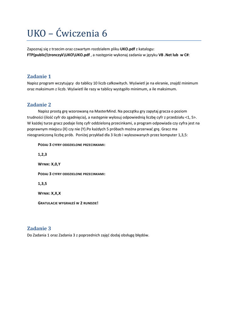 UKO – Ćwiczenia 6 Zapoznaj się z trzecim oraz czwartym rozdziałem pliku UKO.pdf z katalogu: FTP(public)\tronczyk\UKO\UKO.pdf , a następnie wykonaj zadania w języku VB .Net lub w C#: Zadanie 1 Napisz program wczytujący do tablicy 10 liczb całkowitych. Wyświetl je na ekranie, znajdź minimum oraz maksimum z liczb. Wyświetl ile razy w tablicy wystąpiło minimum, a ile maksimum. Zadanie 2 Napisz prostą grę wzorowaną na MasterMind. Na początku gry zapytaj gracza o poziom trudności (ilość cyfr do zgadnięcia), a następnie wylosuj odpowiednią liczbę cyfr z przedziału <1, 5>. W każdej turze gracz podaje listę cyfr oddzieloną przecinkami, a program odpowiada czy cyfra jest na poprawnym miejscu (X) czy nie (Y).Po każdych 5 próbach można przerwać grę. Gracz ma nieograniczoną liczbę prób. Poniżej przykład dla 3 liczb i wylosowanych przez komputer 1,3,5: PODAJ 3 CYFRY ODDZIELONE PRZECINKAMI: 1,2,3 WYNIK: X,0,Y PODAJ 3 CYFRY ODDZIELONE PRZECINKAMI: 1,3,5 WYNIK: X,X,X GRATULACJE WYGRAŁEŚ W 2 RUNDZIE ! Zadanie 3 Do Zadania 1 oraz Zadania 3 z poprzednich zajęć dodaj obsługę błędów. Zadanie 4 Stwórz klasę Student, która będzie przechowywała informację o studencie i jego ocenach. Klasa ma pozwalać na ustalanie imienia, nazwiska, numeru indeksu i numeru pesel studenta. Dodatkowo ma mieć możliwość dodawania ocen, pojedynczo lub całej tablicy ocen. Mamy mieć możliwość wypisania informacji o studencie na dwa sposoby: skrócony (Imię, nazwisko, nr_indeksu) lub ogólny gdzie mają być wypisane wszystkie informacje, także oceny. Zadanie 5 Napisz klasy Ocena(wartość, przedmiot, wystawiający) i Grupa Studencka (nazwa, lista studentów). Dla każdej z klas przygotuj odpowiednie metody. Zadanie 6 Zmodyfikuj tak zadanie 4 i 5 aby można było przypisywać Studentom Oceny i Studentów do Grup. Chcemy mieć możliwość wypisania dodatkowo wszystkich grup studenckich i wypisania wszystkich studentów w grupie (na oba sposoby). Zadanie 7 W metodzie Main zaprezentuj wszystkie możliwości klas z zadań 4-6.