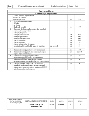 Poz. Wyszczególnienie, typ, producent Symbol montaŜowy Jedn. Ilość Budynek główny 1. Instalacja odgromowa 1 2 3 4 5 6 7 8 Taśma stalowa ocynkowana - PFe/Zn25x4mm Budynek wysoki Drut stalowy ocynkowany DFe/Zn φ= 8mm Budynek wysoki Elementy dodatkowe konstrukcyjne instalacji piorunochronnej, w tym: uchwyty krzyŜowe uchwyty uniwersalne uchwyty gąsiorowe uchwyty dachówkowe złącza kontrolne złącze rynnowe złącze uniwersalne do blachy inne (nakrętki, podkładki, smar do śrub itp.) wg. potrzeb DemontaŜ istniejących zwodów poziomych DemontaŜ istniejących, nie nadających się do uŜycia złącz kontrolnych DemontaŜ istniejących przewodów odprowadzających wraz z mocowaniami Sprawdzenie stanu istniejącego uziomu otokowego wraz z odkopaniem min 10% uziomu Zwód w izolacji HVI-L typ I do ochrony urządzeń telekomunikacyjnych na masztach stalowych wraz z osprzętem, producent DEHN lub równowaŜny technicznie. REMONT BUDYNKU KMP w GDAŃSKU ul. Nowe Ogrody 27 m 300 m 1500 szt szt szt szt szt szt szt 120 150 180 280 10 25 30 m kpl 1400 max 10 kpl 10 kpl 1 kpl 1 INSTALACJE ELEKTRYCZNE DATA NR RYS. STRONA STRON SPECYFIKACJA 05.2011 E66-00 1 2 MATERIAŁÓW Poz. Wyszczególnienie, typ, producent Symbol montaŜowy Jedn. Ilość Budynek gospodarczy 2. Instalacja odgromowa 1 2 3 4 5 6 7 Taśma stalowa ocynkowana - PFe/Zn25x4mm Drut stalowy ocynkowany DFe/Zn φ= 8mm Elementy dodatkowe konstrukcyjne instalacji piorunochronnej, w tym: uchwyty krzyŜowe uchwyty uniwersalne złącza kontrolne bloczki betonowe złącze rynnowe uchwyty kątowe inne (nakrętki, podkładki, smar do śrub itp.) wg. potrzeb DemontaŜ istniejących zwodów poziomych DemontaŜ istniejących, nie nadających się do uŜycia złącz kontrolnych DemontaŜ istniejących przewodów odprowadzających wraz z mocowaniami Sprawdzenie stanu istniejącego uziomu otokowego wraz z odkopaniem min 10% uziomu REMONT BUDYNKU KMP w GDAŃSKU ul. Nowe Ogrody 27 m 80 m 200 szt szt szt szt szt szt 120 20 4 10 5 25 m kpl 180 max 4 kpl 4 kpl 1 INSTALACJE ELEKTRYCZNE DATA NR RYS. STRONA STRON SPECYFIKACJA 05.2011 E66-00 2 2 MATERIAŁÓW PROJEKT REMONTU BUDYNKU KOMENDY MIEJSKIEJ POLICJI W GDAŃSKU PRZY UL. NOWE OGRODY 27 Nr projektu Tom E66/2011 2 Tom 2: Instalacja odgromowa - inwentaryzacja Projekt remontu str. 1/12 2. WYSZCZEGÓLNIENIE ZAWARTOŚCI 1. STRONA TYTUŁOWA.......................................................................................................................................1 2. WYSZCZEGÓLNIENIE ZAWARTOŚCI.......................................................................................................................1 ...........................................................................................................................................................................................1 3. PODSTAWA I ZAKRES OPRACOWANIA....................................................................................................................2 3.1. PODSTAWA OPRACOWANIA.................................................................................................................................................2 3.2. PRZEDMIOT OPRACOWANIA..................................................................................................................................................3 3.3. ZAKRES OPRACOWANIA.......................................................................................................................................................3 4. STAN ISTNIEJĄCY..........................................................................................................................................................3 4.1. OGÓLNA CHARAKTERYSTYKA BUDYNKU............................................................................................................3 4.2. UZIOM OTOKOWY..............................................................................................................................................................3 4.3. PRZEWODY ODPROWADZAJĄCE.............................................................................................................................................4 4.4. ZWODY POZIOME NISKIE ....................................................................................................................................................6 4.5. POZOSTAŁA DOKUMENTACJA FOTOGRAFICZNA.........................................................................................................................8 ............................................................................................................................................................................................8 ............................................................................................................................................................................................9 5. ESKPLOATACJA I KONSERWACJA INSTALACJI ODGROMOWEJ.................................................................11 PROJEKT REMONTU BUDYNKU KOMENDY MIEJSKIEJ POLICJI W GDAŃSKU PRZY UL. NOWE OGRODY 27 Nr projektu Tom E66/2011 2 Tom 2: Instalacja odgromowa - inwentaryzacja Projekt remontu str. 2/12 3. PODSTAWA I ZAKRES OPRACOWANIA 3.1. PODSTAWA OPRACOWANIA Opracowanie wykonano na podstawie: − Zlecenia biura architektonicznego, − Podkładów architektonicznych budynku, − Uzgodnień z biurem architektonicznym, − Uzgodnień z Inwestorem, − Pomiarów instalacji odgromowej z dnia 16 listopada 2009r, − oraz wizji lokalnej przeprowadzonej na obiekcie. PROJEKT REMONTU BUDYNKU KOMENDY MIEJSKIEJ POLICJI W GDAŃSKU PRZY UL. NOWE OGRODY 27 Nr projektu Tom E66/2011 2 Tom 2: Instalacja odgromowa - inwentaryzacja Projekt remontu str. 3/12 3.2. PRZEDMIOT OPRACOWANIA Przedmiotem opracowania jest inwentaryzacja instalacji odgromowej budynku Komendy Miejskiej Policji w Gdańsku przy ul. Nowe Ogrody 27. 3.3. ZAKRES OPRACOWANIA Swoim zakresem projekt obejmuje: • instalację odgromow