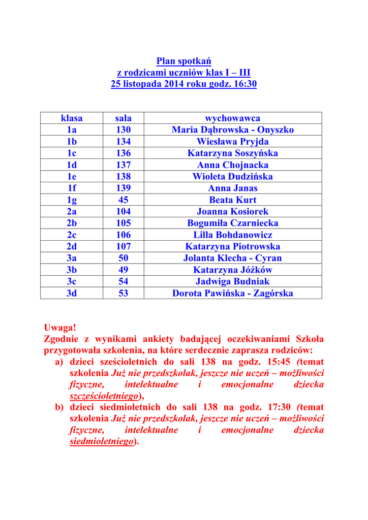 Plan spotkań z rodzicami uczniów klas I – III 25 listopada 2014 roku godz. 16:30 klasa 1a 1b 1c 1d 1e 1f 1g 2a 2b 2c 2d 3a 3b 3c 3d sala 130 134 136 137 138 139 45 104 105 106 107 50 49 54 53 wychowawca Maria Dąbrowska - Onyszko Wiesława Pryjda Katarzyna Soszyńska Anna Chojnacka Wioleta Dudzińska Anna Janas Beata Kurt Joanna Kosiorek Bogumiła Czarniecka Lilla Bohdanowicz Katarzyna Piotrowska Jolanta Klecha - Cyran Katarzyna Jóźków Jadwiga Budniak Dorota Pawińska - Zagórska Uwaga! Zgodnie z wynikami ankiety badającej oczekiwaniami Szkoła przygotowała szkolenia, na które serdecznie zaprasza rodziców: a) dzieci sześcioletnich do sali 138 na godz. 15:45 (temat szkolenia Już nie przedszkolak, jeszcze nie uczeń – możliwości fizyczne, intelektualne i emocjonalne dziecka szcześcioletniego), b) dzieci siedmioletnich do sali 138 na godz. 17:30 (temat szkolenia Już nie przedszkolak, jeszcze nie uczeń – możliwości fizyczne, intelektualne i emocjonalne dziecka siedmioletniego).