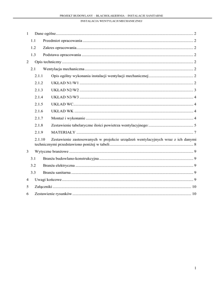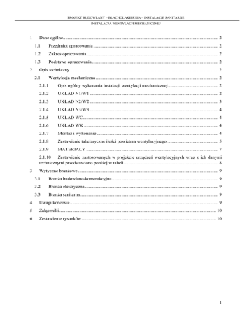 PROJEKT BUDOWLANY – BLACHOLAKIERNIA – INSTALACJE SANITARNE INSTALACJA WENTYLACJI MECHANICZNEJ 1 2 Dane ogólne..................................................................................................................................... 2 1.1 Przedmiot opracowania ........................................................................................................... 2 1.2 Zakres opracowania ................................................................................................................. 2 1.3 Podstawa opracowania ............................................................................................................ 2 Opis techniczny ............................................................................................................................... 2 2.1 Wentylacja mechaniczna ......................................................................................................... 2 2.1.1 Opis ogólny wykonania instalacji wentylacji mechanicznej ........................................... 2 2.1.2 UKŁAD N1/W1 .............................................................................................................. 2 2.1.3 UKŁAD N2/W2 .............................................................................................................. 3 2.1.4 UKŁAD N3/W3 .............................................................................................................. 4 2.1.5 UKŁAD WC.................................................................................................................... 4 2.1.6 UKŁAD WK ................................................................................................................... 4 2.1.7 Montaż i wykonanie ........................................................................................................ 4 2.1.8 Zestawienie tabelaryczne ilości powietrza wentylacyjnego: ........................................... 5 2.1.9 MATERIAŁY ................................................................................................................. 7 2.1.10 Zestawienie zastosowanych w projekcie urządzeń wentylacyjnych wraz z ich danymi technicznymi przedstawiono poniżej w tabeli ................................................................................. 8 3 Wytyczne branżowe ........................................................................................................................ 9 3.1 Branża budowlano-konstrukcyjna ........................................................................................... 9 3.2 Branża elektryczna .................................................................................................................. 9 3.3 Branża sanitarna ...................................................................................................................... 9 4 Uwagi końcowe ............................................................................................................................... 9 5 Załączniki ...................................................................................................................................... 10 6 Zestawienie rysunków ................................................................................................................... 10 1 PROJEKT BUDOWLANY – BLACHOLAKIERNIA – INSTALACJE SANITARNE INSTALACJA WENTYLACJI MECHANICZNEJ 1 1.1 Dane ogólne Przedmiot opracowania Przedmiotem niniejszego opracowania jest projekt budowlany instalacji wentylacji mechanicznej w projektowanym budynku blacharnio – lakierni z częścią biurową w Kielcach. 1.2 Zakres opracowania Opracowanie zakresem swym obejmuje: • Instalację wentylacji mechanicznej i klimatyzacyjnej. 1.3 Podstawa opracowania Podstawę niniejszego opracowania stanowią: • • • • • 2 2.1 Zlecenie od inwestora, Podkłady budowlane, Uzgodnienia międzybranżowe, Wytyczne technologiczne, Obowiązujące normy, przepisy i zarządzenia. Opis techniczny Wentylacja mechaniczna 2.1.1 Opis ogólny wykonania instalacji wentylacji mechanicznej W projektowanym budynku została przewidziana instalacja wentylacji mechanicznej oraz klimatyzacyjnej. Całość została podzielona na kilka odrębnych układów obsługujących pomieszczenia o różnych funkcjach technologicznych, a co za tym idzie różnym poziomie zabrudzenia powietrza. 2.1.2 UKŁAD N1/W1 Realizowany jest za pomocą centrali nawiewno-wywiewnej z odzyskiem ciepła typ VS-21-R-RHC/E firmy VTS wyposażonej w filtr EU4, wymiennik obrotowy, nagrzewnicę wodną oraz chłodnicę freonową. Układ ten obsługuje pomieszczenia części biurowej kondygnacji parteru i piętra. Dla utrzymania odpowiedniego komfortu oraz czystości powietrza zostaje ono poddane odpowiedniej obróbce w centrali zanim zostanie dostarczone do pomieszczenia. Dane centrali N1/W1: • • • Nawiew / Wywiew : VN1 = 1910 m3/h / VW1 = 1110 m3/h Temperatura nawiewu tn = + 20°C zimą, tn = + 18°C latem Qco = 13,93kW 2 PROJEKT BUDOWLANY – BLACHOLAKIERNIA – INSTALACJE SANITARNE INSTALACJA WENTYLACJI MECHANICZNEJ • • • • Qch = 13,70kW ∆Pn/w = 300 Pa / 300 Pa Ns n/w = 0,75 kW / 0,75 kW(płynna regulacja) m = 435 kg Projektowana centrala VS-21-R-RHC/E firmy VTS jest wyposażona w firmową automatykę. Zlokalizowana jest na dachu nad pomieszczeniem wystawowym. Całość powietrza nawiewanego jest to powietrze świeże, (nie przewidziano recyrkulacji). W okresie letnim nie przewiduje się odzysku chłodu z powietrza wywiewanego a co za tym idzie wymiennik obrotowy nie będzie uruchamiany. Wywiew z pomieszczeń komunikacji przewidziano pośrednio poprzez pomieszczenia szatni oraz WC. Przewiduje się ciągłą pracę układu N1/W1 wentylacji mechanicznej. W okresie nocnym intensywność pracy wentylacji można zmniejszyć za pomocą regulatorów obrotów silników wentylatorów do wartości zapewniającej min. 0,5w/h. 2.1.3 UKŁAD N2/W2 Realizowany jest za pomocą centrali nawiewno-wywi