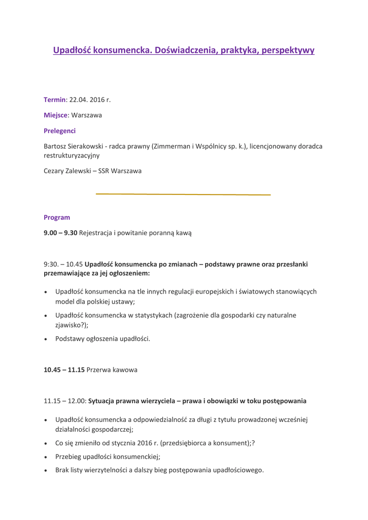 Upadłość konsumencka. Doświadczenia, praktyka, perspektywy Termin: 22.04. 2016 r. Miejsce: Warszawa Prelegenci Bartosz Sierakowski - radca prawny (Zimmerman i Wspólnicy sp. k.), licencjonowany doradca restrukturyzacyjny Cezary Zalewski – SSR Warszawa Program 9.00 – 9.30 Rejestracja i powitanie poranną kawą 9:30. – 10.45 Upadłość konsumencka po zmianach – podstawy prawne oraz przesłanki przemawiające za jej ogłoszeniem: Upadłość konsumencka na tle innych regulacji europejskich i światowych stanowiących model dla polskiej ustawy; Upadłość konsumencka w statystykach (zagrożenie dla gospodarki czy naturalne zjawisko?); Podstawy ogłoszenia upadłości. 10.45 – 11.15 Przerwa kawowa 11.15 – 12.00: Sytuacja prawna wierzyciela – prawa i obowiązki w toku postępowania Upadłość konsumencka a odpowiedzialność za długi z tytułu prowadzonej wcześniej działalności gospodarczej; Co się zmieniło od stycznia 2016 r. (przedsiębiorca a konsument);? Przebieg upadłości konsumenckiej; Brak listy wierzytelności a dalszy bieg postępowania upadłościowego. 12.00 – 13.00 Plan spłat czy układ z wierzycielami? Plan spłat i umorzenie zobowiązań; Umorzenie zobowiązań bez planu spłat; Układ jako alternatywa restrukturyzacji zobowiązań konsumenta w postępowaniu upadłościowym. 13.00 – 13.45 Przerwa obiadowa 13.45 – 14.45 Upadłość konsumencka w praktyce sądowej panel z sędzią Cezarym Zalewskim Wniosek o ogłoszenie upadłości – wymogi formalne; Podstawy ogłoszenia upadłości; Wina w niewypłacalności; Upadłość a majątek wspólny małżonków; Problematyka lokalu mieszkalnego lub domu jednorodzinnego upadłego; Ustalenie planu spłaty wierzycieli; Wykonanie planu spłaty – sprawozdania upadłego; Umorzenia niezaspokojonych zobowiązań i zakończenie postępowania. 14.45 – 15.15 Pytania i dyskusja 15.15 – Zakończenie szkolenia Organizator Partner wydarzenia