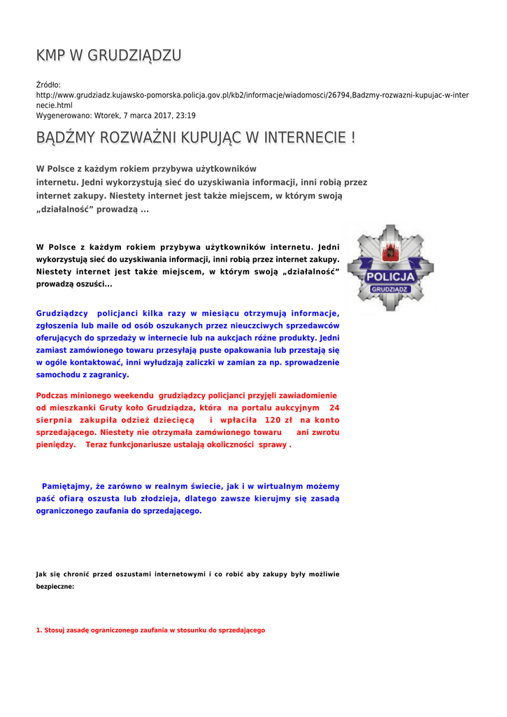 KMP W GRUDZIĄDZU Źródło: http://www.grudziadz.kujawsko-pomorska.policja.gov.pl/kb2/informacje/wiadomosci/26794,Badzmy-rozwazni-kupujac-w-inter necie.html Wygenerowano: Wtorek, 7 marca 2017, 23:19 BĄDŹMY ROZWAŻNI KUPUJĄC W INTERNECIE ! W Polsce z każdym rokiem przybywa użytkowników internetu. Jedni wykorzystują sieć do uzyskiwania informacji, inni robią przez internet zakupy. Niestety internet jest także miejscem, w którym swoją „działalność” prowadzą ... W Polsce z każdym rokiem przybywa użytkowników internetu. Jedni wykorzystują sieć do uzyskiwania informacji, inni robią przez internet zakupy. Niestety internet jest także miejscem, w którym swoją „działalność” prowadzą oszuści... Grudziądzcy policjanci kilka razy w miesiącu otrzymują informacje, zgłoszenia lub maile od osób oszukanych przez nieuczciwych sprzedawców oferujących do sprzedaży w internecie lub na aukcjach różne produkty. Jedni zamiast zamówionego towaru przesyłają puste opakowania lub przestają się w ogóle kontaktować, inni wyłudzają zaliczki w zamian za np. sprowadzenie samochodu z zagranicy. Podczas minionego weekendu grudziądzcy policjanci przyjęli zawiadomienie od mieszkanki Gruty koło Grudziądza, która na portalu aukcyjnym sierpnia zakupiła odzież dziecięcą i wpłaciła 120 zł sprzedającego. Niestety nie otrzymała zamówionego towaru pieniędzy. 24 na konto ani zwrotu Teraz funkcjonariusze ustalają okoliczności sprawy . Pamiętajmy, że zarówno w realnym świecie, jak i w wirtualnym możemy paść ofiarą oszusta lub złodzieja, dlatego zawsze kierujmy się zasadą ograniczonego zaufania do sprzedającego. Jak się chronić przed oszustami internetowymi i co robić aby zakupy były możliwie bezpieczne: 1. Stosuj zasadę ograniczonego zaufania w stosunku do sprzedającego 2. Korzystaj tylko ze znanych i sprawdzonych portali internetowych. 3. Przed kupnem na aukcji internetowej, przeczytaj komentarze o sprzedającym. Szczególną czujność powinna wzbudzić niewielka liczba komentarzy pozytywnych lub ich brak. 4. Przed zakupami w sklepie internetowym zasięgnij opinii o nim i sprawdź go. Zapytaj znajomych, sprawdź podany na stronie numer telefonu. W razie wątpliwości lepiej zrezygnuj z zakupów. 5. Sprawdź co kupujesz. 6. Przy zamówieniu sprzętu elektronicznego zapytaj o oprogramowanie i instrukcję obsługi. 7. Zachowaj swoją korespondencję ze sprzedawcą. W razie oszustwa łatwiej będzie go odnaleźć, a korespondencja będzie stanowić dowód przestępstwa. 8. Jeśli płacisz przelewem, zrób to na sprawdzony numer konta. W razie wątpliwości skontaktuj się ze sprzedającym za pomocą bezpiecznych linków. Nigdy nie odpowiadaj na oferty sprzedaży poza aukcjami. 9. "nie kupuj kota w worku" - pamiętaj, że nie możliwe jest aby towar był w cenie trzykrotnie niższej od identycznego towaru w sklepach, może wówczas pochodzić z przestępstwa lub wcale go nie otrzymasz i zostaniesz oszukany 10. Jeśli, mimo zachowania zasad ostrożności, dostaniesz zamiast zamówionego produktu puste pudełko, natychmiast zadzwoń na policję. Wtedy zapisana korespondencja i przesłana przez oszusta paczka będą stanowiły dowód przestępstwa. Autor: M_Solochewicz Publikacja: M_Solochewicz Ocena: 0/5 (0) Tweetnij