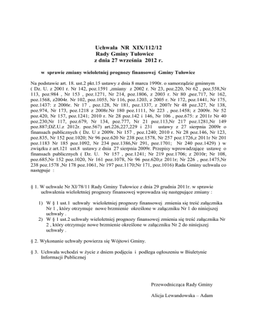 Uchwała NR XIX/112/12 Rady Gminy Tułowice z dnia 27 września 2012 r. w sprawie zmiany wieloletniej prognozy finansowej Gminy Tułowice Na podstawie art. 18. ust.2 pkt.15 ustawy z dnia 8 marca 1990r. o samorządzie gminnym ( Dz. U. z 2001 r. Nr 142, poz.1591 ,zmiany z 2002 r. Nr 23, poz.220, Nr 62 , poz.558,Nr 113, poz.984 , Nr 153 , poz.1271, Nr 214, poz.1806, z 2003 r. Nr 80 ,poz.717, Nr 162, poz.1568, z2004r. Nr 102, poz.1055, Nr 116, poz.1203, z 2005 r. Nr 172, poz.1441, Nr 175, poz.1437: z 2006r. Nr 17 , poz.128, Nr 181, poz.1337, z 2007r Nr 48 poz.327, Nr 138, poz.974, Nr 173, poz.1218 z 2008r.Nr 180 poz.1111, Nr 223 , poz.1458; z 2009r. Nr 52 poz.420, Nr 157, poz.1241; 2010 r. Nr 28 poz.142 i 146, Nr 106 , poz.675: z 2011r Nr 40 poz.230,Nr 117, poz.679, Nr 134, poz.777, Nr 21 poz.113,Nr 217 poz.1281,Nr 149 poz.887;DZ.U.z 2012r. poz.567) art.226,227,229 i 231 ustawy z 27 sierpnia 2009r o finansach publicznych ( Dz. U z 2009r. Nr 157 , poz.1240; 2010 r. Nr 28 poz.146, Nr 123, poz.835, Nr 152 poz.1020; Nr 96 poz.620 Nr 238 poz.1578, Nr 257 poz.1726,z 2011r Nr 201 poz.1183 Nr 185 poz.1092, Nr 234 poz.1386,Nr 291, poz.1701; Nr 240 poz.1429) ) w związku z art.121 ust.8 ustawy z dnia 27 sierpnia 2009r. Przepisy wprowadzające ustawę o finansach publicznych ( Dz. U. Nr 157 , poz.1241; Nr 219 poz.1706; z 2010r; Nr 108, poz.685,Nr 152 poz.1020, Nr 161 poz.1078, Nr 96 poz.620;z 2011r; Nr 226 , poz.1475,Nr 238 poz.1578 ,Nr 178 poz.1061, Nr 197 poz.1170;Nr 171, poz.1016) Rada Gminy uchwala co następuje : § 1. W uchwale Nr XI/78/11 Rady Gminy Tułowice z dnia 29 grudnia 2011r. w sprawie uchwalenia wieloletniej prognozy finansowej wprowadza się następujące zmiany : 1) W § 1 ust.1 uchwały wieloletniej prognozy finansowej zmienia się treść załącznika Nr 1 , który otrzymuje nowe brzmienie określone w załączniku Nr 1 do niniejszej uchwały . 2) W § 1 ust.2 uchwały wieloletniej prognozy finansowej zmienia się treść załącznika Nr 2 , który otrzymuje nowe brzmienie określone w załączniku Nr 2 do niniejszej uchwały . § 2. Wykonanie uchwały powierza się Wójtowi Gminy. § 3. Uchwała wchodzi w życie z dniem podjęcia i podlega ogłoszeniu w Biuletynie Informacji Publicznej Przewodnicząca Rady Gminy Alicja Lewandowska – Adam UZASADNIENIE Zmiany w WPF – załączniki nr 1 i 2 do WPF są niezbędne ze względu na dokonane zmiany budżetu na 2012r. zarządzeniami i uchwałą o numerach : 1)Zarządzenie Nr 124/2012 z 29.06.2012r Wójta Gminy Tułowice –dotyczyło wprowadzenia dotacji celowej w wysokości 3 900,00 zł na podstawie rządowego programu wspierania niektórych osób pobierających świadczenia pielęgnacyjne- środki do dyspozycji OPS. 2)Zarządzenie Nr 133/2012 z 08 sierpnia 2012 r. Wójta Gminy Tułowice – dotyczyło wprowadzenia do budżetu dotacji celowych w wysokości 9 689,00 zł z przeznaczeniem na dożywianie ( pomoc państwa) w kwocie 9 689,00 zł oraz dofinansowanie rządowego programu wspierania osób pobierających świadczenia pielęgnacyjne w kwocie 6 700,00 - środki do dyspozycji OPS 3)Zarządzenie Nr 136/2012 z dnia 21 sierpnia 2012r. . Wójta Gminy Tułowice – dotyczyło zmniejszenia budżetu o dotację celową w wysokości 19 437,00 zł z przeznaczeniem na realizację zadań w zakresie pomocy społecznej w wysokości 19 437,00 zł zmniejszenie planu dotyczącego stypendium dla uczniów . 4) Zarządzenie Nr 141/2012 z dnia 30 sierpnia 2012 r. Wójta Gminy Tułowice – dotyczyło wprowadzenia do budżetu dotacji celowej w wysokości 4 052,00 zł z przeznaczenie na dofinansowania zakupu podręczników dla uczniów w ramach rządowego programu „Wyprawka szkolna „ – środki do dyspozycji GZS 5) Zarządzenie Nr 144/2012 z dnia 10 września 2012 r. Wójta Gminy Tułowice – dotyczyło wprowadzenia do budżetu dotacji w wysokości 26 420,00 zł z przeznaczenie na wypłaty zasiłków stałych - środki do dyspozycji OPS 6)Uchwały Nr …/…/12 Rady Gminy Tułowice z dnia 27.09.2012r. – Zwiększenia dochodów bieżących o kwotę 21 003,93 zł ,zmniejszenia dochodów bieżących o kwotę 9 000,00 , zwiększenia dochodów majątkowych o kwotę 9 086,38 zł , zwiększenia wydatków bieżących o kwotę 3 000,00 zł , zwiększenia wydatków majątkowych o kwotę 18 090,31 zł. , a także przeniesień między działami , rozdziałami i paragrafami co w konsekwencji wpłynęło na zmniejszenie wydatków bieżących o kwotę 6 000,00 zł a zwiększenie wydatków majątkowych o kwotę 6 000,00 zł. . Budżet po dokonanych zmianach przedstawia się następująco : DOCHODY; Dochody bieżące Dochody majątkowe Dochody ogółem Przychody Dochody i przychody ogółem 12 615 972,93 461 282,63 13 077 255,56 1 202 244,75 14 279 500,31 zł zł zł zł zł WYDATKI : Wydatki bieżące Wydatki majątkowe Wydatki ogółem Rozchody Wydatki i rozchody ogółem 11 609 010,00 1 426 790,31 13 035 800,31 1 243 700,00 14 279 500,31 zł zł zł zł zł Zmiany dokonane w załączniku Nr 2 – Przedsięwzięcia dotyczyły „ 1) Zwiększenia wydatków inwestycyjnych przedsięwzięcia w Skarbiszowicach – „ Budowa Centrum Wypoczynku Rekreacji i Edukacji zwiększenie wydatków inwestycyjnych o kwotę 12 000,00 zł 2) Zwiększenie wydatków inwestycyjnych przedsięwzięcia „Budowa zaplecza socjalnego na boisku w Tułowicach „ – zwiększenie wydatków inwestycyjnych o kwotę 6 090,31 zł ( wyposażenie ) 3) Zwiększenie - wydatki bieżące zwiększenie dotacji podmiotowej dla TOK o kwotę 2 500,00 zł Załącznik Nr 1 i 2 do uchwały Wieloletnia Prognoza Finansowa odzwierciedla wyżej wymienione zmiany. Przewodnicząca Rady Gminy Alicja Lewandowska – Adam