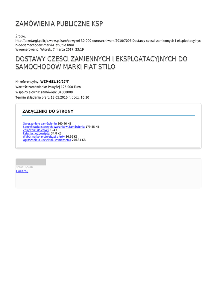 ZAMÓWIENIA PUBLICZNE KSP Źródło: http://przetargi.policja.waw.pl/zam/powyzej-30-000-euro/archiwum/2010/7006,Dostawy-czesci-zamiennych-i-eksploatacyjnyc h-do-samochodow-marki-Fiat-Stilo.html Wygenerowano: Wtorek, 7 marca 2017, 23:19 DOSTAWY CZĘŚCI ZAMIENNYCH I EKSPLOATACYJNYCH DO SAMOCHODÓW MARKI FIAT STILO Nr referencyjny: WZP-681/10/27/T Wartość zamówienia: Powyżej 125 000 Euro Wspólny słownik zamówień: 34300000 Termin składania ofert: 13.05.2010 r. godz. 10:30 ZAŁĄCZNIKI DO STRONY Ogłoszenie o zamówieniu 260.46 KB Specyfikacja Istotnych Warunków Zamówienia 179.85 KB Załączniki do edycji 124 KB Pytania i odpowiedzi 34.8 KB Wybór najkorzystniejszej oferty 36.16 KB Ogłoszenie o udzieleniu zamówienia 276.31 KB Ocena: 0/5 (0) Tweetnij
