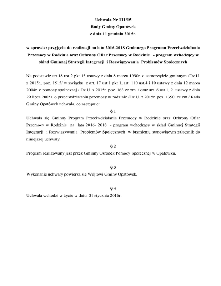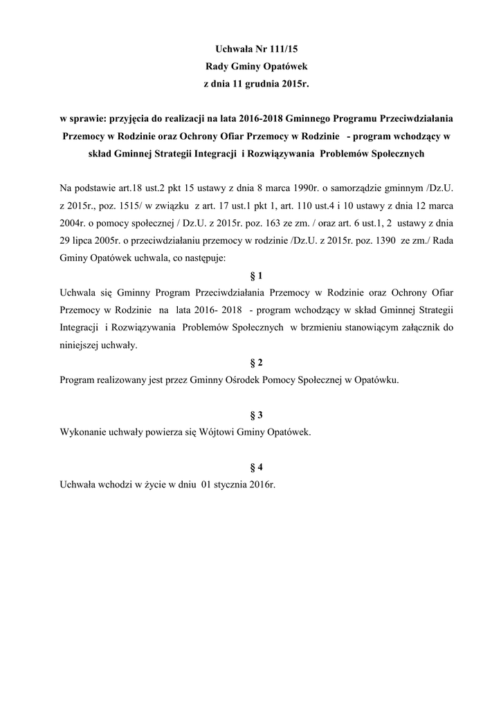 Uchwa a Nr 111/15 Rady Gminy Opatówek z dnia 11 grudnia 2015r. w sprawie: przyj#cia do realizacji na lata 2016-2018 Gminnego Programu Przeciwdzia ania Przemocy w Rodzinie oraz Ochrony Ofiar Przemocy w Rodzinie - program wchodz+cy w sk ad Gminnej Strategii Integracji i Rozwi+zywania Problemów Spo ecznych Na podstawie art.18 ust.2 pkt 15 ustawy z dnia 8 marca 1990r. o samorz dzie gminnym /Dz.U. z 2015r., poz. 1515/ w zwi zku z art. 17 ust.1 pkt 1, art. 110 ust.4 i 10 ustawy z dnia 12 marca 2004r. o pomocy spo#ecznej / Dz.U. z 2015r. poz. 163 ze zm. / oraz art. 6 ust.1, 2 ustawy z dnia 29 lipca 2005r. o przeciwdzia#aniu przemocy w rodzinie /Dz.U. z 2015r. poz. 1390 ze zm./ Rada Gminy Opatówek uchwala, co nast-puje: §1 Uchwala si- Gminny Program Przeciwdzia#ania Przemocy w Rodzinie oraz Ochrony Ofiar Przemocy w Rodzinie na lata 2016- 2018 - program wchodz cy w sk#ad Gminnej Strategii Integracji i Rozwi zywania Problemów Spo#ecznych w brzmieniu stanowi cym za# cznik do niniejszej uchwa#y. §2 Program realizowany jest przez Gminny O5rodek Pomocy Spo#ecznej w Opatówku. §3 Wykonanie uchwa#y powierza si- Wójtowi Gminy Opatówek. §4 Uchwa#a wchodzi w 7ycie w dniu 01 stycznia 2016r. Za# cznik do Uchwa#y Nr 111/15 Rady Gminy Opatówek z dnia 11 grudnia 2015r. Gminny Program Przeciwdzia ania Przemocyw Rodzinie oraz Ochrony Ofiar Przemocy w Rodzinie na terenie Gminy Opatówekna lata 2016-2018 SPIS TRE4CI I. Wst-p ........................................................................................................................1 II Charakterystyka zjawiska przemocy ......................................................................... 1 III Podstawa prawna Programu........................................................................................5 IV. Zasady dzia#ania Programu ........................................................................................6 V. Cel g#ówny Programu ............................................................................................... 6 VI. Cele szczegó#owe Programu ....................................................................................6 VII. Adresaci Programu ....................................................................................................7 VIII. Prognozowane efekty Programu ...............................................................................7 IX. Za#o7enia Programu .................................................................................................7 X. Termin realizacji Programu .......................................................................................7 XI. Realizatorzy Programu ............................................................................................8 XII. Dost-pne dane liczbowe na temat zjawiska przemocy w rodzinie w Gminie Opatówek w latach 2013 -2014 .............................................................................8 XIII. Zadania s#u7b powo#anych do niesienia pomocy ofiarom przemocy w rodzinie ................................................................................................................9 XIV. G#ówne i szczegó#owe dzia#ania w Gminie ............................................................10 XV. Ewaluacja ..............................................................................................................12 XVI. ?ród#a finansowania ..............................................................................................12 I. Wst#p Zjawisko przemocy w rodzinie, z uwagi na jej z#o7ono5@ zas#uguje na miano problemu interdyscyplinarnego i dlatego jest w kr-gu zainteresowaA zarówno naukowców, jak i osób na co dzieA pracuj cych z osobami ,, uwik#anymi" w przemoc domow . Ze wzgl-du na wieloaspektowo5@ zjawiska, przemoc ma ró7ne oblicza i przejawy. Dowodem tego jest ró7norodno5@ definicji i typologii poj-cia ,, przemoc domowa". z uwagi na interdyscyplinarny charakter zjawiska przemocy domowej, mo7emy rozpatrywa@ j z perspektywy psychologicznej, socjologicznej, prawnej, indywidualnej, systemowej, spo#ecznej.Zgodnie z art. 207 § 1 Kodeksu Karnego przemoc w rodzinie jest przest-pstwem, a sprawca przemocy ponosi prawn odpowiedzialno5@ za swoje czyny. Podstawowym aktem prawnym, reguluj cym zadania w zakresie przeciwdzia#ania przemocy w rodzinie, zasady post-powania wobec osób dotkni-tych przemoc w rodzinie jest ustawa o przeciwdzia#aniu przemocy w rodzinie, krajowy i wojewódzkie programy przeciwdzia#ania przemocy w rodzinie oraz gminne programy przeciwdzia#ania przemocy w rodzinie. Gminny Program Przeciwdzia#ania Przemocy w Rodzinie oraz Ochrony Ofiar Przemocy w Rodzinie ma za zadanie wyznacza@ g#ówne kierunki realizacji zadaA zwi zanych z mo7liwo5ci wyznaczania wszelkiego rodzaju dzia#aA maj cych na celu udzielania kompleksowej pomocy rodzinom z terenu Gminy Opatówek. Jego formu#a jest zgodna ze Strategi Integracji i Rozwi zywania Problemów Spo#ecznych gminy Opatówek na lata 2011 - 2018. Podstaw efektywnej pracy jest wspó#praca przedstawicieli s#u7b i instytucji, które na terenie gminy funkcjonuj w obszarze przeciwdzia#ania przemocy w rodzinie. I. Charakterystyka zjawiska przemocy w rodzinie Definicja przemocy Zgodnie z ustawa o przeciwdzia#aniu przemocy w rodzinie przemoc w rodzinie to „jednorazowe albo powtarzaj+ce si# umy9lne dzia anie lub zaniechanie naruszaj+ce prawa lub dobra osobiste osób wymienionych w pkt.1 ustawy, w szczególno9ci nara;aj+ce te osoby na niebezpiecze<stwo utraty ;ycia, zdrowia, naruszaj+ce ich godno9=, nietykalno9= cielesn+, wolno9=, w tym seksualn+, powoduj+ce szkody na ich zdrowiu fizycznym lub psychicznym, a tak;e wywo uj+ce cierpienia i krzywdy moralne u osób dotkni#tych przemoc+”. Wed#ug roboczej definicji, przyjmowanej przez polskich specjalistów, przemoc domowa to: dzia#anie lub zaniechanie dokonywane w ramach rodziny przez jednego z jej cz#onków przeciwko pozosta#ym, z wykorzystaniem istniej cej lub stworzonej przez okoliczno5ci przewagi si# lub w