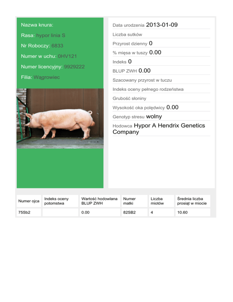 2013-01-09 Nazwa knura: Data urodzenia Rasa: hypor linia S Liczba sutków Nr Roboczy: 6833 Przyrost dzienny 0 % mięsa w tuszy 0.00 Numer w uchu: 0HV121 Numer licencyjny: 9929222 Filia: Wągrowiec Indeks 0 BLUP ZWH 0.00 Szacowany przyrost w tuczu Indeks oceny pełnego rodzeństwa Grubość słoniny Wysokość oka polędwicy Genotyp stresu 0.00 wolny Hypor A Hendrix Genetics Company Hodowca Numer ojca 75Sb2 Indeks oceny potomstwa Wartość hodowlana BLUP ZWH Numer matki Liczba miotów Średnia liczba prosiąt w miocie 0.00 82SB2 4 10.60