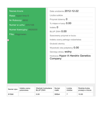 2012-12-22 Nazwa knura: Data urodzenia Rasa: hypor linia S Liczba sutków Nr Roboczy: 6832 Przyrost dzienny 0 % mięsa w tuszy 0.00 Numer w uchu: 0HV108 Numer licencyjny: 9929205 Filia: Wągrowiec Indeks 0 BLUP ZWH 0.00 Szacowany przyrost w tuczu Indeks oceny pełnego rodzeństwa Grubość słoniny Wysokość oka polędwicy Genotyp stresu 0.00 wolny Hypor A Hendrix Genetics Company Hodowca Numer ojca 81Sb8 Indeks oceny potomstwa Wartość hodowlana BLUP ZWH Numer matki Liczba miotów Średnia liczba prosiąt w miocie 0.00 59Sb4 7 10.00