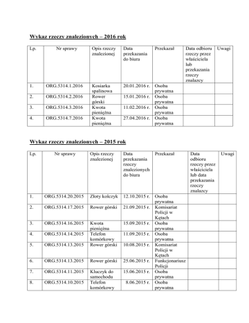 Wykaz rzeczy znalezionych – 2016 rok Wykaz rzeczy znalezionych