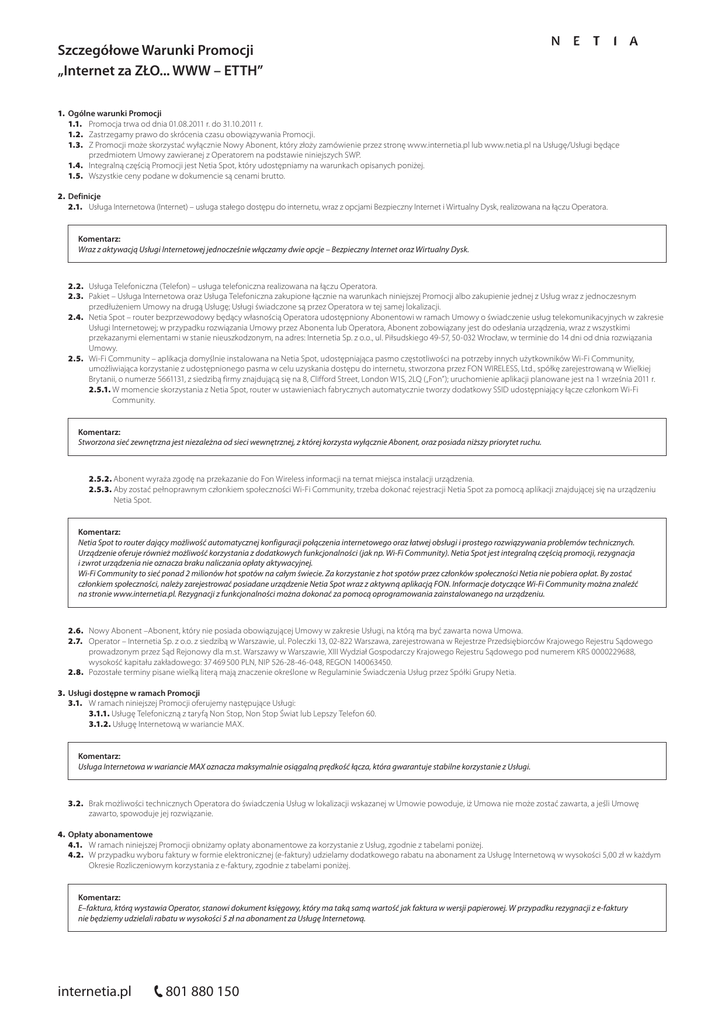 Szczegółowe Warunki Promocji „Internet za ZŁO... WWW – ETTH” 1. Ogólne warunki Promocji 1.1. Promocja trwa od dnia 01.08.2011 r. do 31.10.2011 r. 1.2. Zastrzegamy prawo do skrócenia czasu obowiązywania Promocji. 1.3. Z Promocji może skorzystać wyłącznie Nowy Abonent, który złoży zamówienie przez stronę www.internetia.pl lub www.netia.pl na Usługę/Usługi będące przedmiotem Umowy zawieranej z Operatorem na podstawie niniejszych SWP. 1.4. Integralną częścią Promocji jest Netia Spot, który udostępniamy na warunkach opisanych poniżej. 1.5. Wszystkie ceny podane w dokumencie są cenami brutto. 2. Definicje 2.1. Usługa Internetowa (Internet) – usługa stałego dostępu do internetu, wraz z opcjami Bezpieczny Internet i Wirtualny Dysk, realizowana na łączu Operatora. Komentarz: Wraz z aktywacją Usługi Internetowej jednocześnie włączamy dwie opcje – Bezpieczny Internet oraz Wirtualny Dysk. 2.2. Usługa Telefoniczna (Telefon) – usługa telefoniczna realizowana na łączu Operatora. 2.3. Pakiet – Usługa Internetowa oraz Usługa Telefoniczna zakupione łącznie na warunkach niniejszej Promocji albo zakupienie jednej z Usług wraz z jednoczesnym przedłużeniem Umowy na drugą Usługę; Usługi świadczone są przez Operatora w tej samej lokalizacji. 2.4. Netia Spot – router bezprzewodowy będący własnością Operatora udostępniony Abonentowi w ramach Umowy o świadczenie usług telekomunikacyjnych w zakresie Usługi Internetowej; w przypadku rozwiązania Umowy przez Abonenta lub Operatora, Abonent zobowiązany jest do odesłania urządzenia, wraz z wszystkimi przekazanymi elementami w stanie nieuszkodzonym, na adres: Internetia Sp. z o.o., ul. Piłsudskiego 49-57, 50-032 Wrocław, w terminie do 14 dni od dnia rozwiązania Umowy. 2.5. Wi-Fi Community – aplikacja domyślnie instalowana na Netia Spot, udostępniająca pasmo częstotliwości na potrzeby innych użytkowników Wi-Fi Community, umożliwiająca korzystanie z udostępnionego pasma w celu uzyskania dostępu do internetu, stworzona przez FON WIRELESS, Ltd., spółkę zarejestrowaną w Wielkiej Brytanii, o numerze 5661131, z siedzibą firmy znajdującą się na 8, Clifford Street, London W1S, 2LQ („Fon”); uruchomienie aplikacji planowane jest na 1 września 2011 r. 2.5.1. W momencie skorzystania z Netia Spot, router w ustawieniach fabrycznych automatycznie tworzy dodatkowy SSID udostępniający łącze członkom Wi-Fi Community. Komentarz: Stworzona sieć zewnętrzna jest niezależna od sieci wewnętrznej, z której korzysta wyłącznie Abonent, oraz posiada niższy priorytet ruchu. 2.5.2. Abonent wyraża zgodę na przekazanie do Fon Wireless informacji na temat miejsca instalacji urządzenia. 2.5.3. Aby zostać pełnoprawnym członkiem społeczności Wi-Fi Community, trzeba dokonać rejestracji Netia Spot za pomocą aplikacji znajdującej się na urządzeniu Netia Spot. Komentarz: Netia Spot to router dający możliwość automatycznej konfiguracji połączenia internetowego oraz łatwej obsługi i prostego rozwiązywania problemów technicznych. Urządzenie oferuje również możliwość korzystania z dodatkowych funkcjonalności (jak np. Wi-Fi Community). Netia Spot jest integralną częścią promocji, rezygnacja i zwrot urządzenia nie oznacza braku naliczania opłaty aktywacyjnej. Wi-Fi Community to sieć ponad 2 milionów hot spotów na całym świecie. Za korzystanie z hot spotów przez członków społeczności Netia nie pobiera opłat. By zostać członkiem społeczności, należy zarejestrować posiadane urządzenie Netia Spot wraz z aktywną aplikacją FON. Informacje dotyczące Wi-Fi Community można znaleźć na stronie www.internetia.pl. Rezygnacji z funkcjonalności można dokonać za pomocą oprogramowania zainstalowanego na urządzeniu. 2.6. Nowy Abonent –Abonent, który nie posiada obowiązującej Umowy w zakresie Usługi, na którą ma być zawarta nowa Umowa. 2.7. Operator – Internetia Sp. z o.o. z siedzibą w Warszawie, ul. Poleczki 13, 02-822 Warszawa, zarejestrowana w Rejestrze Przedsiębiorców Krajowego Rejestru Sądowego prowadzonym przez Sąd Rejonowy dla m.st. Warszawy w Warszawie, XIII Wydział Gospodarczy Krajowego Rejestru Sądowego pod numerem KRS 0000229688, wysokość kapitału zakładowego: 37 469 500 PLN, NIP 526-28-46-048, REGON 140063450. 2.8. Pozostałe terminy pisane wielką literą mają znaczenie określone w Regulaminie Świadczenia Usług przez Spółki Grupy Netia. 3. Usługi dostępne w ramach Promocji 3.1. W ramach niniejszej Promocji oferujemy następujące Usługi: 3.1.1. Usługę Telefoniczną z taryfą Non Stop, Non Stop Świat lub Lepszy Telefon 60. 3.1.2. Usługę Internetową w wariancie MAX. Komentarz: Usługa Internetowa w wariancie MAX oznacza maksymalnie osiągalną prędkość łącza, która gwarantuje stabilne korzystanie z Usługi. 3.2. Brak możliwości technicznych Operatora do świadczenia Usług w lokalizacji wskazanej w Umowie powoduje, iż Umowa nie może zostać zawarta, a jeśli Umowę zawarto, spowoduje jej rozwiązanie. 4. Opłaty abonamentowe 4.1. W ramach niniejszej Promocji obniżamy opłaty abonamentowe za korzystanie z Usług, zgodnie z tabelami poniżej. 4.2. W przypadku wyboru faktury w formie elektronicznej (e-faktury) udzielamy dodatkowego rabatu na abonament za Usługę Internetową w wysokości 5,00 zł w każdym Okresie Rozliczeniowym korzystania z e-faktury, zgodnie z tabelami poniżej. Komentarz: E–faktura, którą wystawia Operator, stanowi dokument księgowy, który ma taką samą wartość jak faktura w wersji papierowej. W przypadku rezygnacji z e-faktury nie będziemy udzielali rabatu w wysokości 5 zł na abonament za Usługę Internetową. internetia.pl 801 880 150 Szczegółowe Warunki Promocji „Internet za ZŁO... WWW – ETTH” 4.3. Dla usług świadczonych w technologii ETTH opłaty abonamentowe wynoszą: 4.3.1. W przypadku Pakietu: Opłata przez pierwsze 4 pełne Okresy Rozlicze