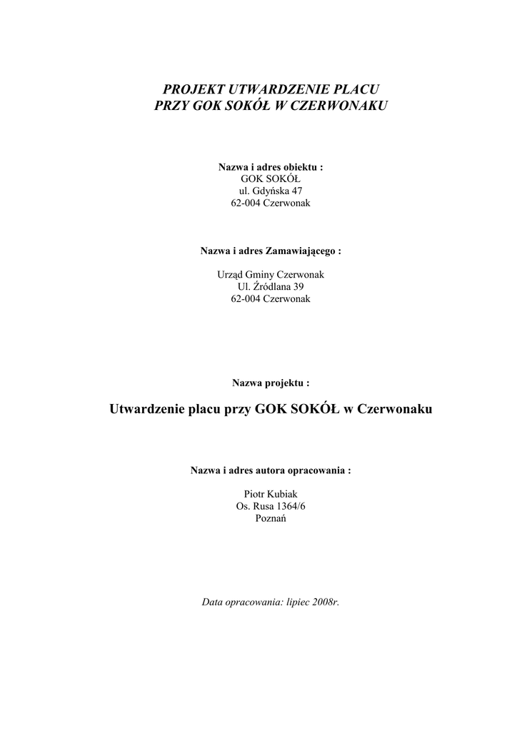 PROJEKT UTWARDZENIE PLACU PRZY GOK SOKÓŁ W CZERWONAKU Nazwa i adres obiektu : GOK SOKÓŁ ul. Gdyńska 47 62-004 Czerwonak Nazwa i adres Zamawiającego : Urząd Gminy Czerwonak Ul. Źródlana 39 62-004 Czerwonak Nazwa projektu : Utwardzenie placu przy GOK SOKÓŁ w Czerwonaku Nazwa i adres autora opracowania : Piotr Kubiak Os. Rusa 1364/6 Poznań Data opracowania: lipiec 2008r. ZAWARTOŚĆ PROJEKTU BUDOWLANEGO Utwardzenie placu przy GOK SOKÓŁ w Czerwonaku przy ul. Gdyńskiej 47 A. OPIS TECHNICZNY 1. Podstawy opracowania 2. Przedmiot i zakres projektu 3. Opis istniejącego zagospodarowania 4. Opis projektowanych rozwiązań 5. Uwagi końcowe B. RYSUNKI Rys. nr 1 – Plan sytuacyjny - skala 1:500 Rys. nr 2 – Plan wysokościowy - skala 1:500 Rys. nr 3 – Przekroje konstrukcyjne - skala 1:50 Rys. nr 4 – Szczegóły - skala 1:20 C. ZAŁĄCZNIKI 1. Uprawnienia budowlane 2. Zaświadczenie o przynaleŜności do izby OPIS TECHNICZNY 1. Podstawy opracowania 1.1. Aktualna mapa zasadnicza w skali 1:500. 1.2. Obowiązujące przepisy techniczno-budowlane. 1.3. Obowiązujące normy i aprobaty techniczne. 1.4. uzgodnienia konstrukcyjno – materiałowe z Inwestorem 2. Przedmiot i zakres projektu 2.1 Przedmiot opracowania Przedmiot inwestycji Studium opracowania utwardzenie placu przy GOK SOKÓŁ projekt budowlany Inwestor Urząd Gminy Czerwonak Ul. Źródlana 39 62-004 Czerwonak Piotr Kubiak Autor projektu 2.2. Zakres opracowania Rozwiązania techniczne opracowanie obejmuje rozwiązanie architektoniczno – konstrukcyjne i materiałowe utwardzenie placu przy GOK SOKÓŁ w Czerwonaku Opracowanie projektowe opracowanie zawiera część opisową i graficzną 2.3. Zakres prac do wykonania. a) roboty przygotowawcze – usunięcie warstwy zadarnionego gruntu - rozebranie istniejącego utwardzenia palcu b) roboty ziemne - budowa podłoŜa gruntowego pod kontr. nawierzchni - ukształtowanie poboczy gruntowych c) wykonanie konstrukcji podbudowy pod nawierzchnię z kostki betonowej. d) ułoŜenie nawierzchni z kostki betonowej gr. 8cm e) wykonanie opaski wokół budynku z kostki betonowej gr. 6 cm f) zieleń w zakresie trawników. 3. Opis istniejącego zagospodarowania Na działce znajduje się obiekt kubaturowy – budynek GOK SOKÓŁ. Pozostała część działki to teren zielony w części północnej porośnięty drzewami. Przez działkę nie przebiegają cieki lub strugi wodne. Na przedmiotowej działce oraz działkach sąsiednich nie ma naturalnych zbiorników wodnych. Teren nie posiada ogrodzenie. Projekt nie zakłada rozbiórki obiektów kubaturowych. Przebieg poszczególnych urządzeń istniejącego zagospodarowania i uzbrojenia terenu, wg mapy zasadniczej w skali 1:500 – rys. nr 1 „Plan sytuacyjny”. 4. Opis projektowanych rozwiązań 4.1. Dane ogólne Lokalizację, przyjęto w uzgodnieniu z uŜytkownikiem – GOK SOKÓŁ Plac: a) Warstwa jezdna z wibroprasowanej kostki betonowej brukowej o grubości 8cm na podsypce cementowo-piaskowej gr. 4 cm b) Podbudowa o gr. 15cm z kamienia łamanego stabilizowanego mechanicznie uzyskane w wyniku przekruszenia surowca skalnego lub kamieni narzutowych i otoczaków albo ziaren Ŝwiru większych od 8 mm. Kruszywo powinno być jednorodne bez zanieczyszczeń obcych i bez domieszek gliny. c) Warstwa z piasku średnioziarnistego gr. 10cm d) Grunt rodzimy Opaska: a) Warstwa z wibroprasowanej kostki betonowej brukowej o grubości 6cm na podsypce cementowo-piaskowej gr. 4 cm b) Podbudowa o gr. 10cm z warstwy piasku średnioziarnistego gr. 10cm c) Grunt rodzimy 4.2. Wymaganie dotyczące wykonania prac nawierzchniowych. Projektuje się utwardzenie placu z kostki betonowej w kolorze barwy jesieni oraz pastello. Proponuje się kostkę COLORMIX – AKROPOL lub inna o równowaŜnym wyglądzie. System Akropol składa się z 7 prostokątów o róŜnej wielkości i karbowanej powierzchni. Kostka betonowa winna posiadać aprobatę techniczną pozwalającą na jej stosowanie w budownictwie drogowym oraz atesty potwierdzające jej wytrzymałości, ścieralności i mrozoodporności. Piasek do wypełniania spoin między kostkami powinien być czysty i drobny. Po ułoŜeniu kostki betonowej naleŜy ją ubić wibratorem płytowym z zabezpieczoną płytą warstwą gumy lub plastyku. Płyta wibratora musi być zabezpieczona, by przy zagęszczaniu nie uszkodzić kostki. Prefabrykowane obrzeŜa powinny być wibrowane i prasowane hydraulicznie zgodnie z wymaganiami BN-80/6775-03 arkusz 01 i 04 „Prefabrykaty budowlane z betonu. Elementy nawierzchni dróg, ulic i parkingów”. NaleŜy je układać na podsypce piaskowej grubości 4cm. Elementy krawęŜników nie powinny mieć odchylenia większego niŜ 3 mm na 3 m od poziomu linii. KrawęŜniki naleŜy układać w odstępie co 5mm. Wszystkie spoiny w krawęŜnikach wypełnić zaprawą cementowo-piaskową 1:3. Światło krawęŜników (odległość góry krawęŜnika od nawierzchni) – 10cm – dla krawęŜników wystających PodłoŜa pod konstrukcję nawierzchni i krawęŜników naleŜy: a) Zagęścić na gł. do 0,5m (licząc od dna koryta) , wymagany wskaźnik zagęszczenia dla podłoŜa nawierzchni jezdni dróg i parkingów – Is = 1,0 a dla chodników Is = 0,98 b) Wyprofilować do wymaganego profilu jak dla poziomu nawierzchni z dokładnością do 1,0cm Wykonawca powinien załączyć karty techniczne oferowanych nawierzchni lub inne dokumenty określające jednoznacznie parametry techniczne proponowanych nawierzchni oraz dokumenty zaświadczające moŜliwość ich wykorzystania (Atest PZH, Aprobata lub Rekomendacja ITB). Wykaz wymaganego sprzętu: a) piła do cięcia kostki b) walec samojezdny wibracyjny c) wibrator powierzchniowy 4.3. Zieleń – rys. nr 1 Po ukształtowaniu powierzchni przeznaczonych pod zieleń, wykonaniu koniecznych przesadzeń zieleni istniejącej, przekopaniu zadarnionego terenu i nawiezieniu warstwy humusu gr. 2cm naleŜy wykonać trawnik dywanowy z nawoŜeniem. 5. Uwagi końcowe 5.1. Działka nie zna