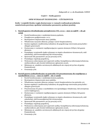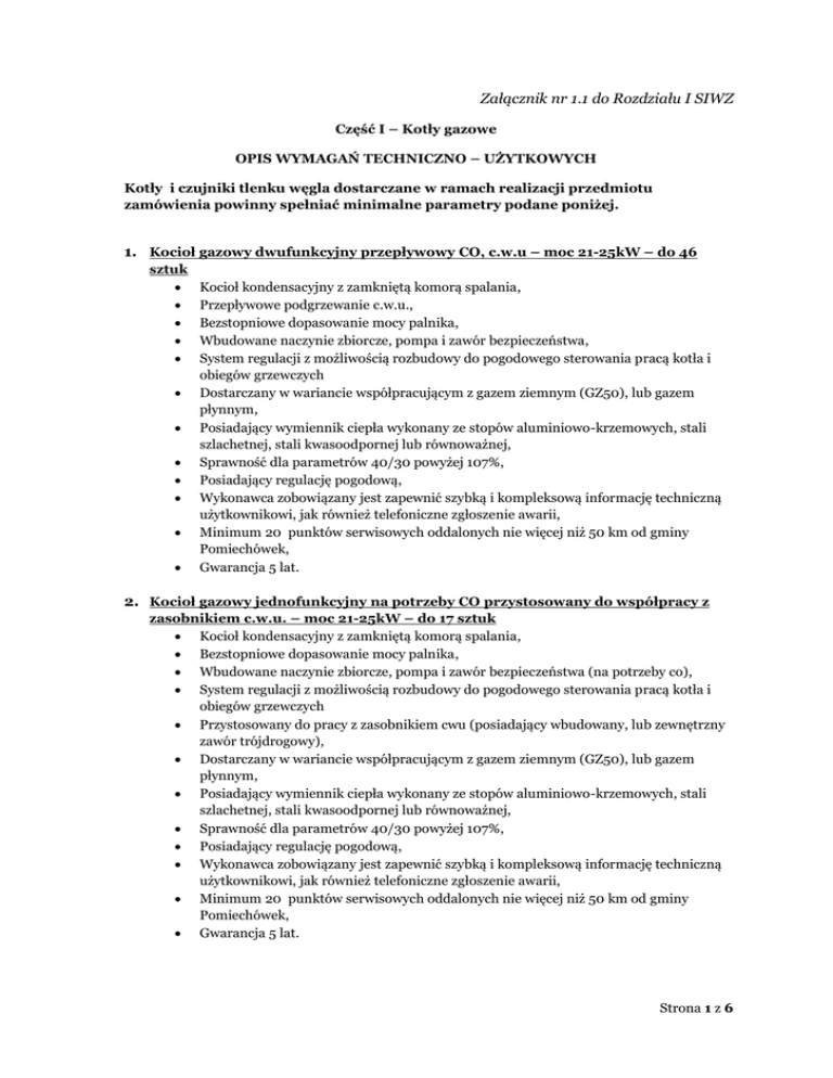 Załącznik nr 1.1 do Rozdziału I SIWZ Część I – Kotły gazowe OPIS WYMAGAŃ TECHNICZNO – UŻYTKOWYCH Kotły i czujniki tlenku węgla dostarczane w ramach realizacji przedmiotu zamówienia powinny spełniać minimalne parametry podane poniżej. 1. Kocioł gazowy dwufunkcyjny przepływowy CO, c.w.u – moc 21-25kW – do 46 sztuk Kocioł kondensacyjny z zamkniętą komorą spalania, Przepływowe podgrzewanie c.w.u., Bezstopniowe dopasowanie mocy palnika, Wbudowane naczynie zbiorcze, pompa i zawór bezpieczeństwa, System regulacji z możliwością rozbudowy do pogodowego sterowania pracą kotła i obiegów grzewczych Dostarczany w wariancie współpracującym z gazem ziemnym (GZ50), lub gazem płynnym, Posiadający wymiennik ciepła wykonany ze stopów aluminiowo-krzemowych, stali szlachetnej, stali kwasoodpornej lub równoważnej, Sprawność dla parametrów 40/30 powyżej 107%, Posiadający regulację pogodową, Wykonawca zobowiązany jest zapewnić szybką i kompleksową informację techniczną użytkownikowi, jak również telefoniczne zgłoszenie awarii, Minimum 20 punktów serwisowych oddalonych nie więcej niż 50 km od gminy Pomiechówek, Gwarancja 5 lat. 2. Kocioł gazowy jednofunkcyjny na potrzeby CO przystosowany do współpracy z zasobnikiem c.w.u. – moc 21-25kW – do 17 sztuk Kocioł kondensacyjny z zamkniętą komorą spalania, Bezstopniowe dopasowanie mocy palnika, Wbudowane naczynie zbiorcze, pompa i zawór bezpieczeństwa (na potrzeby co), System regulacji z możliwością rozbudowy do pogodowego sterowania pracą kotła i obiegów grzewczych Przystosowany do pracy z zasobnikiem cwu (posiadający wbudowany, lub zewnętrzny zawór trójdrogowy), Dostarczany w wariancie współpracującym z gazem ziemnym (GZ50), lub gazem płynnym, Posiadający wymiennik ciepła wykonany ze stopów aluminiowo-krzemowych, stali szlachetnej, stali kwasoodpornej lub równoważnej, Sprawność dla parametrów 40/30 powyżej 107%, Posiadający regulację pogodową, Wykonawca zobowiązany jest zapewnić szybką i kompleksową informację techniczną użytkownikowi, jak również telefoniczne zgłoszenie awarii, Minimum 20 punktów serwisowych oddalonych nie więcej niż 50 km od gminy Pomiechówek, Gwarancja 5 lat. Strona 1 z 6 3. Kocioł gazowy jednofunkcyjny na potrzeby CO przystosowany do współpracy z zasobnikiem c.w.u. – moc 26-34kW –do 4 sztuk Kocioł gazowy o mocy 26-34 kW, Kocioł kondensacyjny z zamkniętą komorą spalania, Bezstopniowe dopasowanie mocy palnika, System regulacji z możliwością rozbudowy do pogodowego sterowania pracą kotła i obiegów grzewczych, Przystosowany do pracy z zasobnikiem c.w.u., Dostarczany w wariancie współpracującym z gazem ziemnym (GZ50), lub gazem płynnym, Posiadający wymiennik ciepła wykonany ze stopów aluminiowo-krzemowych, stali szlachetnej, stali kwasoodpornej lub równoważnej, Sprawność dla parametrów 40/30 powyżej 108%, Posiadający regulację pogodową, Wykonawca zobowiązany jest zapewnić szybką i kompleksową informację techniczną użytkownikowi, jak również telefoniczne zgłoszenie awarii, Minimum 20 punktów serwisowych oddalonych nie więcej niż 50 km od gminy Pomiechówek, Gwarancja 5 lat. 4. Kocioł gazowy jednofunkcyjny na potrzeby CO przystosowany do współpracy z zasobnikiem c.w.u. – moc 37-40kW – do 1 sztuki Kocioł gazowy o mocy 37-40 kW, Kocioł kondensacyjny z zamkniętą komorą spalania, Bezstopniowe dopasowanie mocy palnika, System regulacji z możliwością rozbudowy do pogodowego sterowania pracą kotła i obiegów grzewczych, Przystosowany do pracy z zasobnikiem c.w.u., Dostarczany w wariancie współpracującym z gazem ziemnym (GZ50), lub gazem płynnym, Posiadający wymiennik ciepła wykonany ze stopów aluminiowo-krzemowych, stali szlachetnej, stali kwasoodpornej lub równoważnej, Sprawność dla parametrów 40/30 powyżej 108%, Posiadający regulację pogodową, Wykonawca zobowiązany jest zapewnić szybką i kompleksową informację techniczną użytkownikowi, jak również telefoniczne zgłoszenie awarii, Minimum 20 punktów serwisowych oddalonych nie więcej niż 50 km od gminy Pomiechówek, Gwarancja 5 lat. 5. Czujnik tlenku węgla (czadu) – do 68 sztuk Czujnik przeznaczony do pracy w lokalach mieszkalnych, Temperatura pracy -10oC – 40oC, Wyświetlacz LCD, Łatwy i prosty sposób montażu, Rodzaj czujnika: elektrochemiczny, Żywotność sensora co najmniej 10 lat, Czujnik musi monitorować ciągle stężenie tlenku węgla, Powiadomienia optyczne i dźwiękowe, Głośność nie większa niż 85db, Sygnalizacja za pomocą wbudowanych diod, Strona 2 z 6 Pomiar stężenia w zakresie od 30ppm, Zgodność z normą PN – EN 50291-1:2010 dla domowych detektorów tlenku węgla – do każdej sztuki czujnika powinno zostać załączone potwierdzenie spełnienia wymagań ww. normy, zasilanie bakteryjne – baterie załączone do urządzenia, Przycisk TEST pozwalający sprawdzić poprawność działania czujnika, Przycisk HUSH umożliwiający wyciszenie alarmu, Sygnalizacja końca żywotności czujnika, Sygnalizacja słabych baterii, Gwarancja 5 lat. Strona 3 z 6 Załącznik nr 1.2. do Rozdziału I SIWZ Część II – Kotły olejowe OPIS WYMAGAŃ TECHNICZNO – UŻYTKOWYCH Dostarczone kotły w ramach realizacji przedmiotu zamówienia powinny spełniać minimalne parametry podane poniżej. 1. Kocioł olejowy dwufunkcyjny o mocy 23-25kW – do 3 sztuk Olejowy kocioł kondensacyjny do pracy z płynnie obniżaną temperaturą kotła. Z dwustopniowym, palnikiem olejowym, Kondensacyjny wymiennik ciepła z materiału odpornego na korozję, Możliwość pracy zależnej i niezależnej od powietrza w pomieszczeniu, Wysoce skuteczna izolacja cieplna wraz z obudową stalową, Wbudowana pompa o wysokiej klasie energetycznej, Wbudowany filtr oleju, System regulacji z możliwością rozbudowy do pogodowego sterowania pracą kotła i obiegów grzewczych, Panel obsługowy w języku polskim, w wyświ