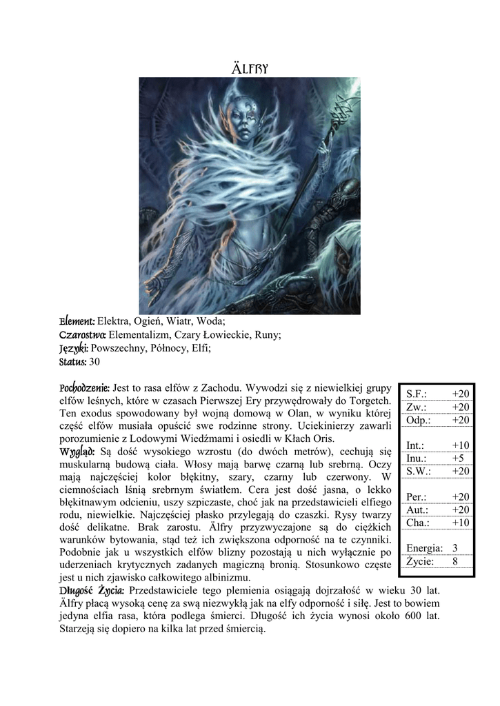 Älfry ę Elektra, Ogień, Wiatr, Woda; Elementalizm, Czary Łowieckie, Runy; Powszechny, Północy, Elfi; 30 Jest to rasa elfów z Zachodu. Wywodzi się z niewielkiej grupy S.F.: elfów leśnych, które w czasach Pierwszej Ery przywędrowały do Torgetch. Zw.: Ten exodus spowodowany był wojną domową w Olan, w wyniku której Odp.: część elfów musiała opuścić swe rodzinne strony. Uciekinierzy zawarli porozumienie z Lodowymi Wiedźmami i osiedli w Kłach Oris. Int.: ą Są dość wysokiego wzrostu (do dwóch metrów), cechują się Inu.: muskularną budową ciała. Włosy mają barwę czarną lub srebrną. Oczy S.W.: mają najczęściej kolor błękitny, szary, czarny lub czerwony. W ciemnościach lśnią srebrnym światłem. Cera jest dość jasna, o lekko błękitnawym odcieniu, uszy szpiczaste, choć jak na przedstawicieli elfiego Per.: rodu, niewielkie. Najczęściej płasko przylegają do czaszki. Rysy twarzy Aut.: dość delikatne. Brak zarostu. Älfry przyzwyczajone są do ciężkich Cha.: warunków bytowania, stąd też ich zwiększona odporność na te czynniki. Podobnie jak u wszystkich elfów blizny pozostają u nich wyłącznie po Energia: uderzeniach krytycznych zadanych magiczną bronią. Stosunkowo częste Życie: jest u nich zjawisko całkowitego albinizmu. ł ść Ż Przedstawiciele tego plemienia osiągają dojrzałość w wieku 30 lat. Älfry płacą wysoką cenę za swą niezwykłą jak na elfy odporność i siłę. Jest to bowiem jedyna elfia rasa, która podlega śmierci. Długość ich życia wynosi około 600 lat. Starzeją się dopiero na kilka lat przed śmiercią. +20 +20 +20 +10 +5 +20 +20 +20 +10 3 8 Alfom wystarczają trzy godziny snu na dzień, nie chorują również na większość chorób, które dotykają ludzi. W przeciwieństwie do swych krewniaków z Olan Älfry są plemieniem niespokojnym, ocenianym przez swych krewniaków jako aż nazbyt skorych do rozlewu krwi. Są być może nieco mniej wrażliwi i bystrzy, braki te jednak nadrabiają niezwykłą, jak na elfy, silą i żywotnością. Są rodem dumnym i odważnym. Cenią odwagę, męstwo i niezależność. W walce są nieustępliwi i okrutni. Ciężkie warunki życia na północy uczyniły z nich twardy lud. Lubią sprawdzać się w trudnych sytuacjach i szanują tych, którzy umieją sprostać wyzwaniom. Rozlew krwi ich pobudza. Zwykle nie spoufalają się z innymi rasami – choć jeśli trzeba – potrafią docenić ich honor i waleczność. Pogardzają plemieniem koboldów i utra, uważając ich za tchórzy, którzy zwykle znajdują się tylko z niewłaściwej strony broni. Zamieszkują piękne lodowe miasta i pałace, wyrzeźbione głęboko we wnętrzu lodowców Kłów Oris. To do nich należą jedyne w Torgetch kopalnie diamentów, z których rasa ta ciągnie niebywałe zyski. Dodatkowych źródeł dochodu dostarcza im handel skórami srebrnych lisów, fok, niedźwiedzi i wilczośpiewców – są bowiem również doskonałymi myśliwymi. Sprzedają również kości i lód. Na ogół lubią muzykę, nie są jednak szczególnie utalentowani w tej dziedzinie. Ozdoby, które wyrabiają są proste, lecz piękne i cechuje je doskonałe wyczucie proporcji, właściwe elfim rzemieślnikom. Diamentów często nie szlifują do końca odnajdując ich urok również w półsurowej formie. Wykonane przez siebie precjoza wymieniają często na pożywienie, dobrą broń i srebro, którego brak na Zachodzie. Są jedną z najbogatszych ras – nawet najuboższego myśliwego stać na płaszcz obszyty srebrnym lisem i diamentowy pierścień. Zwykle noszą dopasowaną skórzaną odzież ze złotymi obszyciami, szerokie złocone pasy, płaszcze z kapturami obszyte srebrnym futrem, wysokie buty i rękawice z cienkiej skórki. Wielu nosi irokezy i ozdoby w uszach i w nosie, wykonane z kości i srebra. Kobiety często golą głowy po bokach czaszki, lub całkowicie. Popularne są także wśród nich tatuaże, zwłaszcza na głowie i twarzy. Wszystkie Älfry są wyznawcami Religii Północy, czcząc przede wszystkim Ridvinę i Aurena. Älfry są doskonałymi wojownikami i strzelcami. Równie dobrze idzie im łowiectwo jak i korsarstwo, dlatego też często można ich spotkać na wodach zachodnich mórz. Często wynajmują również swe miecze jako najemnicy. Nie mają cierpliwości do magii Astralnej, przedkładają nad nią korzyści bojowe jakie niesie ze sobą Władanie Energią. Niektóre z ich kobiet zostają także czarownicami, czerpiąc wiedzę od Lodowych Wiedźm. Znani wśród nich są także bardowie, nieliczni zaś posiadają talent Smoczego Maga czy Kowala Magii. Sugerowane biegłości: topór, szabla, dwuręczne, drzewcowe piesze (włócznia), łuk; ę ść - Przetrwanie; ś - Elfi wzrok; - Odporność na mróz (-50% obr. od zimna); - Talent: dwuręczne lub łuk prosty (+10) Kompozytowy łuk elfi, Pierścień z diamentem (10 D.), płaszcz ze srebrnych lisów (5 D) i K10 D.