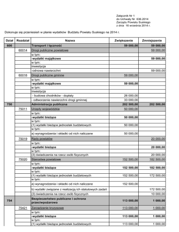 Załącznik Nr 1 do Uchwały Nr 636.2014 Zarządu Powiatu Suskiego z dnia 16 września 2014 r. Dokonuje się przeniesień w planie wydatków Budżetu Powiatu Suskiego na 2014 r. Dział Rozdział 600 Nazwa Transport i łączność 60014 Zwiększenie 59 000,00 Drogi publiczne powiatowe Drogi publiczne gminne w tym: -wydatki majątkowe w tym: inwestycja - budowa chodników - dopłaty - odtworzenie nawierzchni drogi gminnej 750 Administracja publiczna 75011 Urzędy wojewódzkie w tym: -wydatki bieżące w tym: (1) wydatki bieżące jednostek budżetowych w tym: a) wynagrodzenia i składki od nich naliczane 75019 59 000,00 59 000,00 59 000,00 59 000,00 26 000,00 33 000,00 202 500,00 50 000,00 50 000,00 50 000,00 Rady powiatów Starostwa powiatowe w tym: -wydatki bieżące w tym: (1) wydatki bieżące jednostek budżetowych w tym: a) wynagrodzenia i składki od nich naliczane 20 000,00 20 000,00 20 000,00 152 500,00 182 500,00 152 500,00 182 500,00 152 500,00 172 500,00 152 500,00 b) wydatki związane z realizacją ich statutowych zadań 172 500,00 (3) świadczenia na rzecz osób fizycznych 754 75421 202 500,00 50 000,00 w tym: -wydatki bieżące w tym: (3) świadczenia na rzecz osób fizycznych 75020 59 000,00 59 000,00 w tym: -wydatki majątkowe w tym: inwestycja -odnowa nawierzchni 60016 Zmniejszenie 10 000,00 Bezpieczeństwo publiczne i ochrona przeciwpożarowa 113 000,00 1 000,00 Zarządzanie kryzysowe 113 000,00 1 000,00 113 000,00 1 000,00 113 000,00 1 000,00 w tym: -wydatki bieżące w tym: (1) wydatki bieżące jednostek budżetowych w tym: a) wynagrodzenia i składki od nich naliczane 1 000,00 b) wydatki związane z realizacją ich statutowych zadań 758 75818 113 000,00 Różne rozliczenia 112 000,00 Rezerwy ogólne i celowe 112 000,00 w tym: -wydatki bieżące w tym: (1) wydatki bieżące jednostek budżetowych w tym: 112 000,00 112 000,00 b) wydatki związane z realizacją ich statutowych zadań 801 80130 Oświata i wychowanie 100 105,52 100 105,52 Szkoły zawodowe 100 105,52 500,00 100 105,52 500,00 w tym: -wydatki bieżące w tym: (1) wydatki bieżące jednostek budżetowych w tym: 500,00 b) wydatki związane z realizacją ich statutowych zadań (3) świadczenia na rzecz osób fizycznych (4) wydatki na programy finansowane z udziałem środków, o których mowa w arty. 5 ust. 1 pkt. 2 - 3, w części związanej z realizacją zadań jst (wydatki bieżące) 80195 112 000,00 500,00 500,00 99 605,52 Pozostała działalność 99 605,52 w tym: -wydatki bieżące w tym: (1) wydatki bieżące jednostek budżetowych w tym: 99 605,52 99 605,52 b) wydatki związane z realizacją ich statutowych zadań Ogółem: 99 605,52 474 605,52 474 605,52