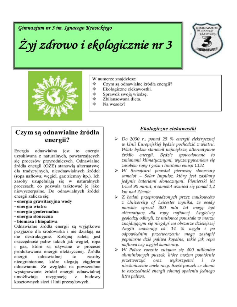 Gimnazjum nr 3 im. Ignacego Krasickiego Żyj zdrowo i ekologicznie nr 3 W numerze znajdziesz: Czym są odnawialne źródła energii? Ekologiczne ciekawostki. Sprawdź swoją wiedzę. Zbilansowana dieta. Na wesoło? Czym są odnawialne źródła energii? Energia odnawialna jest to energia uzyskiwana z naturalnych, powtarzających się procesów przyrodniczych. Odnawialne źródła energii (OZE) stanowią alternatywę dla tradycyjnych, nieodnawialnych źródeł (ropa naftowa, węgiel, gaz ziemny itp.). Ich zasoby uzupełniają się w naturalnych procesach, co pozwala traktować je jako niewyczerpalne. Do odnawialnych źródeł energii zalicza się: - energia grawitacyjna wody - energia wiatru - energia geotermalna - energia słoneczna - biomasa i biopaliwa Odnawialne źródła energii są wyjątkowo przyjazne dla środowiska i nie działają na nie destrukcyjnie. Kolejną zaletą jest oszczędność paliw takich jak węgiel, ropa i gaz, które są używane w procesie produkowania energii elektrycznej. Źródła energii odnawialnej to zasoby nieograniczone, które ulegają ciągłemu odnawianiu. Ze względu na powszechne występowanie źródeł energii odnawialnej umożliwiają rezygnację z budowy kosztownych sieci i linii przesyłowych. Ekologiczne ciekawostki Do 2030 r., ponad 25 % energii elektrycznej w Unii Europejskiej będzie pochodzić z wiatru. Wiatr będzie stanowił największe, alternatywne źródło energii. Będzie spowodowane to zmianami klimatycznymi, wyczerpywaniem się zasobów ropy i gazu i limitami emisji CO2 W Szwajcarii powstał pierwszy słoneczny samolot – Solar Impulse, który jest zasilany jedynie bateriami słonecznymi. Pionierski lot trwał 90 minut, a samolot wzniósł się ponad 1,2 km nad Ziemię. Z badań przeprowadzonych przez naukowców z University of Leicester wynika, że osady morskie sprzed 300 mln lat mogą być alternatywą dla ropy naftowej. Angielscy geolodzy odkryli, że mułowce powstałe w morzu znajdującym się niegdyś na obszarze dzisiejszej Anglii zawierają ok. 14 % węgla i po odpowiednim przetworzeniu mogą zastąpić popularne dziś paliwa kopalne, takie jak ropa naftowa czy węgiel kamienny. W Polsce rocznie zużywa się 400 milionów aluminiowych puszek, które można powtórnie przetworzyć oraz wykorzystać i to nieskończenie wiele razy. Sześć puszek ze złomu to oszczędność energii równej spaleniu jednego litra paliwa. 1. 2. 3. 4. 5. 6. 7. 8. 9. 10. 11. 12. 13. 14. 15. 16. 17. Jest niezbędne do życia ludzi, roślin i zwierząt. Inaczej energia termiczna skał znajdująca się we wnętrzu Ziemi. „Czarne złoto”. Skupisko kilku elektrowni wiatrowych. Gaz powstający w procesie fermentacji lub na wysypiskach śmieci. Wszystkie substancje pochodzenia roślinnego lub zwierzęcego ulegające biodegradacji. Zielone „płuca Ziemi”. Urządzenie, w którym energia słoneczna zamienia się na energię cieplną Jej siła porusza turbinę w elektrowni wodnej. Element mechanizmu napędowego elektrowni wodnej lub wiatrowej. Siła napędowa wiatraków. Jednostka mocy. Nauka o funkcjonowaniu przyrody. Jakie państwo w Europie wytwarza najwięcej energii z wykorzystaniem źródeł geotermalnych. Potoczna nazwa kolektorów słonecznych. Ważny proces zachodzący w roślinach. Rodzaj paliwa- może być ziemny, łupkowy. Zbilansowana dieta Aby wzmocnić swoją odporność przed sezonem grypowym powinniśmy korzystać z dobrodziejstw przyrody w okresie letnim. Stosowanie w codziennej diecie sezonowych warzyw i owoców daje wymierne skutki, zmniejszając prawdopodobieństwo zachorowania. Największe znaczenie mają produkty bogate w antyoksydanty (przeciwutleniacze). Zaliczamy do nich witaminę C, A, E. Witaminy te występują obficie w sezonowych owocach (czerwona i czarna porzeczka, truskawki, jabłka). Dieta powinna także zawierać warzywa zielone, takie, jak: sałata, kapusta, szpinak. Jeśli chcemy szybko dostarczyć większej ilości witamin, pijmy soki owocowe i owocowo – warzywne (np. marchwiowo – jabłkowy). Najlepiej spożywać te świeżo wyciśnięte, ponieważ dostarczają najwięcej wartości odżywczych. Skuteczne w zwiększeniu odporności są jogurty naturalne, które pobudzają nasz układ odpornościowy. Przygotowując organizm do sezonu grypowego, warto ograniczyć bądź całkowicie wyeliminować stosowanie używek. Nadużywanie alkoholu niszczy witaminy, które dostarczamy organizmowi. Negatywne skutki przynosi nadmierne picie kawy oraz palenie papierosów. Używki te wypłukują mikroelementy, powodując zmniejszenie odporności. NA WESOŁO ? Zimowe popołudnie. Piękna dama wychodzi na spacer w futrze i spotyka na ulicy członków ekologicznej organizacji Greenpeace. - Jak pani nie wstyd nosić futro zdarte z żywych norek? - To nie norki, to poliestry. - A czy pani wie, ile poliestrów musiało oddać życie, żeby pani miała futro?! Autorzy: M.Cichocka – Mróz, B. Kwiatkowska.