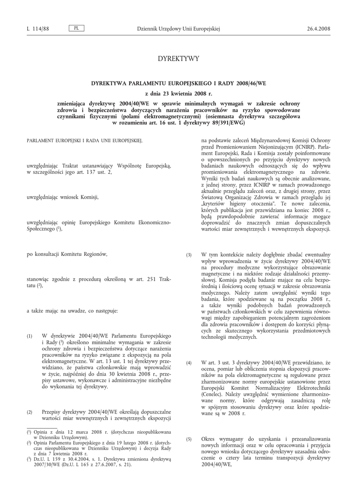 L 114/88 PL Dziennik Urzędowy Unii Europejskiej 26.4.2008 DYREKTYWY DYREKTYWA PARLAMENTU EUROPEJSKIEGO I RADY 2008/46/WE z dnia 23 kwietnia 2008 r. zmieniająca dyrektywę 2004/40/WE w sprawie minimalnych wymagań w zakresie ochrony zdrowia i bezpieczeństwa dotyczących narażenia pracowników na ryzyko spowodowane czynnikami fizycznymi (polami elektromagnetycznymi) (osiemnasta dyrektywa szczegółowa w rozumieniu art. 16 ust. 1 dyrektywy 89/391/EWG) na podstawie zaleceń Międzynarodowej Komisji Ochrony przed Promieniowaniem Niejonizującym (ICNIRP). Parlament Europejski, Rada i Komisja zostały poinformowane o upowszechnionych po przyjęciu dyrektywy nowych badaniach naukowych odnoszących się do wpływu promieniowania elektromagnetycznego na zdrowie. Wyniki tych badań naukowych są obecnie analizowane, z jednej strony, przez ICNIRP w ramach prowadzonego aktualnie przeglądu zaleceń oraz, z drugiej strony, przez Światową Organizację Zdrowia w ramach przeglądu jej „kryteriów higieny otoczenia”. Te nowe zalecenia, których publikacja jest przewidziana na koniec 2008 r., będą prawdopodobnie zawierać informacje mogące doprowadzić do znacznych zmian dopuszczalnych wartości miar zewnętrznych i wewnętrznych ekspozycji. PARLAMENT EUROPEJSKI I RADA UNII EUROPEJSKIEJ, uwzględniając Traktat ustanawiający Wspólnotę Europejską, w szczególności jego art. 137 ust. 2, uwzględniając wniosek Komisji, uwzględniając opinię Europejskiego Komitetu EkonomicznoSpołecznego (1), po konsultacji Komitetu Regionów, (3) W tym kontekście należy dogłębnie zbadać ewentualny wpływ wprowadzenia w życie dyrektywy 2004/40/WE na procedury medyczne wykorzystujące obrazowanie magnetyczne i na niektóre rodzaje działalności przemysłowej. Komisja podjęła badanie mające na celu bezpośrednią i ilościową ocenę sytuacji w zakresie obrazowania medycznego. Należy zatem uwzględnić wyniki tego badania, które spodziewane są na początku 2008 r., a także wyniki podobnych badań prowadzonych w państwach członkowskich w celu zapewnienia równowagi między zapobieganiem potencjalnym zagrożeniom dla zdrowia pracowników i dostępem do korzyści płynących ze skutecznego wykorzystania przedmiotowych technologii medycznych. (4) W art. 3 ust. 3 dyrektywy 2004/40/WE przewidziano, że ocena, pomiar lub obliczenia stopnia ekspozycji pracowników na pola elektromagnetyczne są regulowane przez zharmonizowane normy europejskie ustanowione przez Europejski Komitet Normalizacyjny Elektrotechniki (Cenelec). Należy uwzględnić wymienione zharmonizowane normy, które odgrywają zasadniczą rolę w spójnym stosowaniu dyrektywy oraz które spodziewane są w 2008 r. (5) Okres wymagany do uzyskania i przeanalizowania nowych informacji oraz w celu opracowania i przyjęcia nowego wniosku dotyczącego dyrektywy uzasadnia odroczenie o cztery lata terminu transpozycji dyrektywy 2004/40/WE, stanowiąc zgodnie z procedurą określoną w art. 251 Traktatu (2), a także mając na uwadze, co następuje: (1) (2) W dyrektywie 2004/40/WE Parlamentu Europejskiego i Rady (3) określono minimalne wymagania w zakresie ochrony zdrowia i bezpieczeństwa dotyczące narażenia pracowników na ryzyko związane z ekspozycją na pola elektromagnetyczne. W art. 13 ust. 1 tej dyrektywy przewidziano, że państwa członkowskie mają wprowadzić w życie, najpóźniej do dnia 30 kwietnia 2008 r., przepisy ustawowe, wykonawcze i administracyjne niezbędne do wykonania tej dyrektywy. Przepisy dyrektywy 2004/40/WE określają dopuszczalne wartości miar wewnętrznych i zewnętrznych ekspozycji (1) Opinia z dnia 12 marca 2008 r. (dotychczas nieopublikowana w Dzienniku Urzędowym). (2) Opinia Parlamentu Europejskiego z dnia 19 lutego 2008 r. (dotychczas nieopublikowana w Dzienniku Urzędowym) i decyzja Rady z dnia 7 kwietnia 2008 r. (3) Dz.U. L 159 z 30.4.2004, s. 1. Dyrektywa zmieniona dyrektywą 2007/30/WE (Dz.U. L 165 z 27.6.2007, s. 21). 26.4.2008 PL Dziennik Urzędowy Unii Europejskiej L 114/89 Artykuł 2 PRZYJMUJĄ NINIEJSZĄ DYREKTYWĘ: Niniejsza dyrektywa wchodzi w życie z dniem jej opublikowania w Dzienniku Urzędowym Unii Europejskiej. Artykuł 1 Artykuł 13 ust. 1 akapit pierwszy dyrektywy 2004/40/EWG otrzymuje brzmienie: Artykuł 3 Niniejsza dyrektywa skierowana jest do państw członkowskich. Sporządzono w Strasburgu, dnia 23 kwietnia 2008 r. „1. Państwa członkowskie wprowadzą w życie przepisy ustawowe, wykonawcze i administracyjne niezbędne do wykonania niniejszej dyrektywy najpóźniej do dnia 30 kwietnia 2012 r. Niezwłocznie informują o tym Komisję.”. W imieniu Parlamentu Europejskiego W imieniu Rady H.-G. PÖTTERING J. LENARČIČ Przewodniczący Przewodniczący