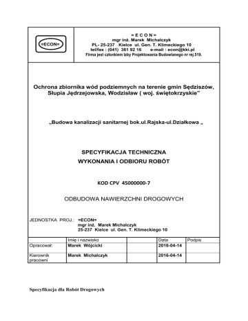 =ECON= =ECON= mgr inż. Marek Michalczyk PL- 25-237 Kielce ul. Gen. T. Klimeckiego 10 tel/fax : (041) 361 92 16 e-mail : [email protected] Firma jest członkiem Izby Projektowania Budowlanego nr rej.519. Ochrona zbiornika wód podziemnych na terenie gmin Sędziszów, Słupia Jędrzejowska, Wodzisław ( woj. świętokrzyskie” „Budowa kanalizacji sanitarnej bok.ul.Rajska-ul.Działkowa „ SPECYFIKACJA TECHNICZNA WYKONANIA I ODBIORU ROBÓT KOD CPV 45000000-7 ODBUDOWA NAWIERZCHNI DROGOWYCH JEDNOSTKA PROJ.: =ECON= mgr inż. Marek Michalczyk 25-237 Kielce ul. Gen. T. Klimeckiego 10 Opracował: Kierownik pracowni Imię i nazwisko Marek Wójcicki Data 2016-04-14 Marek Michalczyk 2016-04-14 Specyfikacja dla Robót Drogowych Podpis ROBOTY PRZYGOTOWAWCZE ROZBIÓRKI ELEMENTÓW ULIC PODBUDOWY PODBUDOWA Z KRUSZYWA ŁAMANEGO STABILIZOWANEGO MECHANICZNIE NAWIERZCHNIE WARSTWA WIĄŻĄCA Z BETONU ASFALTOWEGO ROZBIÓRKI ELEMENTÓW DRÓG I ULIC 1. WSTĘP 1.1. Przedmiot specyfikacji Przedmiotem niniejszej Specyfikacji są wymagania dotyczące wykonania rozbiórki elementów ulic i dróg w ramach zadania „Budowa kanalizacji sanitarnej bok.u.Rajska ul.Działkowa „ 1.2. Zakres stosowania Specyfikacji Specyfikacja Techniczna jest stosowana jako dokument kontraktowy przy zlecaniu i realizacji robót wymienionych w punkcie 1.1. 1.3. Zakres robót objętych Specyfikacją Ustalenia zawarte w niniejszej Specyfikacji dotyczą zasad prowadzenia robót związanych z rozbiórką: - warstw nawierzchni i podbudowy, - krawężników i obrzeży, w miejscach wskazanych w Rysunkach. 1.4. Określenia podstawowe Określenia podstawowe podane w niniejszej Specyfikacji są zgodne z obowiązującymi odpowiednimi polskimi normami i z definicjami podanymi w "Wymagania Ogólne" punkt 1.4. 2. MATERIAŁY Własnością Zamawiającego są wszystkie rozbierane materiały. Wykonawca powinien rozebrać wszystkie elementy dróg w sposób niepowodujący ich zniszczenia. Decyzję co do przeznaczenia materiałów podejmuje kierownik robót. 3. SPRZĘT Ogólne wymagania dotyczące sprzętu podano w "Wymagania Ogólne", punkt 3. Do wykonania robót związanych z rozbiórką należy stosować: - frezarki, - piły, - młoty pneumatyczne, - spycharki, - ładowarki, - samochody ciężarowe bądź inny sprzęt zaakceptowany przez Inwestora 4. TRANSPORT Ogólne wymagania dotyczące transportu podano w "Wymagania Ogólne", punkt 4. Materiały z rozbiórki mogą być przewożone dowolnymi środkami transportowymi. Materiały stanowiące własnością Zamawiającego będą odtransportowane na składowisko wskazane przez Inwestora na odległość do 5 km. Pozostałe materiały Wykonawca usunie z placu budowy. 5. WYKONANIE ROBÓT Ogólne wymagania dotyczące wykonania robót podano w "Wymagania Ogólne", punkt 5. Roboty rozbiórkowe elementów dróg i przepustów obejmują usunięcie z Terenu Budowy wszystkich elementów wymienionych w punkcie 1.3, zgodnie z lokalizacją podaną w Rysunkach lub wg wskazań Inspektora Nadzoru. Wszystkie stalowe elementy barier ochronnych i oznakowania należy rozbierać przez rozkręcanie. Inne metody dopuszczalne są tylko po uzyskaniu zgody Inwestora. Warstwy nawierzchni należy usuwać przy zastosowaniu sprzętu wymienionego w pkt. 3.2 lub w sposób zalecony przez Inwestora. Należy zwrócić uwagę, aby krawędzie rozbieranych warstw nawierzchni na styku z warstwami istniejącymi były pionowe, prostopadłe do osi drogi, aby nie były postrzępione. Wszystkie rozebrane elementy dróg należy posegregować oraz złożyć w miejsce wskazane przez Inwestora na odległość do 5 km. Bezużyteczne materiały powinny być usunięte z Terenu Budowy i przewiezione na miejsce składowania wskazane prze Inwestora. 6. KONTROLA JAKOŚCI ROBÓT Ogólne zasady kontroli jakości robót podano w "Wymagania Ogólne", punkt 6. Sprawdzenie jakości robót rozbiórkowych polega na sprawdzeniu ich zgodności z: - Rysunkami w zakresie kompletności wykonywanych robót, - wymaganiami podanymi w punkt 5 niniejszej Specyfikacji. 7. PRZEPISY ZWIĄZANE Nie występują. PODBUDOWA Z KRUSZYWA ŁAMANEGO STABILIZOWANEGO MECHANICZNIE 1. WSTĘP 1.1. Przedmiot ST Przedmiotem niniejszej Specyfikacji Technicznej są wymagania ogólne dotyczące wykonania i odbioru robót związanych z wykonywaniem podbudowy z kruszywa łamanego stabilizowanego mechanicznie w ramach zadania „Budowa kanalizacji sanitarnej bok.u.Rajskaul.Działkowa „ 1.2. Zakres stosowania ST Specyfikacje Techniczne są stosowane jako Dokument Przetargowy i Kontraktowy przy zlecaniu i realizacji Robót wymienionych w p.1.1. 1.3. Zakres robót objętych ST Ustalenia zawarte w niniejszej ST dotyczą zasad prowadzenia robót związanych z wykonywaniem podbudowy z kruszywa łamanego stabilizowanego mechanicznie o grubości warstwy zgodnie z Dokumentacją Projektową. 1.4. Określenia podstawowe 1.4.1. Podbudowa z kruszywa łamanego stabilizowanego mechanicznie - jedna lub więcej warstw zagęszczonej mieszanki, która stanowi warstwę nośną nawierzchni drogowej. 1.4.2. Stabilizacja mechaniczna - proces technologiczny, polegający na odpowiednim zagęszczeniu w optymalnej wilgotności kruszywa o właściwie dobranym uziarnieniu. 1.5. Ogólne wymagania dotyczące robót Ogólne wymagania dotyczące robót podano w "Wymagania Ogólne" pkt. 1.5. 2. MATERIAŁY 2.1. Ogólne wymagania dotyczące materiałów Ogólne wymagania dotyczące materiałów, ich pozyskiwania i składowania, podano w "Wymagania Ogólne" pkt. 2. 2.2. Rodzaje materiałów Kruszywo powinno być jednorodne bez zanieczyszczeń obcych i bez domieszek gliny. 2.3. Wymagania dla materiałów 2.3.1. Uziarnienie kruszywa Krzywa uziarnienia kruszywa powinna być ciągła i nie może przebiegać od dolnej krzywej granicznej uziarnienia do górnej krzywej granicznej uziarnienia na sąsiednich sitach. Wymiar największego ziarna kruszywa nie może przekraczać 2/3 grubości warstwy układanej jednowarstwowo. 3. SPRZĘT 3.1. Ogólne