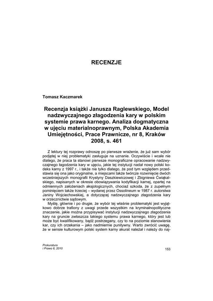 Recenzja ksiąŜki J. Raglewskiego, Model… RECENZJE Tomasz Kaczmarek Recenzja ksiąŜki Janusza Raglewskiego, Model nadzwyczajnego złagodzenia kary w polskim systemie prawa karnego. Analiza dogmatyczna w ujęciu materialnoprawnym, Polska Akademia Umiejętności, Prace Prawnicze, nr 8, Kraków 2008, s. 461 Z lektury tej rozprawy odnoszę po pierwsze wraŜenie, Ŝe juŜ sam wybór podjętej w niej problematyki zasługuje na uznanie. Oczywiście i wcale nie dlatego, Ŝe praca ta stanowi pierwsze monograficzne opracowanie nadzwyczajnego łagodzenia kary w ujęciu, jakie tej instytucji nadał nowy polski kodeks karny z 1997 r., i takŜe nie tylko dlatego, Ŝe pod tym względem przedstawia się ona jako oryginalne, a miejscami takŜe twórcze rozwinięcie dwóch wcześniejszych monografii Krystyny Daszkiewiczowej i Zbigniewa Ćwiąkalskiego, napisanych w okresie obowiązywania kodyfikacji karnej, opartej na odmiennych załoŜeniach aksjologicznych, chociaŜ szkoda, Ŝe z zupełnym pominięciem takŜe trzeciej – wydanej przez Ossolineum w 1987 r. autorstwa Janiny Wojciechowskiej, a dotyczącej nadzwyczajnego złagodzenia kary w orzecznictwie sądowym. Myślę, głównie i po drugie, Ŝe wybór tej właśnie problematyki jest wyjątkowo dobrze trafiony z uwagi przede wszystkim na kryminalnopolityczne znaczenie, jakie moŜna przypisywać instytucji nadzwyczajnego złagodzenia kary na gruncie zwłaszcza takiego systemu prawa karnego, który jest lub moŜe być kwalifikowany, bądź postrzegany, czy to na poziomie stanowienia kar, czy ich orzekania – jako nadmiernie punitywny. Warto zwrócić uwagę, Ŝe w sensie kulturowym polski system karny akurat naleŜał i naleŜy do naj- Prokuratura i Prawo 6, 2010 153 T. Kaczmarek bardziej represyjnych w Europie, nie wyłączając w tym okresu nawet II Rzeczypospolitej (choć w tym wypadku nie na poziomie legislacji, ale głównie polityki orzekanych kar), osiągając najbardziej alarmujący poziom asperacji sankcji karnych w czasie próby budowania IV Rzeczypospolitej, i nadal pod tym względem oznacza się miejscami brakiem naleŜytego zrównowaŜenia. Z tego punktu widzenia – podjęta przez Autora próba modelowego przedstawienia instytucji nadzwyczajnego łagodzenia kary w procesie jej orzekania – jako rozwiązania, które słuŜyć moŜe poŜądanej korekturze ustawowego zagroŜenia karą, gdy ta pod względem swojej wysokości lub rodzaju byłaby in concreto nieadekwatną dla sprawiedliwego wyznaczenia prawnokarnych konsekwencji popełnionego przestępstwa. Po trzecie wreszcie monografia ma swoją doniosłość nie tylko teoretyczną, ale i być moŜe przede wszystkim, praktyczną. Warto w tym miejscu przypomnieć, Ŝe zarówno z przedwojennych, jak i powojennych badań (B. Wróblewskiego, W. Świdy, T. Kaczmarka i M. Melezini) nad postawami sędziów wobec polityki karania – znacząca większość respondentów (przeszło 70%), którzy orzekali w okresie obowiązywania kodeksu karnego z 1932 r., przy restrykcyjnie i wąsko określonych wówczas podstawach nadzwyczajnego łagodzenia kary, a nadto zwłaszcza wobec późniejszego takŜe generalnego podwyŜszenia, juŜ w okresie PRL, takŜe dolnych progów ustawowego zagroŜenia – odczuwała w licznych przypadkach potrzebę orzeczenia kary poniŜej dozwolonego minimum. Niektórzy z nich dla uniknięcia moŜliwego w takich razach konfliktu sumienia, nie mając z mocy ustawy moŜliwości wymierzenia kary poniŜej jej dolnej granicy, wydawali wyroki uniewinniające, bądź warunkowo umarzali postępowanie w trybie art. 49 d. k.p.k., niekiedy zaś zmieniali samą kwalifikacje czynu na łagodniejszą, czy wreszcie orzekając karę pozbawienia wolności jej dolegliwość pomniejszali przez warunkowe zawieszenia jej wykonania. Widoczna i radykalna zmiana postaw nastąpiła w III Rzeczypospolitej. Pośród współczesnych respondentów, jak wynika z interesujących badań ankietowych M. Melezini, przeszło połowa z nich nowy kodeks karny z 1997 r. postrzega jako nazbyt liberalny oraz, co wydaje się najbardziej zaskakujące, zdecydowana ich większość, bo aŜ prawie 75% respondentów uznaje, Ŝe takŜe sądowy wymiar kary, jaki ukształtował się na gruncie tego kodeksu, jest oczywiście zbyt łagodny i jako taki wymaga zaostrzenia, a nie degresji. Ujęcie przez autora nadzwyczajnego złagodzenia kary i naukowego objaśniania jego funkcji z perspektywy takŜe ogólniejszych rozwaŜań teoretyczno-prawnych dotyczących m.in. istoty kary, jej celów oraz zasad jej racjonalnego wymiaru z uwzględnieniem nie tylko oczekiwań co do naleŜytej indywidualizacji orzekanych kar, ale takŜe obowiązujących w tej mierze standardów konstytucyjnych – sprawia po czwarte, Ŝe czytelnik między wierszami 154 Prokuratura i Prawo 6, 2010 Recenzja ksiąŜki J. Raglewskiego, Model… tej niekiedy subtelnej analizy – odnajdzie takŜe wypowiedzi naukowo waŜne – nie tylko dla krytycznej oceny nazbyt rygorystycznych postaw sędziów, ale istotnych równieŜ dla zachowania naleŜytego dystansu czy uzasadnionej nieufności wobec współcześnie podejmowanych pod hasłem just desert punishmrent – prób reanimowania koncepcji kary czysto retrybutywnej. Nie inaczej jak w charakterze kolejnego komplementu dla autora, powiem po piąte, Ŝe jego rozwaŜania stanowią perfekcyjny wgląd w strukturę i podstawy nadzwyczajnego złagodzenia kary, w ujęciu nie tylko kodeksu karnego, ale równieŜ w ustawie karnoskarbowej, w prawie wykroczeń i w trybie art. 343 § 2 pkt 1 kodeksu postępowania karnego, a takŜe w relacje treściowe, jakie zachodzą pomiędzy nadzwyczajnym złagodzeniem kary a takimi postaciami jej łagodzenia, które w języku prawniczym zwykło się nazywać i kwalifikować jako quasi-nadzwyczajne łagodzenie kary i które, chociaŜ w praktyce wiąŜe się równieŜ z degresją karania, nie mieści się wszakŜe w jurydycznej konstrukcji nadzwyczajnego złagodzenia kary, określonej w art. 60 k.k. Z 