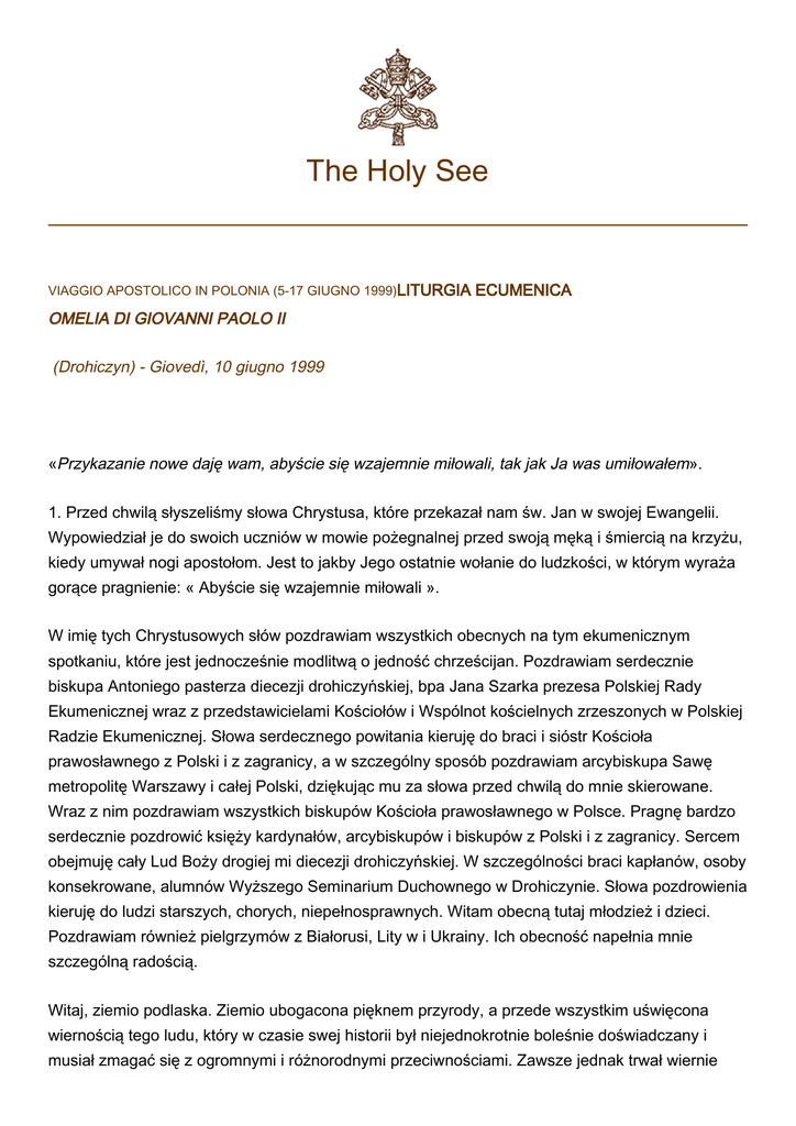The Holy See VIAGGIO APOSTOLICO IN POLONIA (5-17 GIUGNO 1999)LITURGIA ECUMENICA OMELIA DI GIOVANNI PAOLO II (Drohiczyn) - Giovedì, 10 giugno 1999 «Przykazanie nowe daję wam, abyście się wzajemnie miłowali, tak jak Ja was umiłowałem». 1. Przed chwilą słyszeliśmy słowa Chrystusa, które przekazał nam św. Jan w swojej Ewangelii. Wypowiedział je do swoich uczniów w mowie pożegnalnej przed swoją męką i śmiercią na krzyżu, kiedy umywał nogi apostołom. Jest to jakby Jego ostatnie wołanie do ludzkości, w którym wyraża gorące pragnienie: « Abyście się wzajemnie miłowali ». W imię tych Chrystusowych słów pozdrawiam wszystkich obecnych na tym ekumenicznym spotkaniu, które jest jednocześnie modlitwą o jedność chrześcijan. Pozdrawiam serdecznie biskupa Antoniego pasterza diecezji drohiczyńskiej, bpa Jana Szarka prezesa Polskiej Rady Ekumenicznej wraz z przedstawicielami Kościołów i Wspólnot kościelnych zrzeszonych w Polskiej Radzie Ekumenicznej. Słowa serdecznego powitania kieruję do braci i sióstr Kościoła prawosławnego z Polski i z zagranicy, a w szczególny sposób pozdrawiam arcybiskupa Sawę metropolitę Warszawy i całej Polski, dziękując mu za słowa przed chwilą do mnie skierowane. Wraz z nim pozdrawiam wszystkich biskupów Kościoła prawosławnego w Polsce. Pragnę bardzo serdecznie pozdrowić księży kardynałów, arcybiskupów i biskupów z Polski i z zagranicy. Sercem obejmuję cały Lud Boży drogiej mi diecezji drohiczyńskiej. W szczególności braci kapłanów, osoby konsekrowane, alumnów Wyższego Seminarium Duchownego w Drohiczynie. Słowa pozdrowienia kieruję do ludzi starszych, chorych, niepełnosprawnych. Witam obecną tutaj młodzież i dzieci. Pozdrawiam również pielgrzymów z Białorusi, Lity w i Ukrainy. Ich obecność napełnia mnie szczególną radością. Witaj, ziemio podlaska. Ziemio ubogacona pięknem przyrody, a przede wszystkim uświęcona wiernością tego ludu, który w czasie swej historii był niejednokrotnie boleśnie doświadczany i musiał zmagać się z ogromnymi i różnorodnymi przeciwnościami. Zawsze jednak trwał wiernie 2 przy Kościele, i tak jest po dzień dzisiejszy. Cieszę się, że mogłem przybyć do was z pasterską posługą. Ze wzruszeniem wspominam moje dawniejsze odwiedziny Drohiczyna, zwłaszcza z okazji uroczystości milenijnych, kiedy to biskupi całej Polski wraz z Prymasem Tysiąclecia dziękowali Bogu za dar chrztu św., za laskę wiary, nadziei i miłości. Tutaj też uczestniczyłem w ostatniej drodze księdza infułata Krzywickiego, administratora apostolskiego diecezji pińskiej. Kilka lat później przybyłem, aby zakończyć peregrynację kopii obrazu Matki Bożej Częstochowskiej. Dzisiaj te wspomnienia odżywają, gdy staję wśród was jako Papież pielgrzym. 2. « Przykazanie nowe dale wam, abyście się wzajemnie miłowali, tak jak Ja was umiłowałem ». Wielka moc bije z tych słów Chrystusa. Gdy będzie umierał na krzyżu w straszliwej męce, w poniżeniu i opuszczeniu, wówczas ukaże światu całe ich znaczenie i glebie. Patrząc na konanie Chrystusa, uczniowie w pełni poznają, do czego wzywał ich, mówiąc: « Miłujcie się, tak jak Ja was umiłowałem ». Św. Jan, mając w pamięci to wydarzenie, napisze w swojej Ewangelii: « Umiłowawszy swoich na świecie, do końca ich umiłował » (Io. 13, 1),Chrystus umiłował nas jako pierwszy, wraz z naszą grzesznością, wraz z naszą ludzką słabością. To On sprawił, że staliśmy się godni Jego miłości, tej miłości, która nie zna żadnych granic i nigdy się nie kończy. Ma ona charakter definitywny i najdoskonalszy. Chrystus odkupił nas bowiem drogocenną krwią swoją. Nauczył nas również tej miłości i nam ją powierzył: « Przykazanie nowe daję wam » (Ibid. 13, 34). Oznacza to, że ten nakaz jest ciągle aktualny. Jeżeli chcemy odpowiedzieć na miłość Chrystusa, to winniśmy podejmować go zawsze, niezależnie od czasu i miejsca. Ma to być nowa droga dla człowieka, nowy zasiew w relacjach ludzkich. Ta miłość czyni nas - uczniów Chrystusa nowymi ludźmi, dziedzicami Bożych obietnic, Sprawia, że stajemy się dla siebie wszyscy braćmi i siostrami w Panu. Czyni z nas nowy Lud Boży, Kościół, w którym wszyscy winni miłować Chrystusa i w Nim miłować się nawzajem. Oto prawdziwa miłość, która się objawiła w krzyżu Chrystusa. W stronę tego krzyża winniśmy patrzeć wszyscy, ku niemu mami kierować nasze pragnienia i wysiłki. W nim mamy największy wzór do naśladowania. 3. « Panie, naucz nas dróg swoich, byśmy kroczyli Twoimi ścieżkami » (Is. 2, 3). Prorok Izajasz w pierwszym czytaniu dzisiejszej liturgii ukazuje nam w swoim widzeniu mnogość ludów i narodów zgromadzonych wokół góry Syjon. Symbolizuje ona obecność Boga. Proroctwo zaś przepowiada powszechne królestwo sprawiedliwości i pokoju. Można je od-nieść do Kościoła, takiego, jakim go chciał mieć Chrystus, to znaczy Kościoła, w którym panuje niewzruszona zasada jedności. Trzeba nam, chrześcijanom zgromadzonym dziś na tej wspólnej modlitwie wołać słowami Izajasza: « Panie, naucz nas dróg swoich, byśmy kroczyli Twoimi ścieżkami », abyśmy mogli wspólnie, jako wyznawcy Chrystusa, kroczyć tymi ścieżkami ku przyszłości. Bliskość Wielkiego Ju dróg w życiu Kościoła, który jest przecież wspólną Matką wszystkich chrześcijan. W Liście apostolskim e « Tertio Millennio Adyeniente » wyraziłem gorące życzenie, które dziś ponawiam: « 3 Aby Jubileusz stał się okazją do owocnej współpracy w celu odbycia tego, co łączy, a co z pewnością jest większe od tego, co nas jeszcze dzieli »i Wiara mówi nam, że jedność Kościoła to nie miko nadzieja na przyszłość: ta jedność w jakiejś mierze już istnieje! Nie osiągnęła ona jeszcze swego w pełni widzialnego kształtu pośród chrześcijan. Jej budowanie stanowi więc «imperatyw chrześ