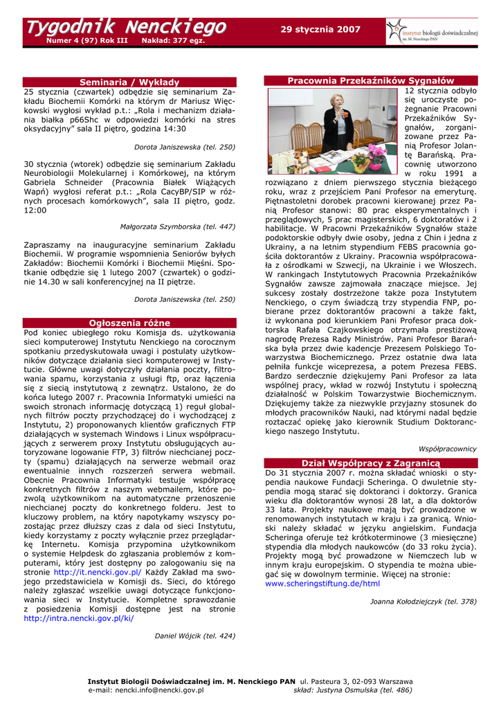 Tygodnik Nenckiego Numer 4 (97) Rok III 29 stycznia 2007 Nakład: 377 egz. Seminaria / Wykłady 25 stycznia (czwartek) odbędzie się seminarium Zakładu Biochemii Komórki na którym dr Mariusz Więckowski wygłosi wykład p.t.: „Rola i mechanizm działania białka p66Shc w odpowiedzi komórki na stres oksydacyjny” sala II piętro, godzina 14:30 Dorota Janiszewska (tel. 250) 30 stycznia (wtorek) odbędzie się seminarium Zakładu Neurobiologii Molekularnej i Komórkowej, na którym Gabriela Schneider (Pracownia Białek Wiążących Wapń) wygłosi referat p.t.: „Rola CacyBP/SIP w różnych procesach komórkowych”, sala II piętro, godz. 12:00 Małgorzata Szymborska (tel. 447) Zapraszamy na inauguracyjne seminarium Zakładu Biochemii. W programie wspomnienia Seniorów byłych Zakładów: Biochemii Komórki i Biochemii Mięśni. Spotkanie odbędzie się 1 lutego 2007 (czwartek) o godzinie 14.30 w sali konferencyjnej na II piętrze. Dorota Janiszewska (tel. 250) Ogłoszenia różne Pod koniec ubiegłego roku Komisja ds. użytkowania sieci komputerowej Instytutu Nenckiego na corocznym spotkaniu przedyskutowała uwagi i postulaty użytkowników dotyczące działania sieci komputerowej w Instytucie. Główne uwagi dotyczyły działania poczty, filtrowania spamu, korzystania z usługi ftp, oraz łączenia się z siecią instytutową z zewnątrz. Ustalono, że do końca lutego 2007 r. Pracownia Informatyki umieści na swoich stronach informację dotyczącą 1) reguł globalnych filtrów poczty przychodzącej do i wychodzącej z Instytutu, 2) proponowanych klientów graficznych FTP działających w systemach Windows i Linux współpracujących z serwerem proxy Instytutu obsługujących autoryzowane logowanie FTP, 3) filtrów niechcianej poczty (spamu) działających na serwerze webmail oraz ewentualnie innych rozszerzeń serwera webmail. Obecnie Pracownia Informatyki testuje współpracę konkretnych filtrów z naszym webmailem, które pozwolą użytkownikom na automatyczne przenoszenie niechcianej poczty do konkretnego folderu. Jest to kluczowy problem, na który napotykamy wszyscy pozostając przez dłuższy czas z dala od sieci Instytutu, kiedy korzystamy z poczty wyłącznie przez przeglądarkę Internetu. Komisja przypomina użytkownikom o systemie Helpdesk do zgłaszania problemów z komputerami, który jest dostępny po zalogowaniu się na stronie http://it.nencki.gov.pl/ Każdy Zakład ma swojego przedstawiciela w Komisji ds. Sieci, do którego należy zgłaszać wszelkie uwagi dotyczące funkcjonowania sieci w Instytucie. Kompletne sprawozdanie z posiedzenia Komisji dostępne jest na stronie http://intra.nencki.gov.pl/ki/ Pracownia Przekaźników Sygnałów 12 stycznia odbyło się uroczyste pożegnanie Pracowni Przekaźników Sygnałów, zorganizowane przez Panią Profesor Jolantę Barańską. Pracownię utworzono w roku 1991 a rozwiązano z dniem pierwszego stycznia bieżącego roku, wraz z przejściem Pani Profesor na emeryturę. Piętnastoletni dorobek pracowni kierowanej przez Panią Profesor stanowi: 80 prac eksperymentalnych i przeglądowych, 5 prac magisterskich, 6 doktoratów i 2 habilitacje. W Pracowni Przekaźników Sygnałów staże podoktorskie odbyły dwie osoby, jedna z Chin i jedna z Ukrainy, a na letnim stypendium FEBS pracownia gościła doktorantów z Ukrainy. Pracownia współpracowała z ośrodkami w Szwecji, na Ukrainie i we Włoszech. W rankingach Instytutowych Pracownia Przekaźników Sygnałów zawsze zajmowała znaczące miejsce. Jej sukcesy zostały dostrzeżone także poza Instytutem Nenckiego, o czym świadczą trzy stypendia FNP, pobierane przez doktorantów pracowni a także fakt, iż wykonana pod kierunkiem Pani Profesor praca doktorska Rafała Czajkowskiego otrzymała prestiżową nagrodę Prezesa Rady Ministrów. Pani Profesor Barańska była przez dwie kadencje Prezesem Polskiego Towarzystwa Biochemicznego. Przez ostatnie dwa lata pełniła funkcje wiceprezesa, a potem Prezesa FEBS. Bardzo serdecznie dziękujemy Pani Profesor za lata wspólnej pracy, wkład w rozwój Instytutu i społeczną działalność w Polskim Towarzystwie Biochemicznym. Dziękujemy także za niezwykle przyjazny stosunek do młodych pracowników Nauki, nad którymi nadal będzie roztaczać opiekę jako kierownik Studium Doktoranckiego naszego Instytutu. Współpracownicy Dział Współpracy z Zagranicą Do 31 stycznia 2007 r. można składać wnioski o stypendia naukowe Fundacji Scheringa. O dwuletnie stypendia mogą starać się doktoranci i doktorzy. Granica wieku dla doktorantów wynosi 28 lat, a dla doktorów 33 lata. Projekty naukowe mają być prowadzone w renomowanych instytutach w kraju i za granicą. Wnioski należy składać w języku angielskim. Fundacja Scheringa oferuje też krótkoterminowe (3 miesięczne) stypendia dla młodych naukowców (do 33 roku życia). Projekty mogą być prowadzone w Niemczech lub w innym kraju europejskim. O stypendia te można ubiegać się w dowolnym terminie. Więcej na stronie: www.scheringstiftung.de/html Joanna Kołodziejczyk (tel. 378) Daniel Wójcik (tel. 424) Instytut Biologii Doświadczalnej im. M. Nenckiego PAN ul. Pasteura 3, 02-093 Warszawa e-mail: [email protected] skład: Justyna Osmulska (tel. 486)