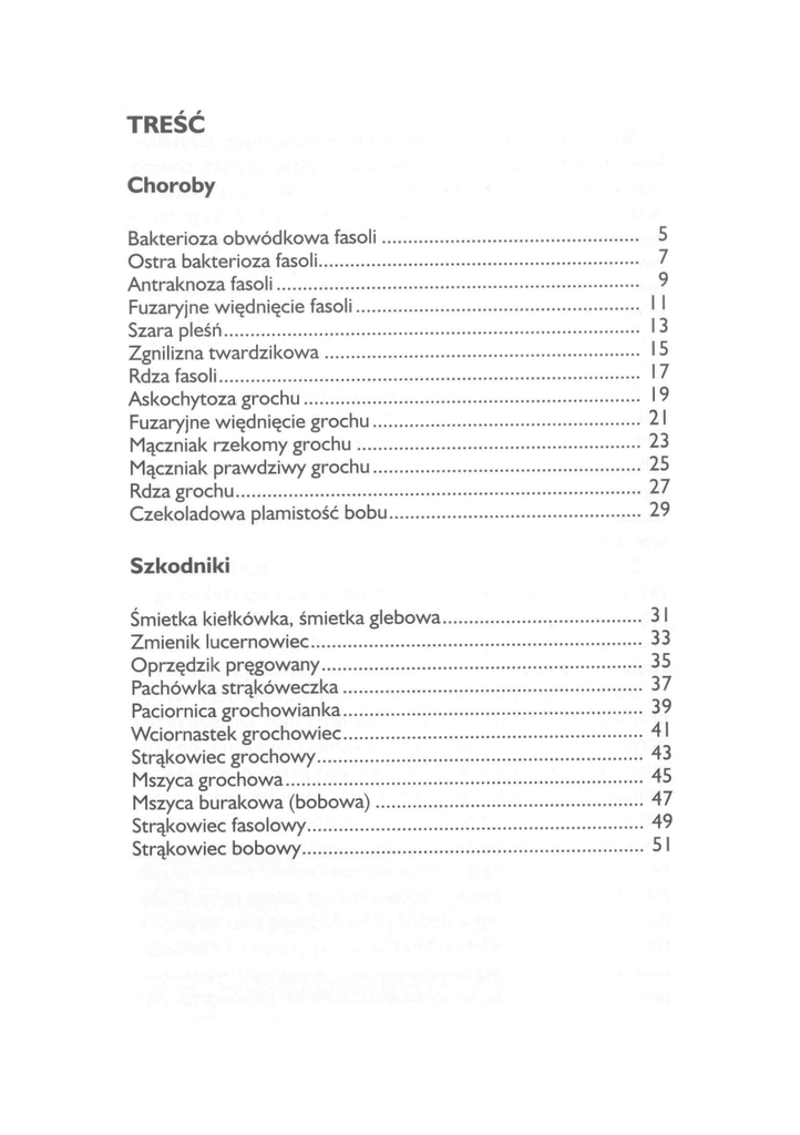 TREŚĆ Choroby Bakterioza obwódkowa fasoli Ostra bakterioza fasoli Antraknoza fasoli Fuzaryjne więdnięcie fasoli Szara pleśń Zgnilizna twardzikowa Rdza fasoli Askochytoza grochu Fuzaryjne więdnięcie grochu Mączniak rzekomy grochu Mączniak prawdziwy grochu Rdza grochu Czekoladowa plamistość bobu 5 7 9 II 13 15 17 19 21 23 25 27 29 Szkodniki Śmietka kiełkówka, śmietka glebowa Zmienik lucernowiec Oprzędzik pręgowany Pachówka strąkóweczka Paciornica grochowianka Wciornastek grochowiec Strąkowiec grochowy Mszyca grochowa Mszyca burakowa (bobowa) Strąkowiec fasolowy Strąkowiec bobowy 3I 33 35 37 39 41 43 45 47 49 51