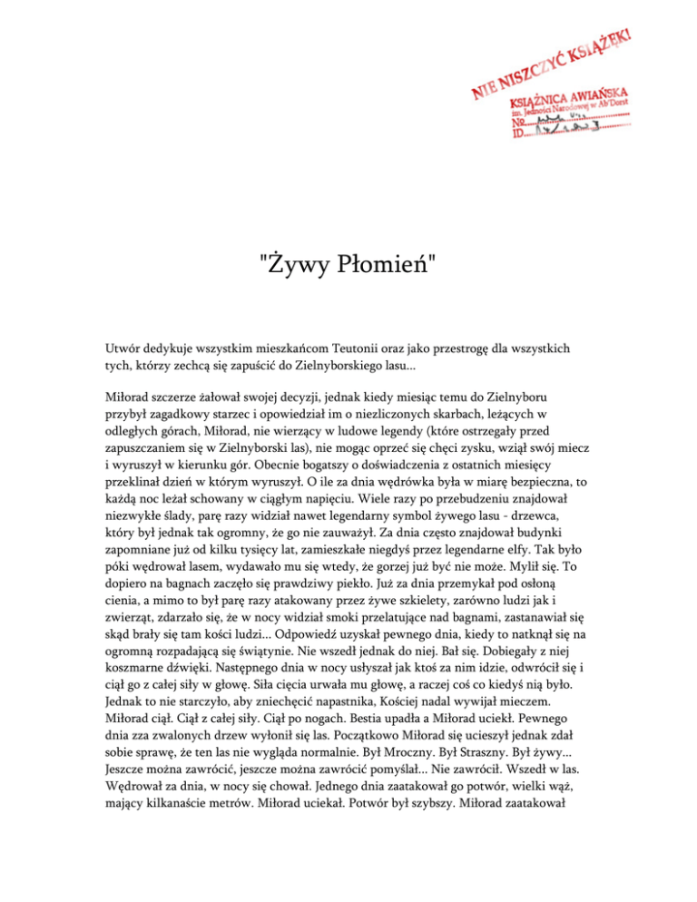 "Żywy Płomień" Utwór dedykuje wszystkim mieszkańcom Teutonii oraz jako przestrogę dla wszystkich tych, którzy zechcą się zapuścić do Zielnyborskiego lasu... Miłorad szczerze żałował swojej decyzji, jednak kiedy miesiąc temu do Zielnyboru przybył zagadkowy starzec i opowiedział im o niezliczonych skarbach, leżących w odległych górach, Miłorad, nie wierzący w ludowe legendy (które ostrzegały przed zapuszczaniem się w Zielnyborski las), nie mogąc oprzeć się chęci zysku, wziął swój miecz i wyruszył w kierunku gór. Obecnie bogatszy o doświadczenia z ostatnich miesięcy przeklinał dzień w którym wyruszył. O ile za dnia wędrówka była w miarę bezpieczna, to każdą noc leżał schowany w ciągłym napięciu. Wiele razy po przebudzeniu znajdował niezwykłe ślady, parę razy widział nawet legendarny symbol żywego lasu - drzewca, który był jednak tak ogromny, że go nie zauważył. Za dnia często znajdował budynki zapomniane już od kilku tysięcy lat, zamieszkałe niegdyś przez legendarne elfy. Tak było póki wędrował lasem, wydawało mu się wtedy, że gorzej już być nie może. Mylił się. To dopiero na bagnach zaczęło się prawdziwy piekło. Już za dnia przemykał pod osłoną cienia, a mimo to był parę razy atakowany przez żywe szkielety, zarówno ludzi jak i zwierząt, zdarzało się, że w nocy widział smoki przelatujące nad bagnami, zastanawiał się skąd brały się tam kości ludzi... Odpowiedź uzyskał pewnego dnia, kiedy to natknął się na ogromną rozpadającą się świątynie. Nie wszedł jednak do niej. Bał się. Dobiegały z niej koszmarne dźwięki. Następnego dnia w nocy usłyszał jak ktoś za nim idzie, odwrócił się i ciął go z całej siły w głowę. Siła cięcia urwała mu głowę, a raczej coś co kiedyś nią było. Jednak to nie starczyło, aby zniechęcić napastnika, Kościej nadal wywijał mieczem. Miłorad ciął. Ciął z całej siły. Ciął po nogach. Bestia upadła a Miłorad uciekł. Pewnego dnia zza zwalonych drzew wyłonił się las. Początkowo Miłorad się ucieszył jednak zdał sobie sprawę, że ten las nie wygląda normalnie. Był Mroczny. Był Straszny. Był żywy... Jeszcze można zawrócić, jeszcze można zawrócić pomyślał... Nie zawrócił. Wszedł w las. Wędrował za dnia, w nocy się chował. Jednego dnia zaatakował go potwór, wielki wąż, mający kilkanaście metrów. Miłorad uciekał. Potwór był szybszy. Miłorad zaatakował znienacka. Miał po prostu szczęście. Trafił w ślepia, a wąż skonał. Podobnie było każdego dnia. Wreszcie zobaczył góry...... ......Wspomnienia przerwał mu hałas. Jednak go znalazł, mimo tak dobrej kryjówki, jaką znalazł Miłorad w górskich grotach. Miłorad poderwał się do biegu. Bestia była za nim. Żywy płomień. Miłorad biegł z całych sił. Płomień był szybszy. Był już tuż za nim. Czy śmierć boli? pomyślał Miłorad. Nie bolała... Żywy płomień wrócił na miejsce spoczynku... Nikt go od tej pory nie widział... Szczątki Miłorada, wraz z zapiskami z podróży znaleziono w 1956 roku... Jeden z badaczy zapuścił się wtedy w góry... Nie wrócił... Zielnybor, MMV Hegemon Wojciech
