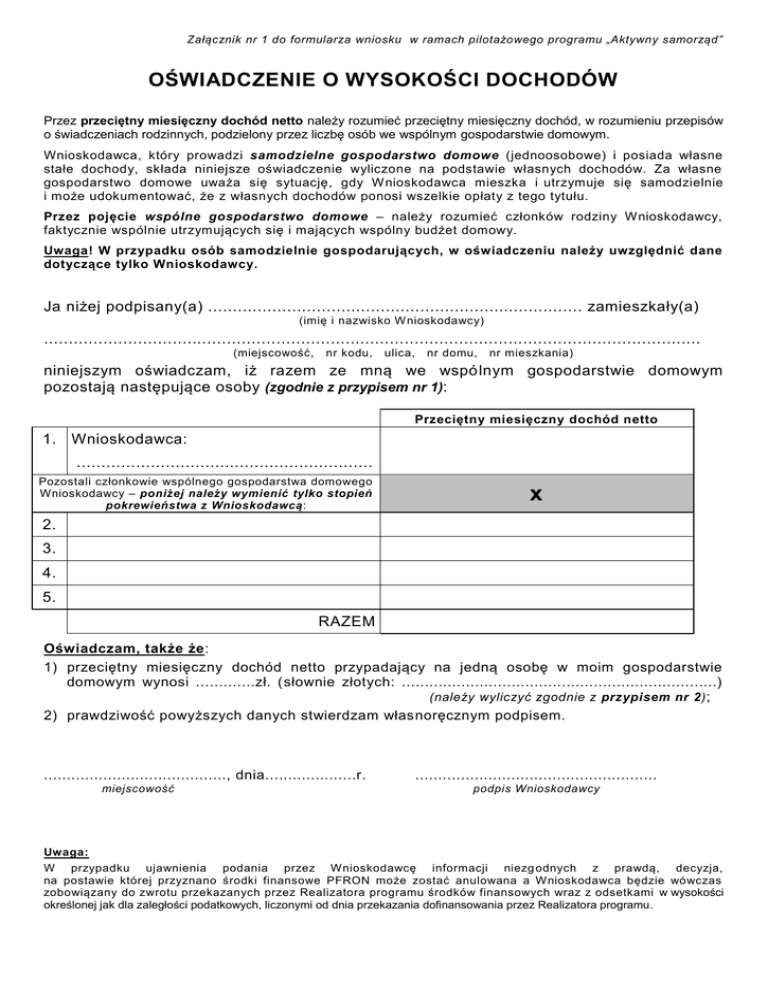 Załącznik nr 1 do formularza wniosku w ramach pilotażowego programu „Aktywny samorząd” OŚWIADCZENIE O WYSOKOŚCI DOCHODÓW Przez przeciętny miesięczny dochód netto należy rozumieć przeciętny miesięczny dochód, w rozumieniu przepisów o świadczeniach rodzinnych, podzielony przez liczbę osób we wspólnym gospodarstwie domowym. Wnioskodawca, który prowadzi samodzielne gospodarstwo domowe (jednoosobowe) i posiada własne stałe dochody, składa niniejsze oświadczenie wyliczone na podstawie własnych dochodów. Za własne gospodarstwo domowe uważa się sytuację, gdy W nioskodawca mieszka i utrzymuje się samodzielnie i może udokumentować, że z własnych dochodów ponosi wszelkie opłaty z tego tytułu. Przez pojęcie wspólne gospodarstwo domowe – należy rozumieć członków rodziny Wnioskodawcy, faktycznie wspólnie utrzymujących się i mających wspólny budżet domowy. Uwaga! W przypadku osób samodzielnie gospodarujących, w oświadczeniu należy uwzględnić dane dotyczące tylko Wnioskodawcy. Ja niżej podpisany(a) ............................................................................ zamieszkały(a) (imię i nazwisko W nioskodawcy) ..................................................................................................................................... (miejscowość, nr kodu, ulica, nr domu, nr mieszkania) niniejszym oświadczam, iż razem ze mną we wspólnym gospodarstwie domowym pozostają następujące osoby (zgodnie z przypisem nr 1): Przeciętny miesięczny dochód netto 1. Wnioskodawca: ............................................................ Pozostali członkowie wspólnego gospodarstwa domowego Wnioskodawcy – poniżej należy wymienić tylko stopień pokrewieństwa z Wnioskodawcą: x 2. 3. 4. 5. RAZEM Oświadczam, także że: 1) przeciętny miesięczny dochód netto przypadający na jedną osobę w moim gospodarstwie domowym wynosi .............zł. (słownie złotych: .....................................................................) (należy wyliczyć zgodnie z przypisem nr 2) ; 2) prawdziwość powyższych danych stwierdzam własnoręcznym podpisem. ........................................, dnia....................r. miejscowość ..................................................... podpis Wnioskodawcy Uwaga: W przypadku ujawnienia podania przez Wnioskodawcę informacji niezg odnych z prawdą, decyzja, na postawie której przyznano środki finansowe PFRON może zostać anulowana a Wnioskodawca będzie wówczas zobowiązany do zwrotu przekazanych przez Realizatora programu środków finansowych wraz z odsetkami w wysokości określonej jak dla zaległości podatkowych, liczonymi od dnia przekazania dofinansowania przez Realizatora programu. Oświadczenie o wysokości dochodów Przypis nr 1 Dochód w rozumieniu przepisów o świadczeniach rodzinnych. Dochód - oznacza to, po odliczeniu kwot alimentów świadczonych na rzecz innych osób: a) przychody podlegające opodatkowaniu na zasadach ogólnych określonych na podstawie przepisów o podatku dochodowym od osób fizycznych, pomniejszone o koszty uzyskania przychodu, należny podatek dochodowy od osób fizycznych, składki na ubezpieczenia społeczne niezaliczone do kosztów uzyskania przychodu oraz składki na ubezpieczenie zdrowotne, b) deklarowany w oświadczeniu dochód z działalności podlegającej opodatkowaniu na podstawie przepisów o zryczałtowanym podatku dochodowym od niektórych przychodów osiąganych przez osoby fizyczne, pomniejszony o należny zryczałtowany podatek dochodowy i składki na ubezpieczenia społeczne i zdrowotne, c) inne dochody niepodlegające opodatkowaniu na podstawie przepisów o podatku dochodowym od osób fizycznych: – renty określone w przepisach o zaopatrzeniu inwalidów wojennych i wojskowych oraz ich rodzin, – renty wypłacone osobom represjonowanym i członkom ich rodzin, przyznane na zasadach określonych w przepisach o zaopatrzeniu inwalidów wojennych i wojskowych oraz ich rodzin, – świadczenia pieniężne oraz ryczałt energetyczny określone w przepisach o świadczeniu pieniężnym i uprawnieniach przysługujących żołnierzom zastępczej służby wojskowej przymusowo zatrudnianym w kopalniach węgla, kamieniołomach, zakładach rud uranu i batalionach budowlanych, – dodatek kombatancki, ryczałt energetyczny i dodatek kompensacyjny określone w przepisach o kombatantach oraz niektórych osobach będących ofiarami represji wojennych i okresu powojennego, – świadczenia pieniężne określone w przepisach o świadczeniu pieniężnym przysługującym osobom deportowanym do pracy przymusowej oraz osadzonym w obozach pracy przez III Rzeszę Niemiecką lub Związek Socjalistycznych Republik Radzieckich, – emerytury i renty otrzymywane przez osoby, które utraciły wzrok w wyniku działań wojennych w latach 1939-1945 lub eksplozji pozostałych po tej wojnie niewypałów i niewybuchów, – renty inwalidzkie z tytułu inwalidztwa wojennego, kwoty zaopatrzenia otrzymywane przez ofiary wojny oraz członków ich rodzin, renty wypadkowe osób, których inwalidztwo powstało w związku z przymusowym pobytem na robotach w III Rzeszy Niemieckiej w latach 1939-1945, otrzymywane z zagranicy, – zasiłki chorobowe określone w przepisach o ubezpieczeniu społecznym rolników oraz w przepisach o systemie ubezpieczeń społecznych, – środki bezzwrotnej pomocy zagranicznej otrzymywane od rządów państw obcych, organizacji międzynarodowych lub międzynarodowych instytucji finansowych, pochodzące ze środków bezzwrotnej pomocy przyznanych na podstawie jednostronnej deklaracji lub umów zawartych z tymi państwami, organizacjami lub instytucjami przez Radę Ministrów, właściwego ministra lub agencje rządowe, w tym również w przypadkach, gdy przekazanie tych środków jest dokonywane za pośrednictwem podmiotu upoważnionego do rozdzielania środków bezzwrotnej pomocy zagranicznej na rzecz podmiotów, którym 