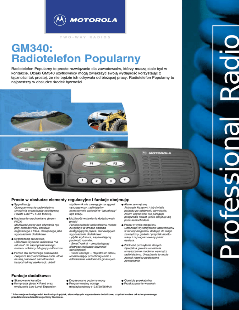 T W O - W AY R A D I O S GM340: Radiotelefon Popularny Radiotelefon Popularny to proste rozwiàzanie dla zawodowców, którzy muszà stale byç w kontakcie. Dzi´ki GM340 u˝ytkownicy mogà zwi´kszyç swojà wydajnoÊç korzystajàc z ∏àcznoÊci tak prostej, ˝e nie b´dzie ich odrywa∏a od bie˝àcej pracy. Radiotelefon Popularny to najprostszy w obs∏udze Êrodek ∏àcznoÊci. Proste w obs∏udze elementy regulacyjne i funkcje obejmujà: ● Sygnalizacj´ Oprogramowanie radiotelefonu umo˝liwia sygnalizacj´ selektywnà Private Line™ i 5-cio tonowà. ● Nadawanie uruchamiane g∏osem (VOX) Mo˝liwoÊç pracy bez u˝ywania ràk przy zastosowaniu zestawu nag∏ownego z VOX, dost´pnego jako wyposa˝enie dodatkowe. ● Sygnalizacj´ ratunkowà Umo˝liwia wys∏anie wezwania "na ratunek" do zaprogramowanego numeru odbiorcy lub grupy odbiorców. ● Pomoc dla samotnego pracownika Zwi´ksza bezpieczeƒstwo osób, które muszà pracowaç samotnie bez bezpoÊredniej asekuracji. Je˝eli u˝ytkownik nie zareaguje na sygna∏ ostrzegawczy, radiotelefon samoczynnie wchodzi w "ratunkowy" tryb pracy. ● Mo˝liwoÊç wstawienia dodatkowych p∏ytek* FunkcjonalnoÊç radiotelefonu mo˝na zwi´kszyç w drodze dodania nast´pujàcych p∏ytek, stanowiàcych wyposa˝enie dodatkowe: - p∏ytki szyfratora, zapewniajàcej poufnoÊç rozmów, - SmarTrunk II - umo˝liwiajàcej niedrogà realizacj´ ∏àcznoÊci trunkingowej, - Voice Storage – Rejestrator G∏osu, umo˝liwiajàcy przechowywanie i odtwarzanie wiadomoÊci g∏osowych. ● Alarm zewn´trzny Aktywuje klakson i / lub Êwiat∏a pojazdu po odebraniu wywo∏ania, zatem u˝ytkownik nie przegapi po∏àczenia nawet, je˝eli znajduje si´ poza samochodem. ● Praca w trybie megafonu Umo˝liwia wykorzystanie radiotelefonu w funkcji megafonu dodajàc do niego zewn´trzny g∏oÊnik i przycisk montowany i zaprogramowany przez dealera. ● ZdolnoÊç przesy∏ania danych Specjalna g∏owica umo˝liwia umieszczenie modemu wewnàtrz radiotelefonu. Urzàdzenie to mo˝e zostaç równie˝ pod∏àczone zewn´trznie. Funkcje dodatkowe: ● Skanowanie kana∏ów ● Kompresja g∏osu X-Pand oraz wyciszanie Low Level Expansion ● Dopasowane poziomy mocy ● Programowalny odst´p ● ObejÊcie przekaênika ● Przekazywanie wywo∏aƒ mi´dzykana∏owy (12,5/20/25kHz) * Informacje o dost´pnoÊci konkretnych p∏ytek, stanowiàcych wyposa˝enie dodatkowe, uzyskaç mo˝na od autoryzowanego przedstawiciela handlowego firmy Motorola. Dane Techniczne Radiotelefonu GM340 Parametry ogólne Parametry *Zakres cz´stotliwoÊci: Nadajnik VHF UHF 136-174 MHz 403-470 MHz ±2.5 ppm ±2 ppm StabilnoÊç cz´stotliwoÊciowa (-30°C do +60°C, temp. odniesienia +25°C): Liczba kana∏ów: Parametry VHF/UHF Maksymalna dewiacja: ±2.5 kHz przy 12.5 kHz ±4.0 kHz przy 20 kHz ±5.0 kHz przy 25 kHz Przydêwi´ki i szumy: -40 dB przy 12,5 kHz -45 dB przy 20/25 kHz 6 Odst´p mi´dzykana∏owy 12.5/20/25 kHz Moc wyjÊciowa: 1-25W Zasilanie: 1-25W 13,2V pr. sta∏ego (10,8 - 15,6V pr. sta∏ego) minus na masie samochodu Wymiary: d∏ug. x szer. x wys.: 177mm x 176mm x 56mm (dodaç 8mm na potencjometr) Waga: 1400 g Zakres temperatur roboczych -30 to 60°C Uszczelnianie: Promieniowanie niepo˝àdane: -36 dBm < 1 GHz -30 dBm > 1 GHz T∏umienie kana∏u sàsiedniego: -60 dB przy 12,5 kHz -70 dB przy 20/25 kHz Pasmo akustyczne (300 -3000 Hz): +1 do -3 dB Zniekszta∏cenia akustyczne przy 1000 Hz i 60% maksymalnej dewiacji: 3% typowe Zgodne z IP54 Wstrzàsy i drgania: Spe∏nia MIL STD 810-C/D /E i TIA/EIA 603 Py∏: Spe∏nia MIL STD 810-C/D /E i TIA/EIA 603 WilgotnoÊç: Spe∏nia MIL STD 810-C/D /E i TIA/EIA 603 Odbiornik Parametry VHF Czu∏oÊç (12 dB SINAD) ETS Intermodulacja (ETS) Military Standards 810 C, D, & E 810C 810D 810E Norma MIL-STD Metody Procedury Metody Procedury Metody Procedury Niskie ciÊnienie 500.1 1 500.2 2 500.3 2 Wysoka temperatura 501.1 1,2 501.2 1,2 501.3 1,2 Niska temperatura 502.1 2 502.2 1,2 502.3 1,2 Szok termiczny 503.1 1 503.2 1 503.3 1 Promieniowanie s∏oneczne 505.1 1 505.2 1 505.3 1 Deszcz 506.1 2 506.2 2 506.3 2 WilgotnoÊç 507.1 2 507.2 2,3 507.3 3 S∏ona mg∏a 509.1 1 509.2 1 509.3 1 Py∏ 510.1 1 510.2 1 510.3 1 Drgania 514.2 8,10 514.3 1 514.4 1 Wstrzàsy 516.2 1,2,5 516.3 1 516.4 1 UHF 0,30µV (0,22µV typowe) >65dB; >70 dB dla stacji bazowej SelektywnoÊç sàsiedniokana∏owa (ETS) 65 dB przy 12,5 kHz 75 dB przy 20 kHz 80 dB przy 25 kHz 65 dB przy 12,5 kHz 70 dB kHz 75 dB kHz T∏umienie sygna∏ów paso˝ytniczych (ETS) 75 dB przy 12,5 kHz 80 dB przy 20/25 kHz 70 dB 12,5 kHz 75 dBk 20/25 kHz Nominalna moc akustyczna (ETS) 3W wewn´trzny 7,5W i 13W zewn´trzny Zniekszta∏cenia akustyczne przy dêwi´ku nominalnym 3% typowe Przydêwi´ki i szumy -40 dB przy 12,5 kHz -45 dB przy 20/25 kHz Pasmo akustyczne (300 -3000 Hz) +1 do -3 dB Promieniowanie paso˝ytnicze -57 dBm < 1 GHz -47 dBm > 1 GHz *Mo˝liwoÊç zastosowania uzale˝niona od przepisów i uregulowaƒ prawnych w konkretnych krajach. Specyfikacje mogà ulec zmianie bez uprzedzenia i nie majà charakteru wià˝àcej specyfikacji. Wszystkie podane parametry sà typowe. Radiotelefony spe∏niajà obowiàzujàce wymagania regulacyjne. Zgodny z Dyrektywà EC 89/336/EEC Zgodne z normà ETS 300 113 Bli˝sze informacje o tym w jaki sposób ∏àcznoÊç przez Professional Radios Series mo˝e dostarczyç korzyÊci Paƒstwa przedsi´biorstwu mo˝ecie uzyskaç od najbli˝szego autoryzowanego przedstawiciela handlowego firmy Motorola. Alfa Radio, Jarosław Kaźmierczak 85-147 Bydgoszcz; ul. Dąbrowa 21 tel. (052) 371-91-00; fax 371-91-32 [email protected] Motorola Polska Sp. z o.o. ul. Domaniewska 41 02-672 Warszawa Polska Tel. +48(22)6 06 04 50 Fax +48(22)6 06 04 60 http://www.motorola.pl Tylko oryginalne akcesoria i akumulatory firmy Motorola zapewniajà najwy˝szà sprawnoÊç, niezawodnoÊci i jakoÊci. Dodatkowe informacje znajdujà si´ w broszurze ”Akcesoria do Professional Radi