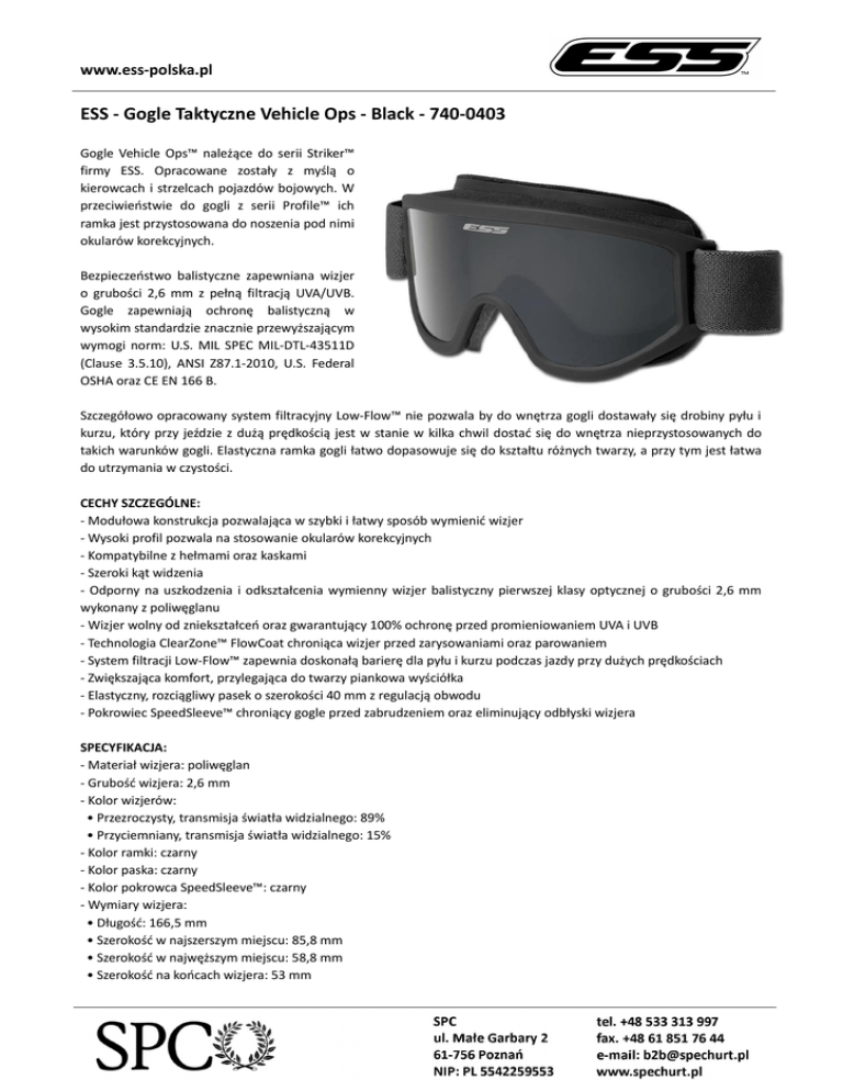 www.ess-polska.pl ESS - Gogle Taktyczne Vehicle Ops - Black - 740-0403 Gogle Vehicle Ops™ należące do serii Striker™ firmy ESS. Opracowane zostały z myślą o kierowcach i strzelcach pojazdów bojowych. W przeciwieństwie do gogli z serii Profile™ ich ramka jest przystosowana do noszenia pod nimi okularów korekcyjnych. Bezpieczeństwo balistyczne zapewniana wizjer o grubości 2,6 mm z pełną filtracją UVA/UVB. Gogle zapewniają ochronę balistyczną w wysokim standardzie znacznie przewyższającym wymogi norm: U.S. MIL SPEC MIL-DTL-43511D (Clause 3.5.10), ANSI Z87.1-2010, U.S. Federal OSHA oraz CE EN 166 B. Szczegółowo opracowany system filtracyjny Low-Flow™ nie pozwala by do wnętrza gogli dostawały się drobiny pyłu i kurzu, który przy jeździe z dużą prędkością jest w stanie w kilka chwil dostać się do wnętrza nieprzystosowanych do takich warunków gogli. Elastyczna ramka gogli łatwo dopasowuje się do kształtu różnych twarzy, a przy tym jest łatwa do utrzymania w czystości. CECHY SZCZEGÓLNE: - Modułowa konstrukcja pozwalająca w szybki i łatwy sposób wymienić wizjer - Wysoki profil pozwala na stosowanie okularów korekcyjnych - Kompatybilne z hełmami oraz kaskami - Szeroki kąt widzenia - Odporny na uszkodzenia i odkształcenia wymienny wizjer balistyczny pierwszej klasy optycznej o grubości 2,6 mm wykonany z poliwęglanu - Wizjer wolny od zniekształceń oraz gwarantujący 100% ochronę przed promieniowaniem UVA i UVB - Technologia ClearZone™ FlowCoat chroniąca wizjer przed zarysowaniami oraz parowaniem - System filtracji Low-Flow™ zapewnia doskonałą barierę dla pyłu i kurzu podczas jazdy przy dużych prędkościach - Zwiększająca komfort, przylegająca do twarzy piankowa wyściółka - Elastyczny, rozciągliwy pasek o szerokości 40 mm z regulacją obwodu - Pokrowiec SpeedSleeve™ chroniący gogle przed zabrudzeniem oraz eliminujący odbłyski wizjera SPECYFIKACJA: - Materiał wizjera: poliwęglan - Grubość wizjera: 2,6 mm - Kolor wizjerów: • Przezroczysty, transmisja światła widzialnego: 89% • Przyciemniany, transmisja światła widzialnego: 15% - Kolor ramki: czarny - Kolor paska: czarny - Kolor pokrowca SpeedSleeve™: czarny - Wymiary wizjera: • Długość: 166,5 mm • Szerokość w najszerszym miejscu: 85,8 mm • Szerokość w najwęższym miejscu: 58,8 mm • Szerokość na końcach wizjera: 53 mm www.ess-polska.pl - Wymiary ramki: • Długość: 186 mm • Szerokość w najszerszym miejscu: 96 mm • Szerokość w najwęższym miejscu: 64,5 mm • Grubość: 30 - 38 mm - Szerokość paska: 40 mm - Długość maksymalna nierozciągniętego paska: 590 mm - Waga kompletnych gogli: 141g - Waga pojedynczego wizjera: 41g - Waga ramki: 55g - Waga paska: 29g - Waga pokrowca SpeedSleeve™: 16g FILTRY: 100% UVA/UVB NORMY: - zgodne z amerykańską normą cywilną ANSI Z87.1 - 2010 - zgodne z normą amerykańskiej armii MIL SPEC MIL-DTL-43511D (Clause 3.5.10) - znak jakości CE, zgodne z europejskimi normami CE EN 166 B - zgodne z US Federal OSHA Natowski numer magazynowy NSN: 4240-01-573-1931 ZESTAW ZAWIERA: - Ramka z paskiem - Wizjer przezroczysty Clear (zamontowany) - Wizjer przyciemniany Smoke Gray - Pokrowiec na gogle SpeedSleeve™ - Flanelowy pokrowiec na wizjer - Zapinany rzepem Velcro nylonowy pokrowiec koloru czarnego z montażem do paska i oporządzenia O FIRMIE ESS ESS (Eye Safety Systems) to amerykańska firma specjalizująca się w produkcji okularów i gogli ochronnych. Jej produkty znajdują zastosowanie wszędzie tam, gdzie wymagana jest ochrona balistyczna oczu najwyższego stopnia. Produkty firmy ESS cieszą się niebywałą popularnością wśród żołnierzy, strażaków, służb medycznych i ratowniczych na całym świecie. Wszystkie jej produkty zapewniają bezkompromisową ochronę i bezpieczeństwo wzroku, jej wizjery spełniają militarne normy balistyczne, a wiele z nich opracowywane było we współpracy z armią amerykańską. Nad całym procesem produkcyjnym czuwa System Zarządzania Jakością (ISO 9001).