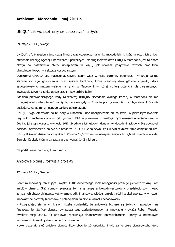 Archiwum - Macedonia – maj 2011 r. UNIQUA Life wchodzi na rynek ubezpieczeń na życie 29. maja 2011 r., Skopje UNIQUA Life Macedonia jest nową firmą ubezpieczeniową na rynku macedońskim, która w ostatnich dniach otrzymała licencję Agencji Ubezpieczeń Społecznych. Według kierownictwa UNIQUA Macedonia jest to dobra okazja do poszerzenia oferty ubezpieczeń w kraju, jak również połączenie różnych produktów ubezpieczeniowych w sektorze gospodarczym. Dyrektorka UNIQUA Life Macedonia, Olivera Bohm widzi w kraju ogromny potencjał. - W kraju panuje stabilna sytuacja gospodarcza oraz system bankowy, które stanowią dwa główne czynniki, które zadecydowały o naszym wejściu na rynek w Macedonii, w której istnieją potencjał dla zagranicznych inwestycji, także na rynku ubezpieczeń – stwierdziła Bohm. Zdaniem przewodniczącego Rady Nadzorczej UNIQUA Macedonia Avniego Ponari, w Macedonii nie ma rozległej oferty ubezpieczeń na życie, podczas gdy w Europie praktycznie nie ma obywatela, który nie posiadałby co najmniej jednego pakietu ubezpieczeń. UNIQA - Sigal oferowała do tej pory w Macedonii inne ubezpieczenia niż na życie. W pierwszym kwartale tego roku zanotowała ona wzrost zysków o 13% w porównaniu z analogicznym okresem ubiegłego roku. W 2010 r. jej stopa wzrostu wyniosła 16%. Zgodnie z istniejącymi danymi, w Macedonii zaledwie 2% obywateli posiada ubezpieczenie na życie, dlatego w UNIQUA Life są pewni, że i w tym sektorze firma odniesie sukces. UNOQUA Group działa na 21 rynkach. Posiada 16,5 mln umów ubezpieczeniowych i 7,6 mln klientów w całej Europie. Kapitał, którym zarządza grupa wynosi 24,2 mld euro. Na podst. vecer.com.mk, tłum. i red. Ł.F. Aniołowie biznesu rozwijają projekty 27. maja 2011 r., Skopje Centrum Innowacji realizujące Projekt USAID dotyczącego konkurencyjności promuje pierwszą w kraju sieć aniołów biznesu. Sieć stanowi pierwszą formalną grupę aniołów-inwestorów - przedsiębiorców i osób zamożnych chcących inwestować własne środki finansowe, wiedzę, umiejętności i kapitał społeczny w nowe i innowacyjne pomysły biznesowe z potencjałem na szybki wzrost dochodowości. - Przyglądając się innym krajom trzeba stwierdzić, że aniołowie biznesu są świetnym sposobem na finansowanie start-up biznesu, zwłaszcza tego zorientowanego na innowacje - uważa Robert Wuertz, dyrektor misji USAID. Ci aniołowie zapewniają finansowania przedsiębiorcom, którzy w normalnych warunkach nie mieliby dostępu do finansowania. Nowo powstała sieć aniołów biznesu liczy obecnie 10 członków i tyle samo ofert biznesowych, które przechodzą obecnie ewaluację. Aby uczynić swe usługi dostępnymi dla ogółu społeczeństwa, sieć ogłosi wkrótce konkurs na najlepsze pomysły biznesowe oraz nabór nowych aniołów-inwestorów zainteresowanych przyłączeniem się do sieci. W tym celu zorganizowana też zostanie oficjalna kolacja z udziałem aniołów biznesu. - Wielu przedsiębiorców na początku swej działalności nie znajduje zrozumienia dla swych inwestycji w bankach, które mogłyby sfinansować ich projekty. W ten sposób doskonałe projekty, które mogłyby stworzyć nawet kilkaset miejsc pracy, nie mogą zostać zrealizowane - powiedział Ljupczo Zikov, prezes Sieci Aniołów Biznesu. Zikov stwierdził również, że aniołowie biznesu są doskonałą formą finansowania tych, którzy rozpoczynają swoją działalność, szczególnie zaś tych, którzy stawiają na innowacje. Zadaniem niedawno utworzonej grupy jest znalezienie zarówno aniołów biznesu, jak i potencjalnie dobrych projektów. Na podst. dnevnik.com.mk, tłum. i red. Ł.F. Osiem prestiżowych nagród dla wina marki „Tikveš” 22. maja 2011, Skopje - Londyn Wytwórnia win Tikveš zdobyła zdobyła osiem nagród w dwóch prestiżowych konkursach światowej rangi International Vine Challenge i Decanter, które tradycyjnie odbyły się w Londynie. Ponadto, 11 win dostało specjalne wyróżnienie od komisji jako szczególnie dobrej jakości. „Sukces na międzynarodowych konkursach jest najlepszą reklamą win marki Tikveš zważywszy na to, że przyciągają one wszystkich tych, którzy coś znaczą w światowym przemyśle wina”, stwierdził Giorgi Petruszev, dyrektor generalny Tikveš. W ramach międzynarodowego konkursu International Vine Challenge, na którym tradycyjnie rywalizuje każdego roku ponad 10 tysięcy próbek odmian najlepszej jakości win z całego świata, wina marki Tikveš Chardonnay Special Selection 2010 ,Kratosija - Cabernet Sauvignon 2010, Cabernet Sauvignon Special Selection 2010 i Temjanika Special Selection 2010 zdobyły brązowy medal, a pozostałe pięć które wystawiła największa macedońska wytwórnia win zostały wyróżnione za swoje unikalne cechy i jakość. Z kolei na jednych z największych i najważniejszych targów wina na świecie - Decanter w Londynie, wina Tikveš zdobyły dla swej wytwórni jeden srebrny i trzy brązowe medale. Srebro zdobyła Temjanika Special Selection, a brąz białe i czerwone wino Bela Voda oraz białe Barovo, wszystkie z rocznika 2010. Na podst. utrinski.com.mk, tłum. I red. Ł.F. W labiryncie przyszłych koalicji 19. maja 2011, Skopje Nieważne czy przyszły gabinet powoła VMRO-DPMNE czy SDSM. Dla obu tych partii partnerem koalicyjnym może być niemal każda z partii politycznych Albańczyków. Jeśli głosy wyborców albańskich zostaną podzielone między BDI, PDSH, DR i RDK praktycznie wszystkie opcje będą możliwe. O ile w poprzednich wyborach albański partner mógł być tylko jeden BDI lub PDSH, o tyle teraz macedońska strona będzie miała prawdopodobnie co najmniej dwóch albańskich koalicjantów. Na początku kampanii BDI stwierdziło, że koalicja z VMRO-DPMNE nie była idealna, otwierając tym samym drzwi dla przyszłego porozumienia koalicyjnego z SDSM. Thaçi, szef PDSH twierdzi, że nie podejmie się koalicji z SDSM dlatego, że partia ta ch