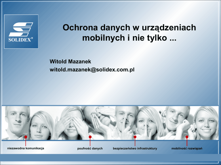Ochrona danych w urządzeniach mobilnych i nie tylko ... Witold Mazanek [email protected] niezawodna komunikacja poufność danych bezpieczeństwo infrastruktury mobilność rozwiązań Plan prezentacji • • • • • • © SOLIDEX Analiza rynku urządzeń przenośnych Oferta SOLIDEX w zakresie MDP McAfee EEPC McAfee EEFF Podsumowanie Pytania i odpowiedzi 2 Sytuacja na rynku urządzeń mobilnych Firma ubezpieczeniowa z listy Fortune 500 Posiadane urządzenia Zarejestrowane utraty W latach 2006-2009 w 2006 +49% 3127 39,000 2008 21,000 8,000 b.d. 14.9% +31% 2914 55,000 2008 38,000 7.7% 25,000 19,000 1219 59,000 2008 54,000 52,000 48,000 2.2% +5% © SOLIDEX 3 Główne zagrożenia dla danych 1 Zguba lub kradzież urządzeń mobilnych i laptopów 2 Nieautoryzowany transfer danych na urządzenia USB 3 7 Dostęp do poufnych danych przez nieautoryzowanych użytkowników 6 © SOLIDEX 4 Brak świadomości treści oraz adekwatnej akcji na pojawiające się ataki 5 Drukowanie i kopiowanie danych klientów Trudności w określeniu, zlokalizowaniu oraz ochronie poufnych danych Kradzież tajemnicy firmowej przez pracowników 4 Ochrona danych wymaga zmiany podejścia Zarządzana infrastruktura bezpieczeństwa AV Utrata informacji Włamania Phishing NAC © SOLIDEX Spam Spyware Kradzież informacji Zewnętrzne ataki HIPS 5 Ochrona danych wymaga zmiany podejścia Łatwe do zgubienia Łatwe do wysłania Atrakcyjne dla złodzieja ® $490 $147 $147 $98 Wartość na rynku “Black Market” Dane muszą być chronione niezależnie od: Użycia © SOLIDEX Miejsca Urządzenia Sposobu dostępu 6 Jeżeli nie zmienimy podejścia to ... © SOLIDEX 7 Kilka statystyk • Według Gartnera, 47% danych należących do przedsiębiorstw jest przechowywanych na urządzeniach mobilnych • 350 000 urządzeń mobilnych zostało skradzionych w ubiegłym roku • 208 000 Smartfonów 31 469 PDA 11 303 Laptopów zostało pozostawionych w taksówkach największych miast świata w przeciągu 6 miesięcy! © SOLIDEX 8 Zrozumieć ryzyko Dane mają swoją wartość $980-$4,900 Trojan do kradzieży danych finansowych $490 Nr karty kredytowej z PIN $78-$294 Dane bilingowe $147 Prawo jazdy © SOLIDEX $147 Świadectwo urodzenia $98 Nr polisy ubezpieczeniowej $6-$24 Nr karty kredytowej $6 Logon i hasło do PayPal 9 Kilka przykładów z ostatniej chwili Przykład z życia firmy... © SOLIDEX 10 Jak się chronić ?? • Dwa główne zestawy narzędzi: – Mobile Data Protection (szyfrowanie) – Data Loss/Leakage Protection (ochrona przed wyciekiem) © SOLIDEX 11 Oferta SOLIDEX w zakresie MDP • McAfee – – – – – Endpoint Encryption for PC Endpoint Encryption for Files and Folders Endpoint Encryprion for Mobile Encrypted USB Total Protection for Data Data Loss Prevention Device Control Endpoint Encryption Encrypted USB • Check Point Endpoint Security – Full Disk Encryption – Media Encryption – Total Security © SOLIDEX 12 Rodzina McAfee Endpoint Encryption Endpoint Encryption for PC’s (EEPC) • • • • • Szybki czas szyfrowania Wydajne działanie, przeźroczyste dla użytkownika Mały wpływ na wydajność całego systemu Zintegrowane z konsolą ePO mechanizmy wdrażania i raportowania Wsparcie dla kart inteligentnych, czytników biometrycznych i innych metod uwierzytelnienia Endpoint Encryption for Files & Folders (EEFF) • • • • Bez konieczności interakcji użytkownika – pełna przeźroczystość Zintegrowane z konsolą ePO mechanizmy wdrażania i raportowania Szyfrowanie zapisu na CD/DVD's Pełne szyfrowanie mediów przenośnych (removable media, USB stick) Encrypted USB • • • Pełne centralne zarządzanie przez konsolę ePO Odzyskiwanie hasła i danych Bez pozostawianiu śladu, brak problemów z kompatybilnością Endpoint Encryption for Mobile (EEM) • • © SOLIDEX Szyfrowanie urzadzeń Windows mobile, Wkrótce integracja z ePO 13 14 Architektura Endpoint Encryption Podstawowe cechy 1 Pełne, centralne zarządzanie politykami szyfrowania w środowisku heterogenicznym Administrator zabezpieczeń Serwer katalogowy firmy 2 Pojedynczy punkt zarządzania uprawnieniami użytkowników 3 Synchronizacja kont na różnych urządzeniach i oprogramowaniu Zalety architektury 1 Centralny punkt raportowania i ustalania polityki zabezpieczeń 2 Integracja z zewnętrznymi bazami użytkowników Serwer plików Terminal server 3 Możliwa zdalne implementacja patchy i rozszerzeń © SOLIDEX 14 McAfee Endpoint Encryption for PC Sectory 0-62 • Po włączeniu komputera, pierwsze startuje specjalny system operacyjny (RTOS). Wykonuje uwierzytelnienie w fazie pre-boot (PBA) za pomocą danych użytkownika hasło/token/karta inteligentna (np. certyfikat) • Niepoprawne uwierzytelnienie w fazie preboot powoduje, że właściwy system operacyjny (Windows) nie jest uruchamiany i dane pozostają zaszyfrowane © SOLIDEX Po EEPC Przed FFPC SafeBoot Boot Master Boot Record Record Akjdf;auerpoaud;ajdsf;akj sdf;ajsdf;aslkjdf;ajkdf;ajks df;akjldsf;oiquewrpquwerf a;jkdf;quiipuqwerrpuqewrp quwerpqwuerpuqweef;asj dkfposdiufqpueq;kldnffasd ifjqpuqphidpaihgqpeiytpqo iadufpquerqpiuerequepwe uirqpuerasjdurpauqpuadfa nvkqerupqueerpajdf;aknq whrpquieasjdff;akljdpqyer aydhzcvna;knqw;lkntqera oidychva;knsdg;qehtjqpou erqpfdhja;vjna;vnaq;wehtq poeruqpwdfja;kvdna;cnva; hipoqiertqpwuefadjf;acvn: vcnkapijhpqoweurqwpeur a;dnkfa;lkdfnja;djpqouerq pweura;wdjfna;fkdvmnz;v ckma;jeqpoiuerpquer;adjf EEPC.fs a;dmva;zcvmkz;klcnvgae;i hrqopweytoyghsjgnvds;lfkj s’rjtqiopaherapohdf;sjkv;sl kjdfmgwjrtpoiasiujgpzcjvm ;ajettwpouetpaoujfzkcvma ;jetpoawuertq;jaef;klamdv a;ehjitpwoeurahsasjn’l’as mfaqieurpqouera;sdjfjz;d mga;wehtpqoweaurS:Djvf; asmsdt;peutpoawiuef;adjf m;amdva;shjtpoawuetaw;j ta;dmf;asdmfpaouerpquer ;admf/;azmdfa;jetpoawuer pqauerja;dfmna/szmvz;dsj fapouera;djf;z/mv/zmga;h pwaoieutpsjdg;zsmva;pih erpqoueras;jdkf;jadfpioay hrp890ayhraq;jfd;alkjm Sector 63 Początek OS Sector xxxxxxxxx 15 Uwierzytelnienie w Endpoint Encryption © SOLI