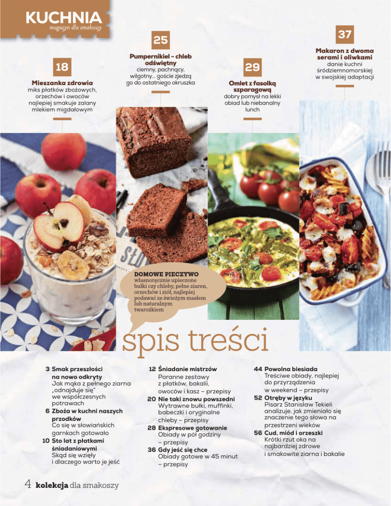 37 25 18 Mieszanka zdrowia Makaron z dwoma serami i oliwkami Pumpernikiel - chleb odświętny ciemny, pachnący, wilgotny... goście zjedzą go do ostatniego okruszka miks płatków zbożowych, orzechów i owoców najlepiej smakuje zalany mlekiem migdałowym 29 danie kuchni śródziemnomorskiej w swojskiej adaptacji Omlet z fasolką szparagową dobry pomysł na lekki obiad lub niebanalny lunch DOMOWE PIECZYWO własnoręcznie upieczone bułki czy chleby, pełne ziaren, orzechów i ziół, najlepiej podawać ze świeżym masłem lub naturalnym twarożkiem spis treści 3 Smak przeszłości na nowo odkryty Jak mąka z pełnego ziarna „odnajduje się” we współczesnych potrawach 6 Zboża w kuchni naszych przodków Co się w słowiańskich garnkach gotowało 10 Sto lat z płatkami śniadaniowymi Skąd się wzięły i dlaczego warto je jeść 4 kolekcja dla smakoszy 12 Śniadanie mistrzów Poranne zestawy z płatków, bakalii, owoców i kasz – przepisy 20 Nie taki znowu powszedni Wytrawne bułki, muffinki, babeczki i oryginalne chleby – przepisy 28 Ekspresowe gotowanie Obiady w pół godziny – przepisy 36 Gdy jeść się chce Obiady gotowe w 45 minut – przepisy 44 Powolna biesiada Treściwe obiady, najlepiej do przyrządzenia w weekend – przepisy 52 Otręby w języku Pisarz Stanisław Tekieli analizuje, jak zmieniało się znaczenie tego słowa na przestrzeni wieków 56 Cud, miód i orzeszki Krótki rzut oka na najbardziej zdrowe i smakowite ziarna i bakalie 49 Gołąbki inne niż zwykle włoska kapusta doskonale komponuje się z wędzonym boczkiem 61 90 Tarta orzechowa z twarożkiem i jabłkami Sandwicz z serkiem, ogórkiem i awokado wyśmienita na podwieczorek 71 czyli odrobina zieleni jesienią Orkiszowe batony z żurawinami i melasą słodka przekąska bez wyrzutów sumienia Zdjęcie Z dję jęcie cie na okładce: S Spor r rer Sporrer/Skowronek/ S Stoc kF kFo StockFood/Free CIASTA Z PEŁNEJ MĄKI warto spróbować czegoś nowego... smak mają niby znany, ale jednak zupełnie odmienny przepis z okładki BATONY BANANOWE M iąższ 2 dużych bananów rozgniatamy widelcem. Mieszamy ze 150 g płatków owsianych, dużą szczyptą soli, 50 g orzeszków ziemnych i łyżką cukru trzcinowego. Dodajemy po garści rodzynek i suszonej żurawiny, moreli, po pół łyżeczki cynamonu i kardamonu, 2-3 łyżki rozpuszczonego masła albo oleju kokosowego. Wyrabiamy ręcznie. Blachę wykładamy papierem do pieczenia, kładziemy warstwę (ok. 2 cm) masy, ugniatamy. Pieczemy 30 min w temp. 180˚C. Kroimy po lekkim ostudzeniu. 58 Chwila przy herbacie Mniej lub bardziej tradycyjne ciasta z dodatkiem pełnej mąki i kasz – przepisy 68 Niepozorne skarby – otręby i zarodki Co to jest i z czym to się je? 70 Batony pełne energii Przekąski z rozmaitych ziaren, płatków i bakalii – przepisy 78 Mini do schrupania Ciasteczka z pełnej mąki z dodatkiem dyni, słonecznika i innych ciekawych dodatków 86 A wieczorem małe co nieco Smaczne kolacje, które nie pójdą w biodra – przepisy 94 Butik Użyteczne gadżety do przygotowywania, przechowywania i podawania 98 Stopka redakcyjna kolekcja dla smakoszy 5