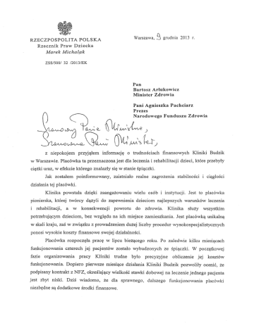 RZECZPOSPOLITA POLSKA Rzecznik Praw Dziecka Marek Michalak Warszawa, J grudnia 2013 L ZSS/500! 32 /2013/EK Pan Bartosz Arltkowicz Minister Zdrowia Pani Agniesźka Pachciarz Prezes Narodowego Funduszu Zdrowia z niepokojem przyjąłem informację o trudnościach finansowych Kliniki Budzik w Warszawie. Placówka ta przeznaczonajest dla leczenia i rehabilitacji dzieci, które przebyły ciężki uraz w efekcie którego znalazły się w stanie śpiączki. Jak zostałem poinformowany, zaistniało realne zagrożenia stabilności i ciągłości działania tej placówki. Klinika powstała dzięki zaangażowaniu wielu osób i instytucji. Jest to placówka pionierska, której twórcy dążyli do zapewnienia dzieciom najlepszych warunków leczenia i rehabilitacji, a w konsekwencji powrotu do zdrowia. Klinika służy wszystkim potrzebującym dzieciom, bez względu na ich miejsce zamieszkania. Jest placówką unikalną w skali kraju, zaś w związku z prowadzeniem dużej liczby procedur wysokospecjalistycznych ponosi wysokie koszty finansowe swojej działalności. Placówka rozpoczęła pracę w lipcu bieżącego roku. Po zaledwie kilku miesiącach funkcjonowania czterech jej pacjentów zostało wybudzonych ze śpiączki. W początkowej fazie organizowania pracy Kłiniki trudne było precyzyjne obliczenie jej kosztów funkcjonowania. Dopiero pierwsze miesiące dźiałania Kliniki Budzik pozwoliły ocenić, że podpisany kontrakt z NFZ, określający wielkość stawki dobowej na leczenie jednego pacjenta jest zbyt niski. Dziś wiadomo, że dla sprawnego, dalszego funkcjonowania placówki niezbędne są dodatkowe środki finansowe. Szczegółowe wyjaśnienia dotyczące przyczyn obecnych trudności funkcjonowania Kliniki Budzik zostały przedstawione członkom sejmowej Komisji Zdrowia 21 listopada 2013 r. Wynika z nich, że jeżeli nie nastąpi podwyższenie poziomu frnansowania Kliniki ze środków publicznych, placówce grozi zapaść finansowa, a w konsekwencji zagrożenie dalszego funkcjonowania. Byłaby to ogronana strata przede wszystkim dla dzieci, potrzebujących specjalistycznej pomocy i leczenia oraz zniweczenie ogromnego potencjału społecznego uruchomionego podczas tworzenia placówki. Wyrażam przekonanie, że to na nas, dorosłych, ciąży obowiązek dołożenia wszelkich starań, by ta unikalna w skali kraju placówka mogła się rozwijać, wykorzystując osiągnięcia współczesnej medycyny dla przywracania dzieciom zdrowia, a rodzicom nadziei i wiary w solidarność ludzką. Działając na podstawie art. 10 a ustawy z dnia 6 stycznia 2000 r. o Rzeczniku Praw Dziecka ( Dz. U. Nr 6, poz. 69 z późn. zm.) zwracam się o pilne rozpoznanie przedstawionego problemu oraz podjęcie działań zaradczych pozwalających na dalszą pracę Kliniki Budzik. / N”Z 7dowego Funduszu Zdrowia znak: NFZ/CF/DSOZ/20 1 3/073AO9O/W/ Lf?,/ /DRM 0 Warszawa, dnia „1.i2 2013 r. Pan Marek Michalak Rzecznik Praw Dziecka W odpowiedzi na pismo z dnia 9 grudnia 2013 r. znak: ZSS/500/32/2013/EK, dotyczące trudności finansowych Kliniki „Budzik” w Warszawie, uprzejmie proszę o przyjęcie następującej informacji w sprawie. W związku z aneksowaniem, przez Mazowiecki 0W NFZ, umów o udzielanie świadczeń opieki zdrowotnej, w dniu 9 grudnia 2013 r. została ustalona nowa wyższa stawka za jednostkę rozliczeniową dla świadczeniodawcy realizującego program zdrowotny — leczenie dzieci ze śpiączką. Nowa cena za punkt została zaakceptowana przez świadczeniodawcę, tak więc należy założyć, że powyższe ustalenia, przyczynią się do rozwiązania problemów poruszanych przez Pana w piśmie. Q www.nfz.goy.pI Narodowy Fundusz Zdrowia, ul. Grójecka 186, 02-390 Warszawa sekretariat tel. 022 572 60 13, fax 022 572 63 30 OVĄ\AI O 2. 01, 2014 Warszawa, MINISTER ZDROWIA MZ-MD-P-075-4895-l/KC!l 3 Pan Marek Michalak Rzecznik Praw Dziecka W odpowiedzi na pismo z dnia 9 grudnia br. znak: ZSS!500/32/20 1 3!EK skierowane do Ministra Zdrowia, dotyczące trudności Kliniki Budzik iż ak już zapewne Pan wie, sprawa zmiany \y Warszawie uprzejmie informuję, kontraktowania świadczeń zdrowotnych realizowanych przez Klinikę Budzik. pozostąjąca w kompetencji Narodowego Funduszu Zdrowia, zakończyła się satysfakcjonująco dla Kliniki i tym samym, umożliwila dalsze sprawne jej funkcjonowanie. — Z %1INIS. OWlA PoDS: kRZ STANU dJis J Warszawa 2014 -01- 07 . MINISTER ZDROWIA MZ-OZG-50-34299-2/JCM/1 3 Pan Marek Michalak Rzecznik Praw Dziecka jpe? W odpowiedzi na pismo z dnia 16 grudnia 2013 r., znak: ZSS/500/32/2013/EK, w sprawie trudności flnansowych „Kliniki Budzik” w Warszawie, uprzejmie informuję, iż wychodząc naprzeciw oczekiwaniom .„Kliniki”, w dniu 9 grudnia 2013 r., Dyrektor Mazowieckiego Oddziału Narodowego Funduszu Zdrowia, podpisał aneks do urnowy o udzielanie świadczeń opieki zdrowotnej, który uwzględnia apel „Kliniki”. Przyjęte rozwiązanie, wydąje się być satysfakcjonuj ące dla „Kliniki Budzik”. Z upow ienia Sławomir /Vewnmw