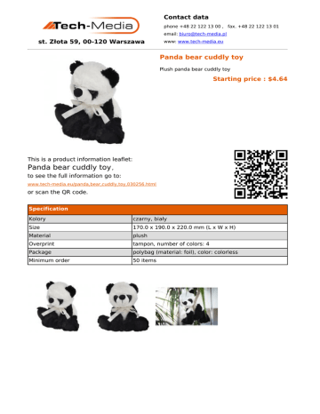 Contact data phone +48 22 122 13 00 , fax. +48 22 122 13 01 email: [email protected] st. Złota 59, 00-120 Warszawa www: www.tech-media.eu Panda bear cuddly toy Plush panda bear cuddly toy Starting price : $4.64 This is a product information leaflet: Panda bear cuddly toy , to see the full information go to: www.tech-media.eu/panda,bear,cuddly,toy,030256.html or scan the QR code. Specification Kolory czarny, biały Size 170.0 x 190.0 x 220.0 mm (L x W x H) Material plush Overprint tampon, number of colors: 4 Package polybag (material: foil), color: colorless Minimum order 50 items