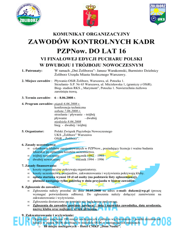 KOMUNIKAT ORGANIZACYJNY ZAWODÓW KONTROLNYCH KADR PZPNow. DO LAT 16 VI FINAŁOWEJ EDYCJI PUCHARU POLSKI W DWUBOJU I TRÓJBOJU NOWOCZESNYM 1. Patronaty: W ramach „Dni śoliborza”- Janusz Warakomski, Burmistrz Dzielnicy śoliborz Urzędu Miasta Stołecznego Warszawy. 2. Miejsce zawodów : Pływanie-OSiR śoliborz, Warszawa, ul. Potocka 1. Strzelanie- S.P. Nr 65 Warszawa, ul. Mścisławska 1, (graniczy z OSiR). Bieg- stadion RKS „ Marymont”, Potocka 1. Nawierzchnia ŜuŜlowa zarośnięta trawą. 3. Termin zawodów: 6 – 8.06.2008 r. 4. Program zawodów: piątek 6.06.2008 r. konferencja techniczna sobota 7.06.2008 r. strzelanie / pływanie - trójbój pływanie - dwubój niedziela 8.06.2008 bieg - dwubój / trójbój 5. Organizator: Polski Związek Pięcioboju Nowoczesnego UKS „śoliborz” Warszawa OSiR „ śoliborz”. 6. Zasady uczestnictwa: • członkowie klubów zarejestrowanych w PZPNow., posiadający licencje i waŜne badania lekarskie po opłaceniu kosztów uczestnictwa. • trójbój nowoczesny rocznik 1992 – 1993 • dwubój nowoczesny rocznik 1994 – 1996 7. Zasady finansowania: • koszty organizacyjne pokrywają organizatorzy. • koszty uczestnictwa, przejazdów, zakwaterowania i wyŜywienia pokrywają kluby. • opłata startowa wynosi 10 zł od osoby (na podstawie listy zgłoszeniowej). • płatność następuje tylko gotówką w dniu przyjazdu w biurze zawodów. 8. Zgłoszenie do zawodów: • Zgłoszenia naleŜy przesłać do dnia 30.05.2008 na adres e-mail: [email protected] (proszę wymagać potwierdzenia odbioru). Do zgłoszenia naleŜy dołączyć zamówienie na zakwaterowanie i wyŜywienie. • Zgłoszenia dostarczone po terminie nie będą brane pod uwagę. • Zgłoszenia do zawodów powinny zawierać : imię i nazwisko zawodnika, datę urodzenia, nazwę klubu oraz najlepszy wynik pływania, 9. Zakwaterowanie i wyŜywienie: • Organizator zapewnia 190 miejsc noclegowych z pełnym wyŜywieniem- 3 posiłki dziennie od kolacji w piątek 06.06 do obiadu w niedzielę 08.06 w następujących miejscach: o 88 miejsc noclegowych – Hotel CMKP „Dom Nauki”. • • • • • • • 01–828 Warszawa, ul. Schroegera 82, tel. (22) 560-10-16, fax.(22) 560-10-02, Zakwaterowanie: pokoje 1, 2, 3 osobowe z umywalką. Zakwaterowanie i wyŜywienie 90 zł/osoba/doba o 70 miejsc noclegowych- Hotel CWKS Legia. 01-728 Warszawa, Powązkowska 59, tel. (22) 532-12-08 Zakwaterowanie: pokoje 1, 2, 3 osobowe z węzłem sanitarnym. Zakwaterowanie i wyŜywienie 100zł/osoba/doba o 32 miejsca noclegowe – Hotel ” MEKSYK”. 01-813 Warszawa, Marymoncka 34, tel. (22) 834-62-10 Zakwaterowanie: pokoje 1, 2, 3 osobowe z węzłem sanitarnym. Zakwaterowanie i wyŜywienie 120 zł/osoba/doba Śniadania i kolacje w miejscach zakwaterowania. Obiady w sobotę 7 czerwca i w niedzielę 8 czerwca w Pizzerii „ Parma” na pływalni przy ul. Potockiej 1. Rezerwacji naleŜy dokonać przesyłając zamówienie na zakwaterowanie i wyŜywienie wraz ze zgłoszeniem do zawodów do dnia 30.05.2008 na adres e-mail: [email protected] (proszę wymagać potwierdzenia odbioru), w zamówieniu naleŜy podać ilość oraz płeć osób korzystających z noclegów i wyŜywienia. Formularz w załączeniu. Organizator pośredniczy w zabezpieczeniu noclegów i wyŜywienia we wskazanych miejscach. Decyduje kolejność zamówień. Zamówienia dostarczone po terminie nie będą brane pod uwagę. O miejscu zakwaterowania decyduje organizator w miarę posiadanych moŜliwości. Informacja o miejscu zakwaterowania zostanie przesłana zwrotnie wraz z programem minutowym zawodów do dnia 5 czewca. Opłata za zakwaterowanie i wyŜywienie na podstawie zamówień w biurze zawodów w dniu przyjazdu – gotówką. 10. Biuro zawodów: • W CMKP przy ul. Schroegera 82 dnia 6 czerwca w godzinach od 18.00 do 20.30. • W Biurze UKS śoliborz przy ul. Potockiej 1 w czasie trwania zawodów. 11. Nagrody: VI Edycja Pucharu Polski klasyfikacja indywidualna: • Trzy pierwsze zawodniczki i trzech pierwszych zawodników w dwuboju i trójboju otrzymuje puchary. • 10 pierwszych zawodniczek i zawodników w dwuboju i trójboju otrzymuje dyplomy. • Najlepsza zawodniczka i zawodnik z „śoliborza” w dwuboju i trójboju otrzymuje puchar. • Najlepsza zawodniczka i zawodnik z rocznika 1996 otrzymuje puchar. • Zwycięzcy poszczególnych konkurencji w dwuboju i trójboju otrzymują puchary. • Trzy najlepsze Kluby w klasyfikacji VI edycji w dwuboju, trójboju i łącznej otrzymują puchary. Klasyfikacja Pucharu Polski 2008. • Trzy pierwsze zawodniczki i trzech pierwszych zawodników w dwuboju i trójboju otrzymuje puchary. • 10 pierwszych zawodniczek i zawodników w dwuboju i trójboju otrzymuje dyplomy. • Puchar Przechodni PZPnow. otrzymuje klub, który zgromadził najwięcej punktów w klasyfikacji łącznej roku 2008 w dwuboju i trójboju. • Trzy najlepsze kluby w klasyfikacji roku 2008 w dwuboju, trójboju i łącznej otrzymują puchary. 12. Uwagi: • Konferencja techniczna odbędzie się 6 czerwca o godzinie 20.00 w CMKP przy ul. Schroegera 82. • Organizator nie zapewnia transportu w mieście. • Minutowy program zawodów oraz lista startowa zostaną przygotowane na podstawie zgłoszeń. Zamówienie zakwaterowania i wyŜywienia Nazwa Klubu Data 6.06.2008r. 7.06.2008r. K Zawodnicy M K Trenerzy M K Pozostałe osoby M K Razem M Łącznie K+M Osoba odpowiedzialna Imię Nazwisko Kontakt 8.06.2008r.