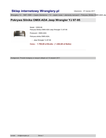 Sklep internetowy Wranglery.pl Utworzono : 07 marzec 2017 Wranglery YJ - 1987-1995 > Części Zamienne > YJ - części nowe > elementy karoserii > Pokrywa Silnika OMIX-ADA Jee Pokrywa Silnika OMIX-ADA Jeep Wrangler YJ 87-95 Model : 12003.06 Pokrywa Silnika OMIX-ADA Jeep Wrangler YJ 87-95 Producent : OMIX-ADA Pokrywa silnika OMIX-ADA. � Jeep Wrangler YJ 87-95 Cena : 1.799,00 zł Brutto ( 1.462,60 zł Netto) Dostępność: Produkt dostępny w naszym sklepie od 14 sierpień 2011 kontakt : - [email protected] Strona 1