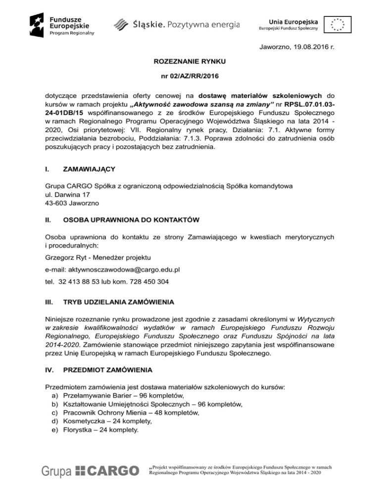 Jaworzno, 19.08.2016 r. ROZEZNANIE RYNKU nr 02/AZ/RR/2016 dotyczące przedstawienia oferty cenowej na dostawę materiałów szkoleniowych do kursów w ramach projektu „Aktywność zawodowa szansą na zmiany” nr RPSL.07.01.0324-01DB/15 współfinansowanego z ze środków Europejskiego Funduszu Społecznego w ramach Regionalnego Programu Operacyjnego Województwa Śląskiego na lata 2014 2020, Osi priorytetowej: VII. Regionalny rynek pracy, Działania: 7.1. Aktywne formy przeciwdziałania bezrobociu, Poddziałania: 7.1.3. Poprawa zdolności do zatrudnienia osób poszukujących pracy i pozostających bez zatrudnienia. I. ZAMAWIAJĄCY Grupa CARGO Spółka z ograniczoną odpowiedzialnością Spółka komandytowa ul. Darwina 17 43-603 Jaworzno II. OSOBA UPRAWNIONA DO KONTAKTÓW Osoba uprawniona do kontaktu ze strony Zamawiającego w kwestiach merytorycznych i proceduralnych: Grzegorz Ryt - Menedżer projektu e-mail: [email protected] tel. 32 413 88 53 lub kom. 728 450 304 III. TRYB UDZIELANIA ZAMÓWIENIA Niniejsze rozeznanie rynku prowadzone jest zgodnie z zasadami określonymi w Wytycznych w zakresie kwalifikowalności wydatków w ramach Europejskiego Funduszu Rozwoju Regionalnego, Europejskiego Funduszu Społecznego oraz Funduszu Spójności na lata 2014-2020. Zamówienie stanowiące przedmiot niniejszego zapytania jest współfinansowane przez Unię Europejską w ramach Europejskiego Funduszu Społecznego. IV. PRZEDMIOT ZAMÓWIENIA Przedmiotem zamówienia jest dostawa materiałów szkoleniowych do kursów: a) Przełamywanie Barier – 96 kompletów, b) Kształtowanie Umiejętności Społecznych – 96 kompletów, c) Pracownik Ochrony Mienia – 48 kompletów, d) Kosmetyczka – 24 komplety, e) Florystka – 24 komplety. „Projekt współfinansowany ze środków Europejskiego Funduszu Społecznego w ramach Regionalnego Programu Operacyjnego Województwa Śląskiego na lata 2014 - 2020 W skład materiałów szkoleniowych powinny wchodzić: Materiały na warsztaty (podpunkty a i b): podręcznik / skrypt z zakresu szkolenia, notes A5 / zeszyt 32 kart., długopis; Materiały na kurs zawodowy: o Pracownik Ochrony Mienia: podręcznik z zakresu szkolenia, notes A4 / zeszyt 64 kart., długopis, o Kosmetyczka: podręcznik z zakresu szkolenia, notes A4 /zeszyt 64 kart., długopis, o Florystka: podręcznik z zakresu szkolenia, notes A4 /zeszyt 64 kart., długopis. TERMIN REALIZACJI ZAMÓWIENIA V. Materiały szkoleniowe będą dostarczane sukcesywnie w terminach określonych przez Zamawiającego, w okresie od września 2016 r. do czerwca 2017 r. Dokładne terminy dostawy oraz ilości materiałów będą podane przez Zamawiającego po zrekrutowaniu uczestników i ustaleniu harmonogramów szkoleń. . VI. WYMAGANIA DOTYCZĄCE SPORZĄDZENIA OFERTY Oferta musi zawierać cenę jednostkową brutto (za 1 komplet materiałów) oraz wartość brutto zamówienia. VII. FORMA, TERMIN I MIEJSCE SKŁADANIA OFERT 1. Składana oferta powinna zawierać informacje wskazane w załączniku 1 oraz 2. 2. Ofertę należy przesłać w formie pisemnej lub elektronicznej na adres: Grupa CARGO Spółka z ograniczoną odpowiedzialnością Spółka komandytowa ul. Darwina 17 43-603 Jaworzno [email protected] 3. Termin: ofertę proszę przesłać najpóźniej do dnia 26.08.2016 r VIII. KRYTERIA WYBORU OFERTY W postępowaniu przedmiotowym przy wyborze najkorzystniejszej oferty Zamawiający będzie brał pod uwagę cenę oferty. …………………………. Menedżer Projektu „Projekt współfinansowany ze środków Europejskiego Funduszu Społecznego w ramach Regionalnego Programu Operacyjnego Województwa Śląskiego na lata 2014 - 2020 Załącznik 1 FORMULARZ OFERTOWY Rozeznanie rynku nr 02/AZ/RR/2016 Oferuję wykonanie przedmiotu zamówienia w pełnym rzeczowym zakresie, zgodnie z wymogami opisu przedmiotu zamówienia zawartym w pkt IV w następującej cenie: Nazwa Liczba materiałów (kpl.) Cena jednostkowa brutto (za komplet materiałów szkoleniowych) - PLN Wartość brutto PLN (2 x 3) 1 2 3 4 Dostawa materiałów szkoleniowych do kursów Przełamywanie Barier 96 Dostawa materiałów szkoleniowych do kursów Kształtowanie Umiejętności Społecznych 96 Dostawa materiałów szkoleniowych do kursu – Pracownik Ochrony Mienia 48 Dostawa materiałów szkoleniowych do kursu - Kosmetyczka 24 Dostawa materiałów szkoleniowych do kursu - Florystka 24 UWAGI Oferenta (nieobligatoryjne): …………………………………….…………………………………………………………………… …………………………………….…………………………………………………………………… Pieczątka Oferenta Dane Oferenta do kontaktu: Adres................................................................ Tel./fax.............................................................. e-mail:............................................................... osoba wyznaczona do kontaktu:……………… ……………………….…………………………… …………………………………… Miejscowość i data …………………………..……… Podpis osoby upoważnionej „Projekt współfinansowany ze środków Europejskiego Funduszu Społecznego w ramach Regionalnego Programu Operacyjnego Województwa Śląskiego na lata 2014 - 2020 Załącznik 2 OŚWIADCZENIE Rozeznanie rynku nr 02/AZ/RR/2016 Oświadczam, iż posiadam wymagane polskim prawem uprawnienia do realizacji przedmiotu rozeznania rynku oraz posiadam wiedzę, potencjał kadrowy i techniczny do realizacji usług dostaw materiałów szkoleniowych, stanowiących przedmiot niniejszego rozeznania rynku. ………………………………………… Miejscowość i data ………………………………… Podpis osoby upoważnionej ……………………………….. Pieczęć firmowa „Projekt współfinansowany ze środków Europejskiego Funduszu Społecznego w ramach Regionalnego Programu Operacyjnego Wojewó