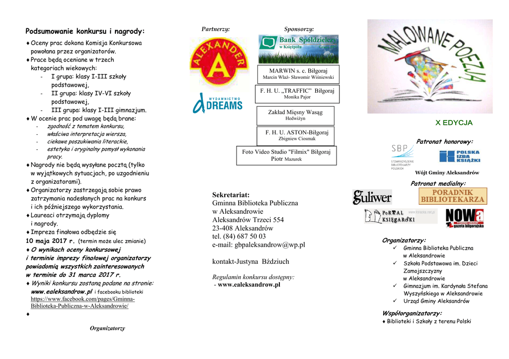 Podsumowanie konkursu i nagrody: ♦ Oceny prac dokona Komisja Konkursowa powołana przez organizatorów. ♦ Prace będą oceniane w trzech kategoriach wiekowych: - I grupa: klasy I-III szkoły podstawowej, - II grupa: klasy IV-VI szkoły podstawowej, - III grupa: klasy I-III gimnazjum. ♦ W ocenie prac pod uwagę będą brane: zgodność z tematem konkursu, właściwa interpretacja wiersza, ciekawe poszukiwania literackie, estetyka i oryginalny pomysł wykonania pracy. ♦ Nagrody nie będą wysyłane pocztą (tylko w wyjątkowych sytuacjach, po uzgodnieniu z organizatorami). ♦ Organizatorzy zastrzegają sobie prawo zatrzymania nadesłanych prac na konkurs i ich późniejszego wykorzystania. ♦ Laureaci otrzymają dyplomy i nagrody. ♦ Impreza finałowa odbędzie się 10 maja 2017 r. (termin może ulec zmianie) ♦ O wynikach oceny konkursowej i terminie imprezy finałowej organizatorzy powiadomią wszystkich zainteresowanych w terminie do 31 marca 2017 r. ♦ Wyniki konkursu zostaną podane na stronie: www.ealeksandrow.pl i facebooku biblioteki https://www.facebook.com/pages/GminnaBiblioteka-Publiczna-w-Aleksandrowie/ ♦ Partnerzy: Sponsorzy: MARWIN s. c. Biłgoraj Marcin Wlaź- Sławomir Wiśniewski F. H. U. „TRAFFIC” Biłgoraj Monika Pajor REGULAMIN Zakład Mięsny Wasąg Hedwiżyn F. H. U. ASTON-Biłgoraj Zbigniew Ciosmak Patronat honorowy: Foto Video Studio "Filmix" Biłgoraj Piotr Mazurek Wójt Gminy Aleksandrów Patronat medialny: Sekretariat: Gminna Biblioteka Publiczna w Aleksandrowie Aleksandrów Trzeci 554 23-408 Aleksandrów tel. (84) 687 50 03 e-mail: [email protected] kontakt-Justyna Bździuch Regulamin konkursu dostępny: - www.ealeksandrow.pl Organizatorzy: Gminna Biblioteka Publiczna w Aleksandrowie Szkoła Podstawowa im. Dzieci Zamojszczyzny w Aleksandrowie Gimnazjum im. Kardynała Stefana Wyszyńskiego w Aleksandrowie Urząd Gminy Aleksandrów Współorganizatorzy: ♦ Biblioteki i Szkoły z terenu Polski Organizatorzy Uczestnicy konkursu: ♦ Uczniowie ze szkół podstawowych i gimnazjalnych z terenu Polski Cele konkursu: ♦ stworzenie dzieciom i młodzieży możliwości zaprezentowania własnego odbioru poezji poprzez pracę plastyczną, ♦ popularyzacja poezji polskiej, ♦ promowanie czytelnictwa, ♦ uwrażliwienie dzieci i młodzieży na literaturę oraz sztukę. Zadanie konkursowe: Poezja otwiera przed nami świat doznań i wzruszeń. Czytajmy, więc! Zapraszamy Was do czytania, ale również do wyrażania swoich odczuć poprzez pracę plastyczną. Należy wykonać pracę plastyczną inspirowaną wybranym wierszem z literatury polskiej. ( może to być obraz realistyczny, symboliczny, pokazanie nastroju wiersza itp.). Temat konkursu plastycznego: − „Malowane poezją” Technika wykonania pracy: − dowolna Format pracy: − A4 lub A3 (Nie należy oprawiać prac w passe-partout) Założenia organizacyjne: ♦ Odwrót pracy i wiersz (przytwierdzony do odwrotu pracy), powinny być opatrzone godłem. Należy także dołączyć (najlepiej przypiąć spinaczem) do pracy zaklejoną kopertę opatrzoną tym samym godłem z następującymi informacjami wg. wzoru: - imię i nazwisko autora, - klasa, - nazwa szkoły, - adres instytucji, - e-mail, - telefon kontaktowy, - imię i nazwisko opiekuna, - tytuł wiersza oraz imię i nazwisko autora wiersza. ♦ Pracę plastyczną z dołączonym tekstem wiersza (tytuł oraz imię i nazwisko autora) i kopertą należy składać lub nadsyłać w terminie od 02 X 2016 r. do 22 XII 2016 r. ♦ Prace należy nadsyłać na adres: Gminna Biblioteka Publiczna w Aleksandrowie Aleksandrów Trzeci 554 23-408 Aleksandrów Prace nie będą odsyłane Uczestnictwo w konkursie jest jednoznaczne z wyrażeniem zgody na przetwarzanie przez Gminną Bibliotekę Publiczną w Aleksandrowie danych osobowych wyłącznie na potrzeby konkursu w zakresie koniecznym do jego prawidłowego przeprowadzenia (Ustawa o ochronie danych osobowych z dn. 29 sierpnia 1997 roku Dz. U. nr 133, poz. 833 z późn. zm.). Gminna Biblioteka Publiczna w Aleksandrowie zastrzega sobie prawo do bezpłatnego eksponowania, publikowania oraz powielania prac, które wpłynęły na konkurs. Jeżeli w toku trwania konkursu lub po jego zakończeniu okaże się, że uczestnik nie jest autorem nadesłanej pracy opiekun prawny uczestnika ponosić będzie odpowiedzialność za spowodowaną szkodę. Przystąpienie do konkursu oznacza jednocześnie akceptację warunków regulaminu.